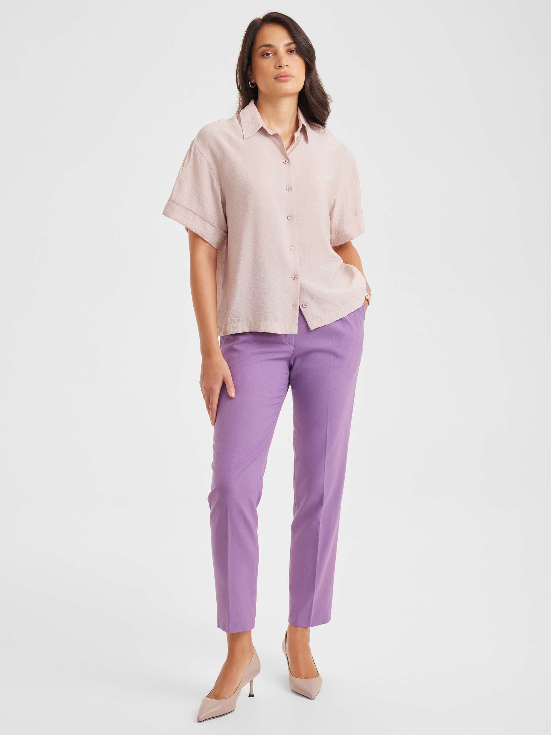 Укороченная блузка SINAR прямого силуэта в нежно-розовом оттенке выглядит свежо и лёгко, создавая воздушный летний образ. Короткие рукава и дышащая ткань обеспечивают комфорт в жаркую погоду, делая модель идеальной для прогулок и повседневных летних сочетаний.