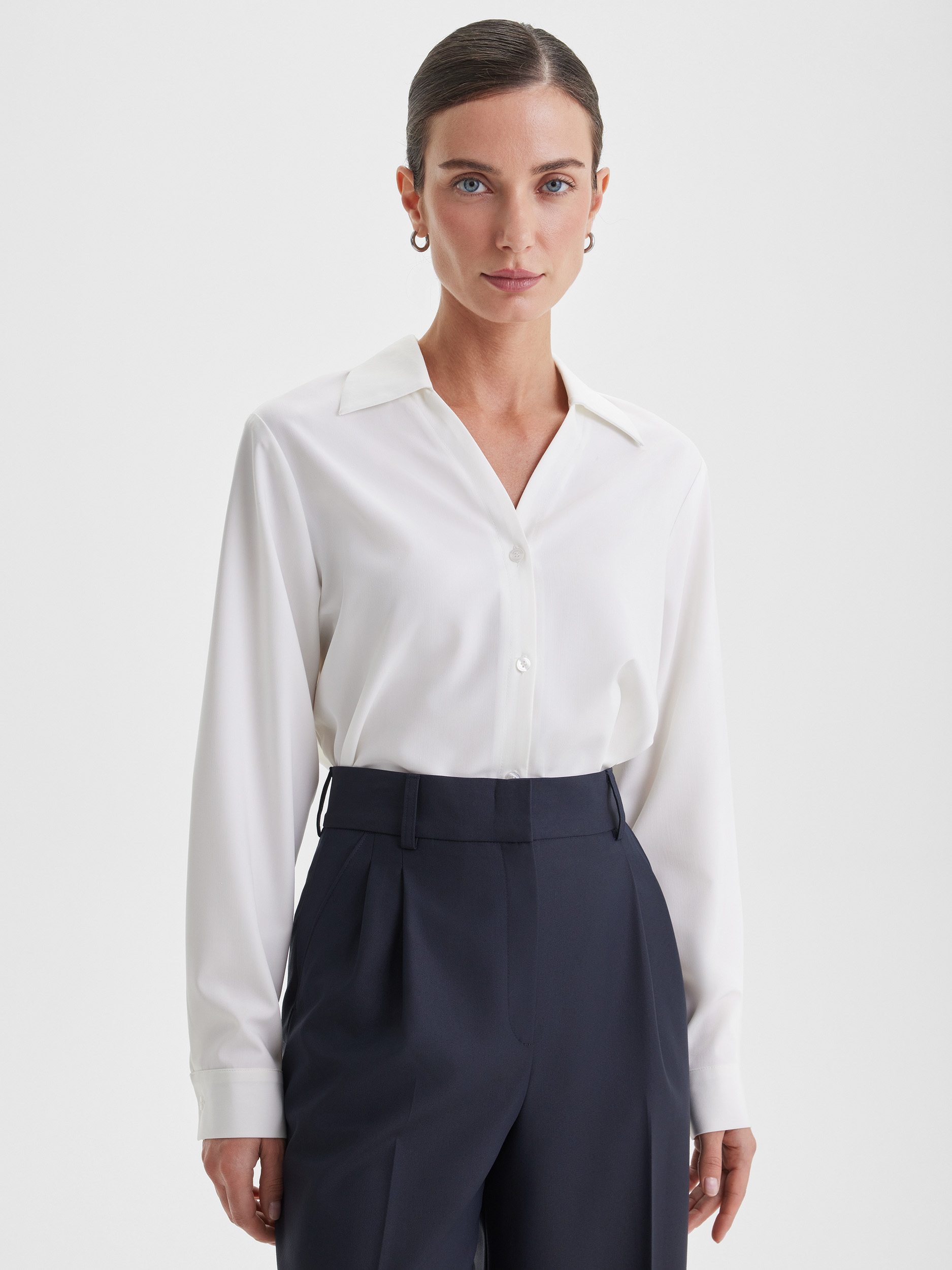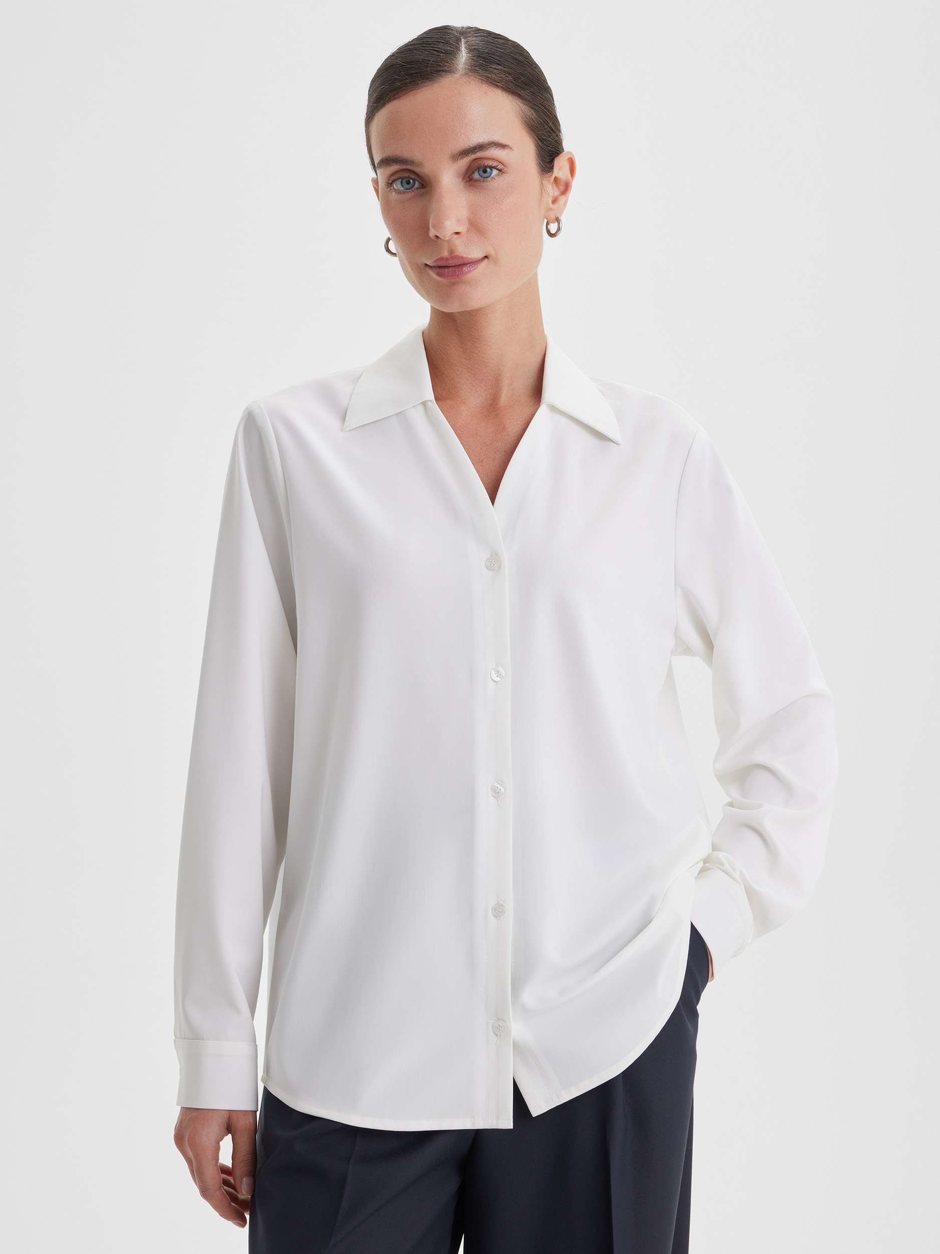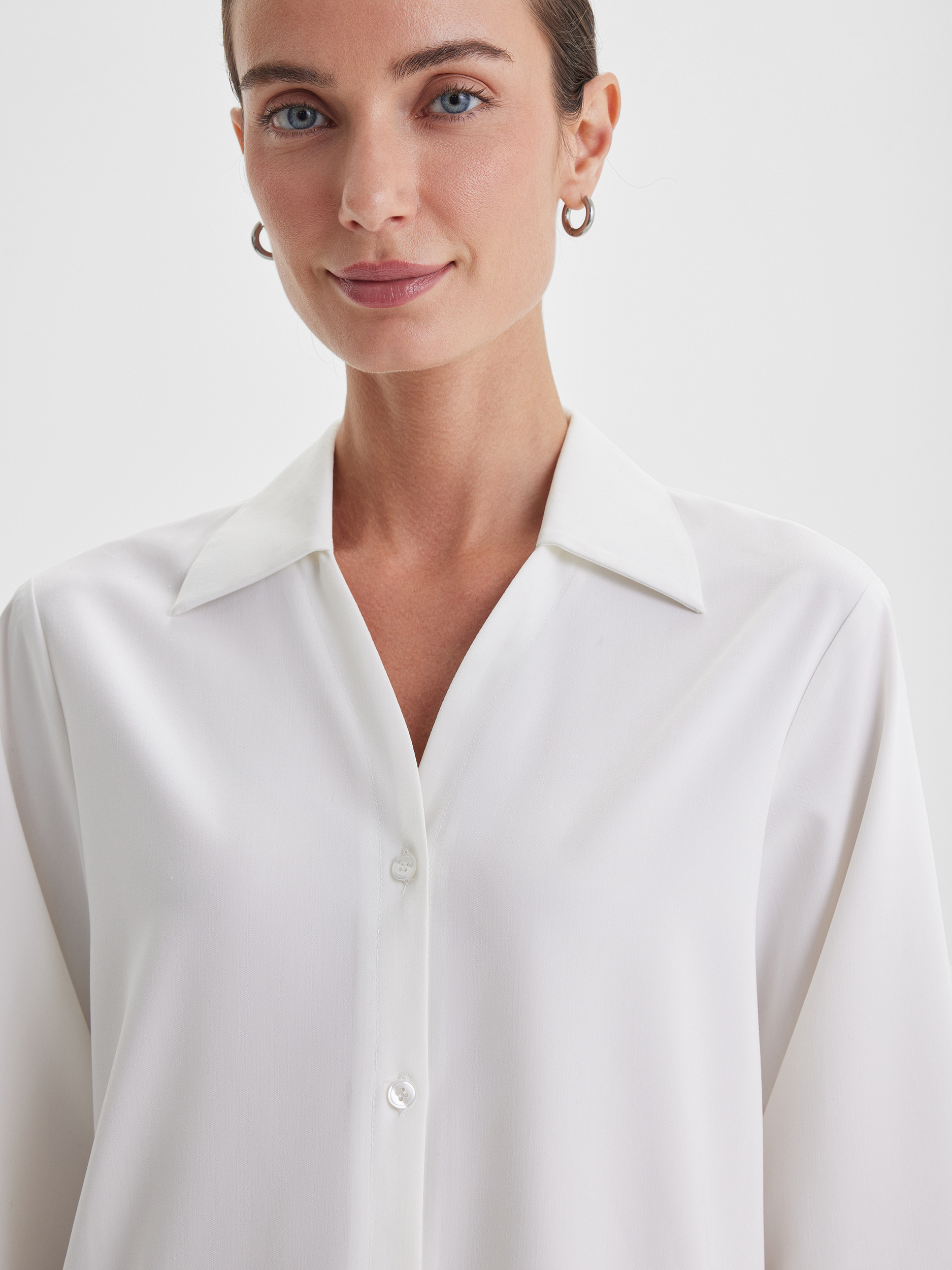 Блузка с V-образным вырезом и застёжкой на пуговицы — универсальная классика, которая гармонично дополнит любой костюм. Белый цвет придаёт образу свежесть и лёгкость, а лаконичный крой делает модель подходящей как для офиса, так и для повседневных комбинаций.