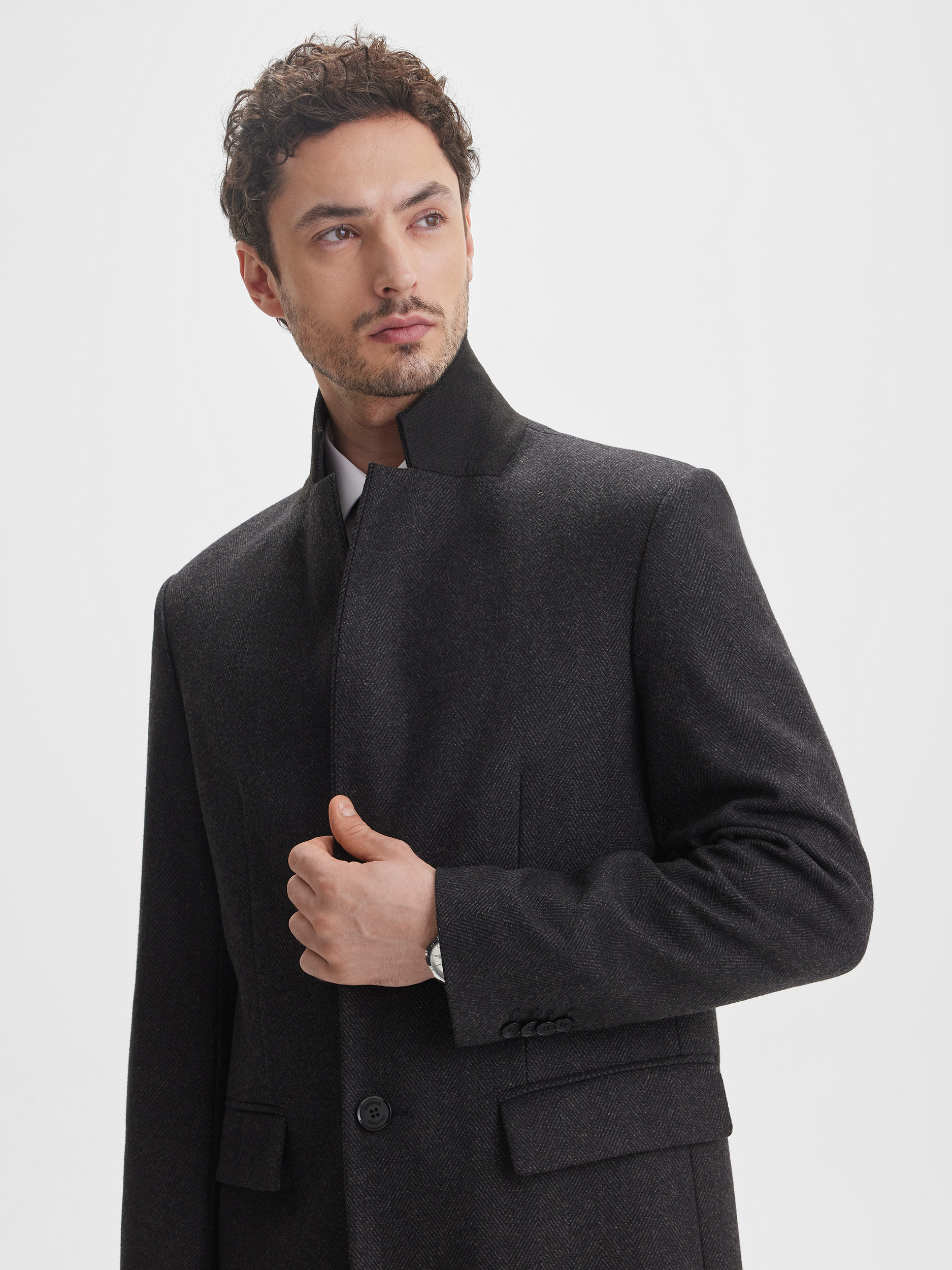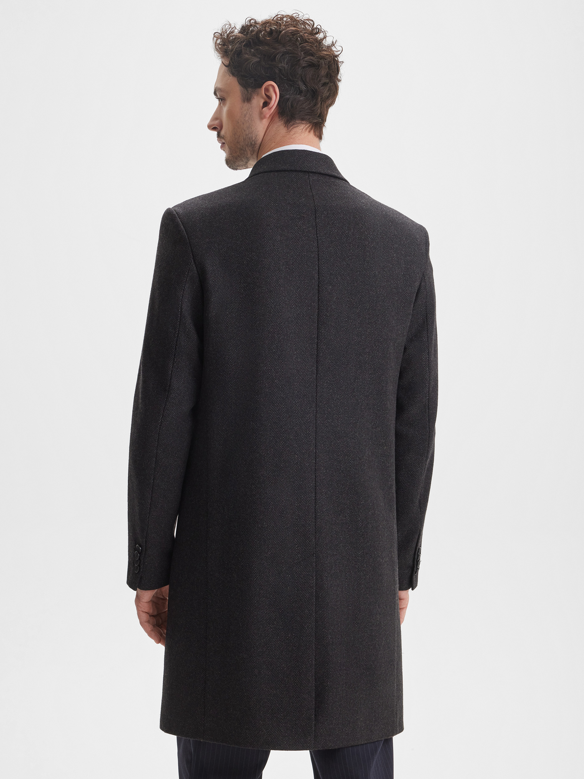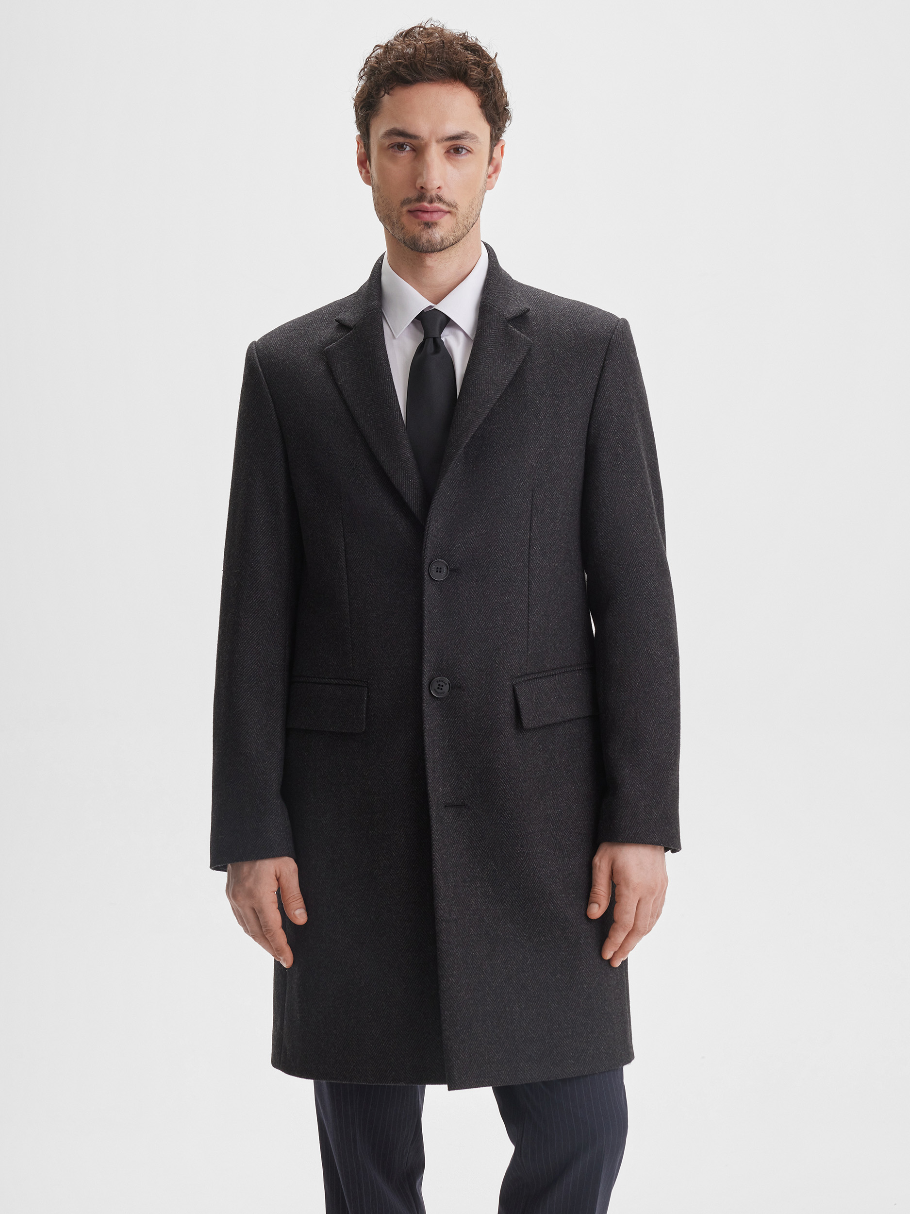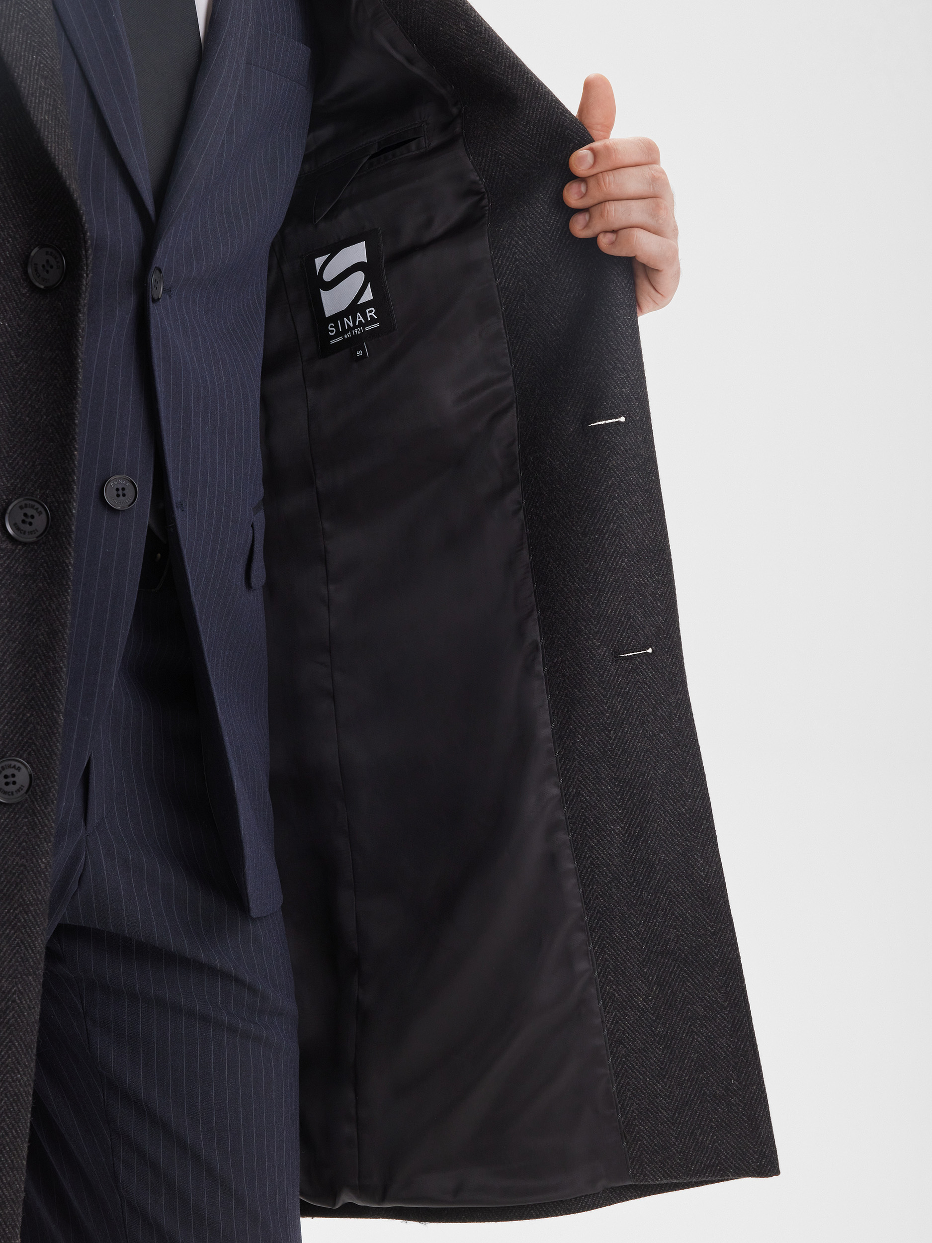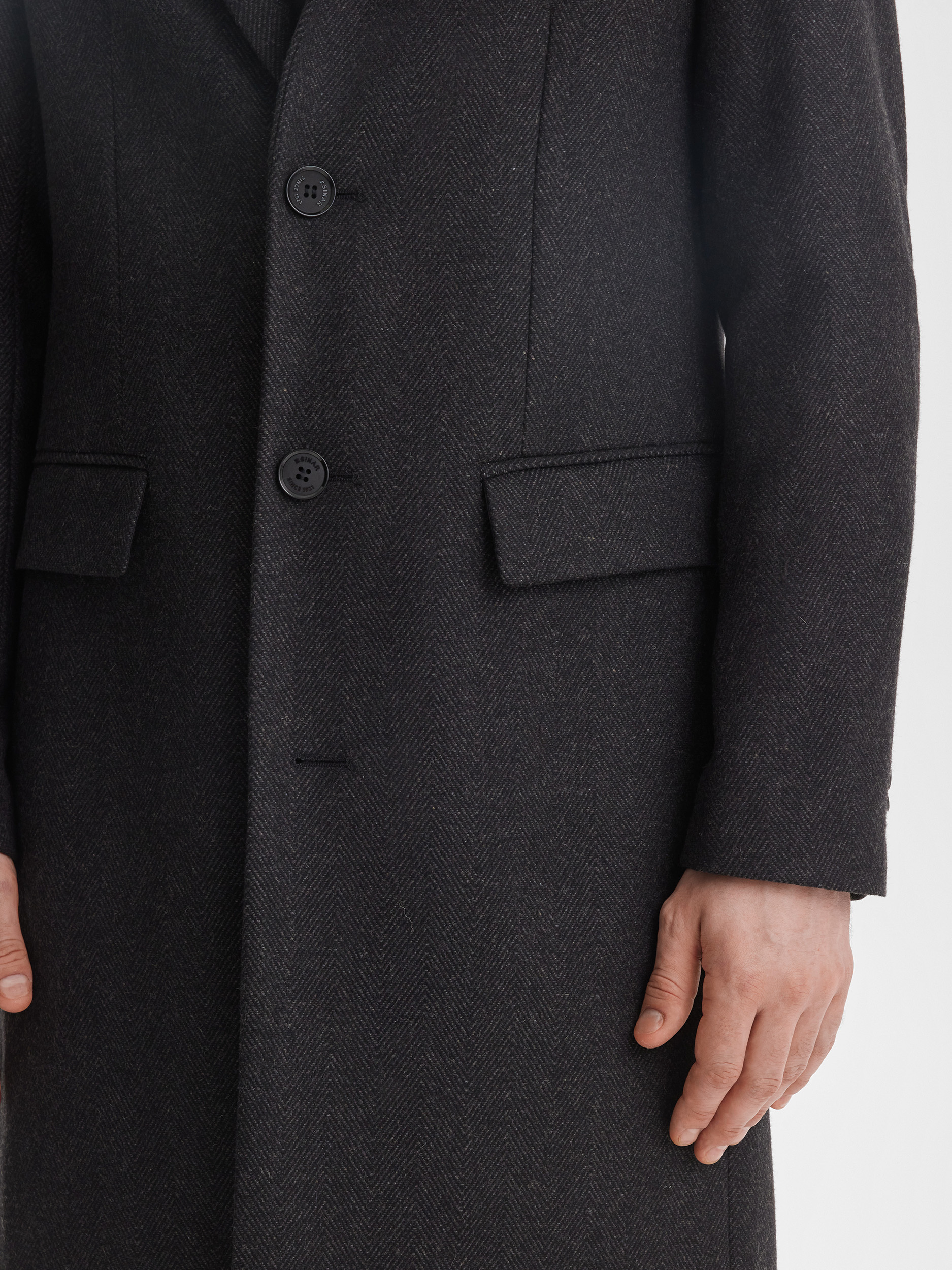 Мужское приталенное пальто SINAR выполнено в тёмно-сером цвете с узором «ёлочка», создавая современный и аккуратный образ. Ткань с содержанием шерсти обеспечивает комфорт, тепло и долговечность, позволяя пальто сохранять форму и аккуратный вид на протяжении многих сезонов. Однобортная застёжка подчёркивает строгий и стильный характер модели.