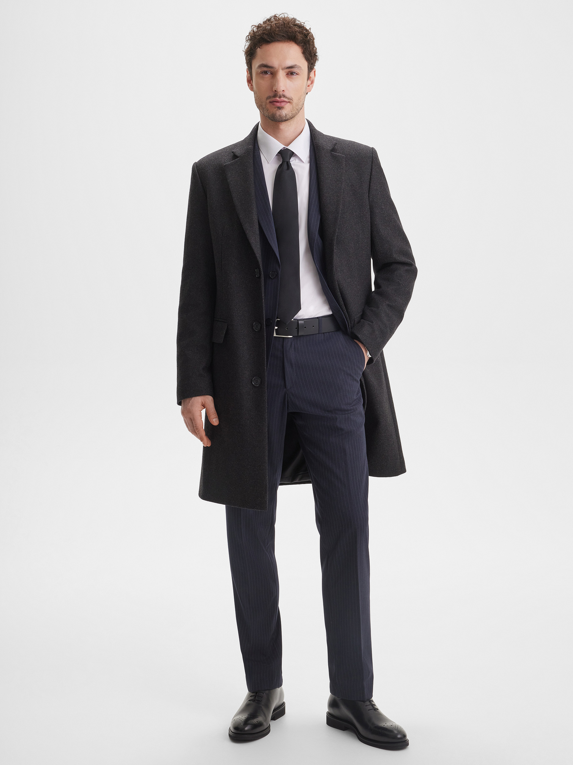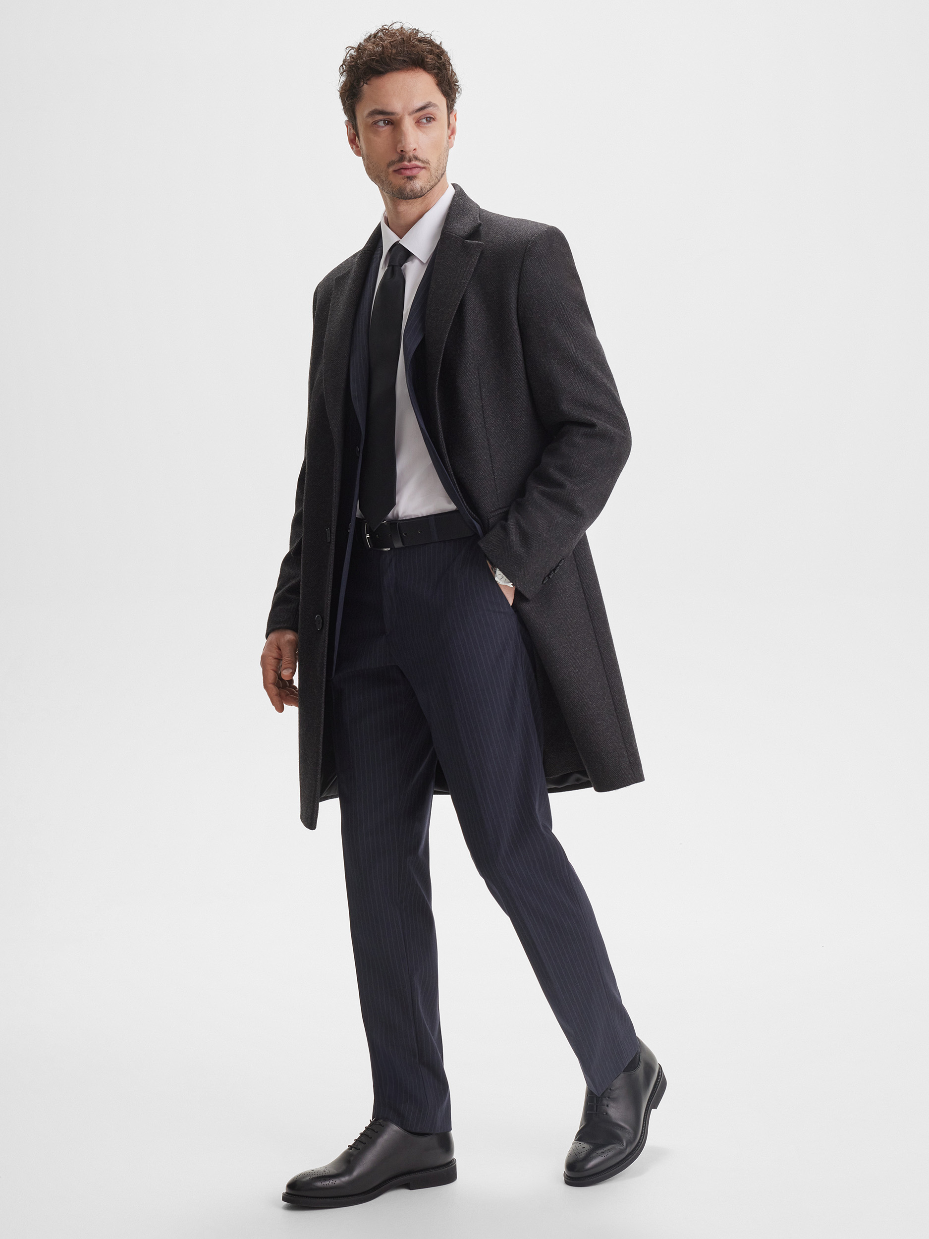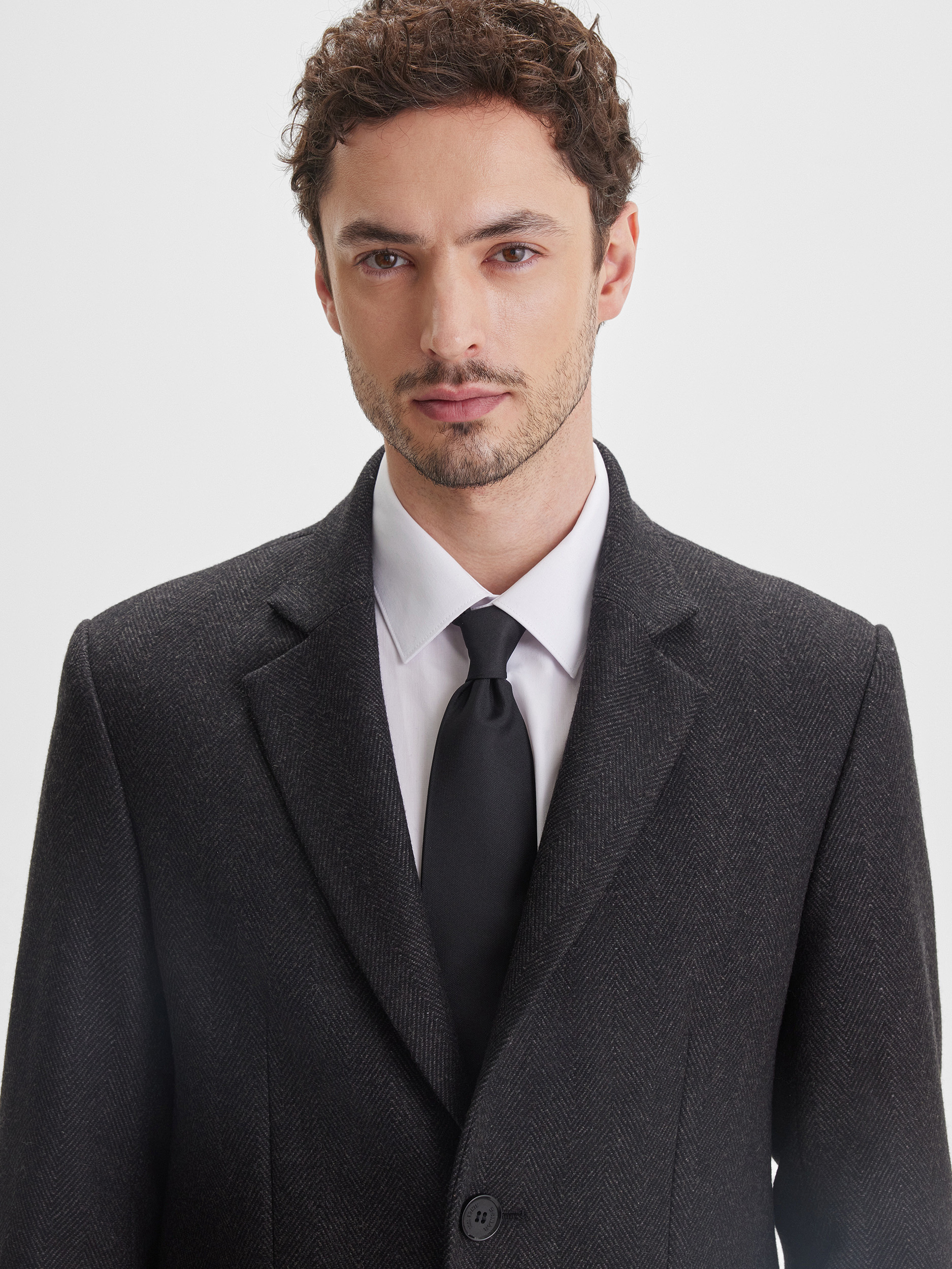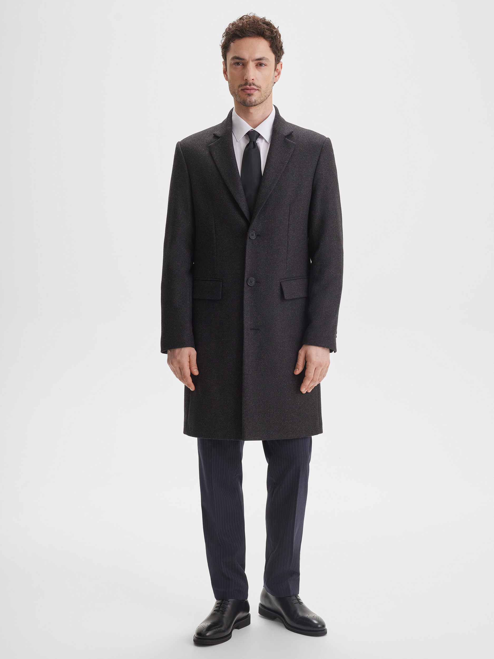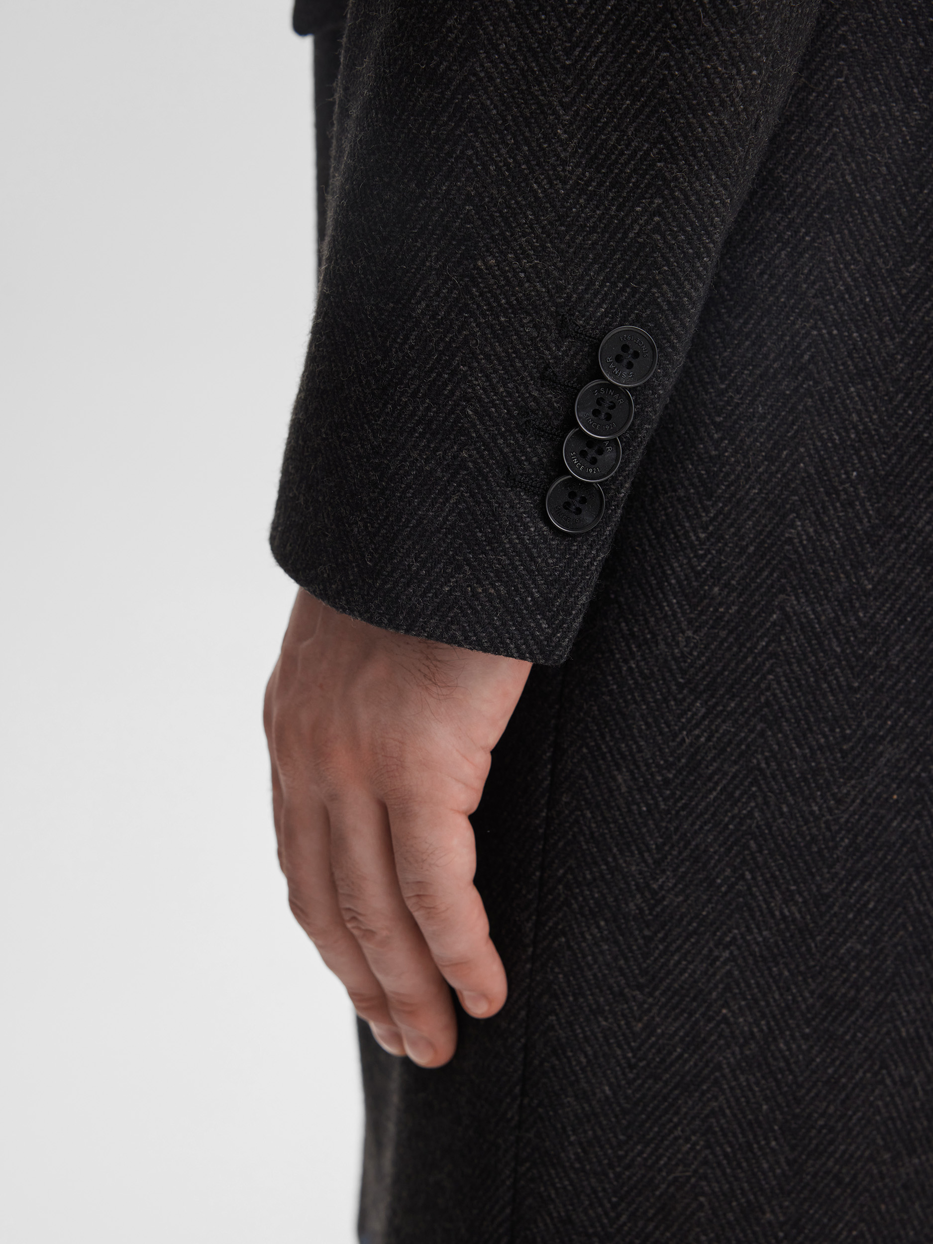 Мужское приталенное пальто SINAR выполнено в тёмно-сером цвете с узором «ёлочка», создавая современный и аккуратный образ. Ткань с содержанием шерсти обеспечивает комфорт, тепло и долговечность, позволяя пальто сохранять форму и аккуратный вид на протяжении многих сезонов. Однобортная застёжка подчёркивает строгий и стильный характер модели.