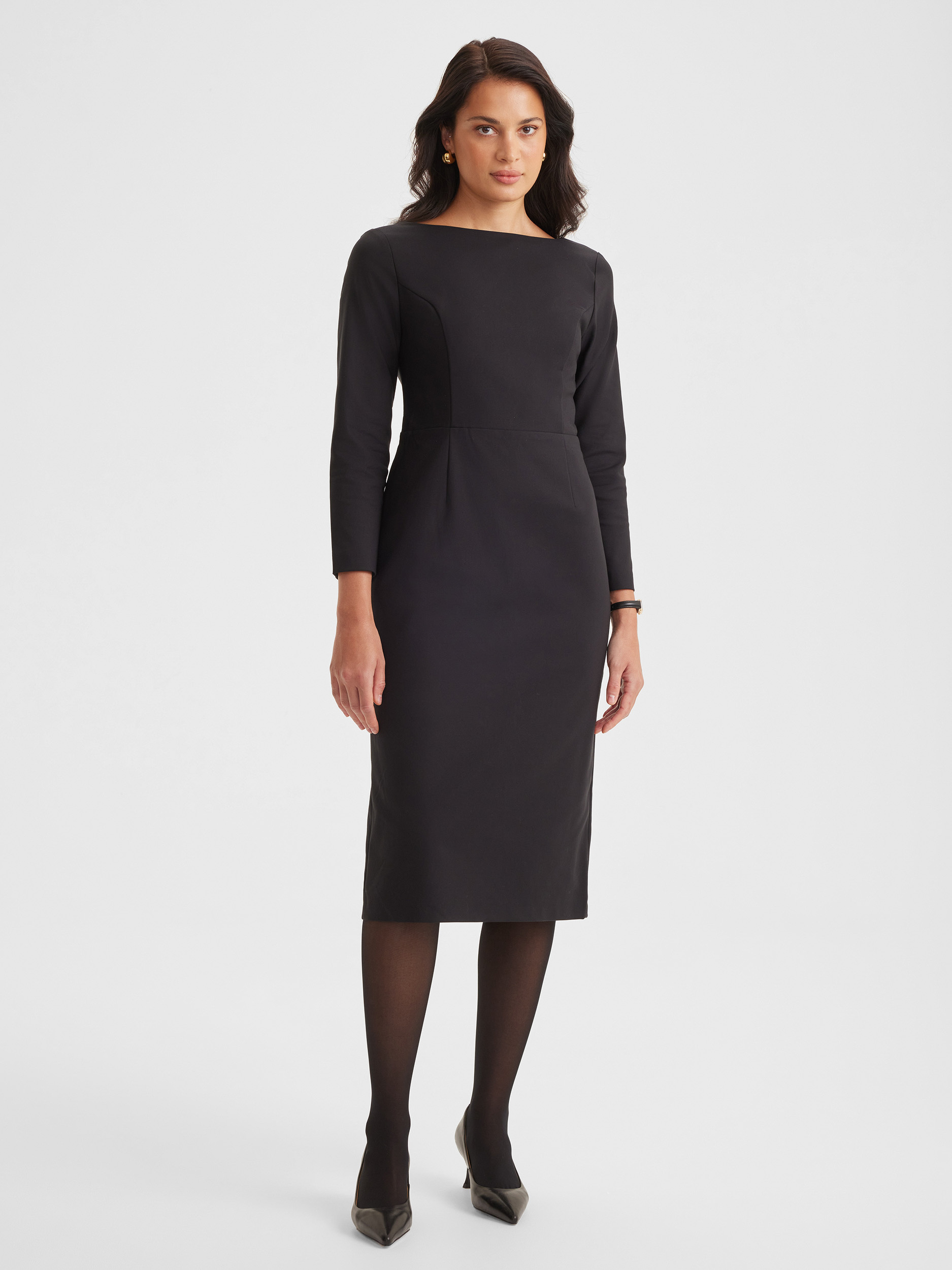 Прямое приталенное платье SINAR чёрного цвета выглядит сдержанно и элегантно, подчёркивая женственный силуэт. Для завершённого образа можно использовать ремень как акцент. Модель прекрасно подходит для офисного гардероба и официальных мероприятий, сочетаясь с жакетами и аксессуарами.