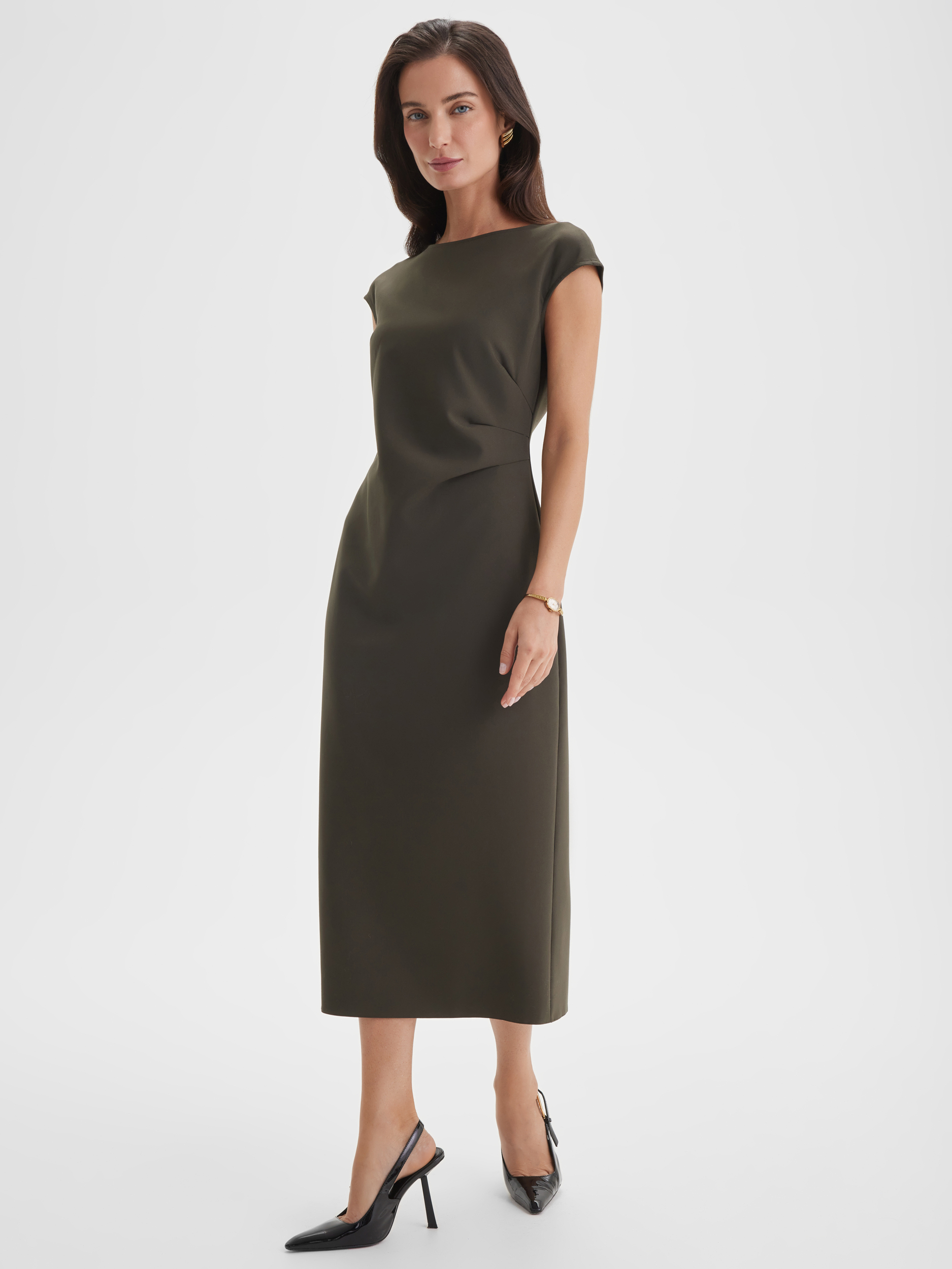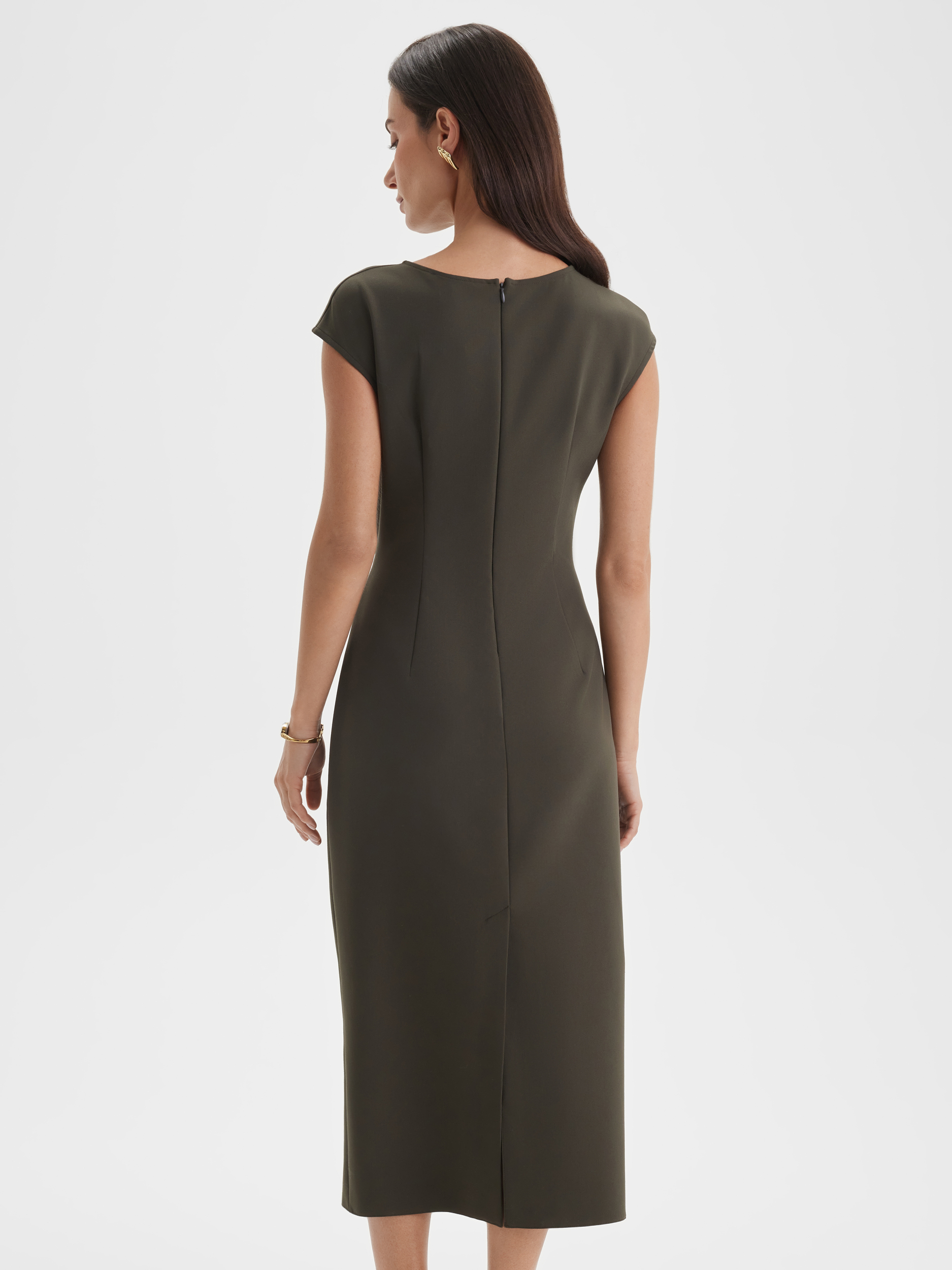 Платье в приталенном силуэте подчёркивает женственность и изящество. Аккуратная драпировка делает модель комфортной и гармоничной, а два цветовых решения — базовый чёрный и трендовый оливковый — позволяют создавать как классические, так и современные образы.