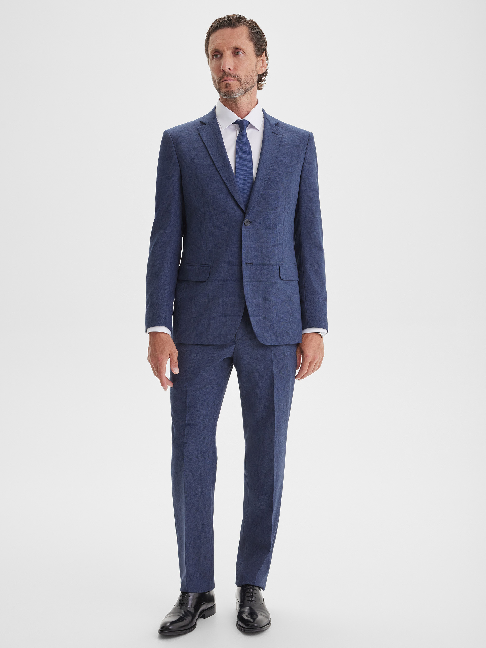 Классический костюмный пиджак силуэта REGULAR, выполненный из качественной ткани с деликатной неявной клеткой. Благодаря сдержанному дизайну и продуманному крою, пиджак подчеркивает статус и уверенность, сохраняя при этом комфорт на протяжении всего дня. Универсальный синий оттенок с едва заметным рисунком делает модель подходящей как для деловых встреч, так и для торжественных мероприятий.
