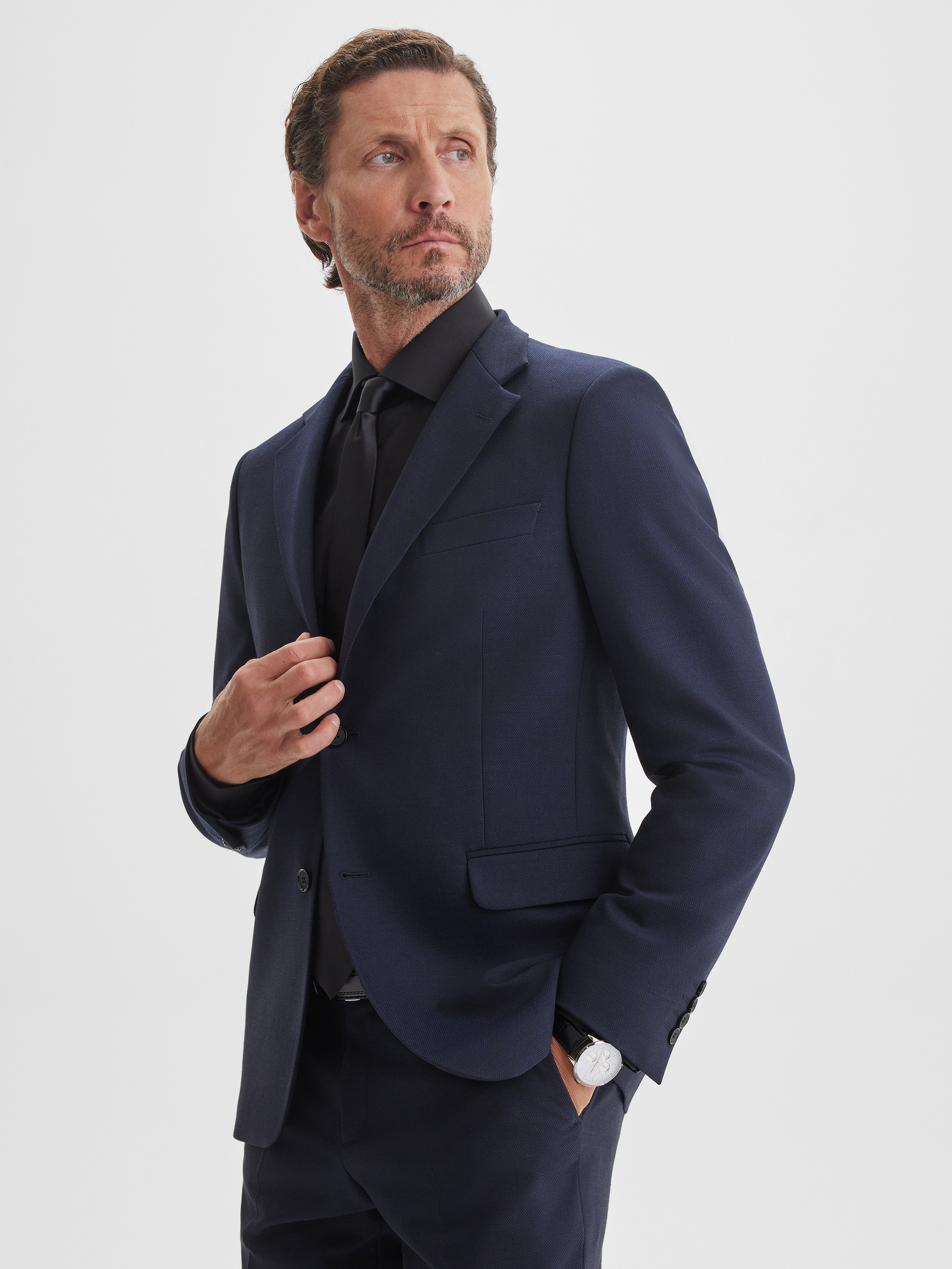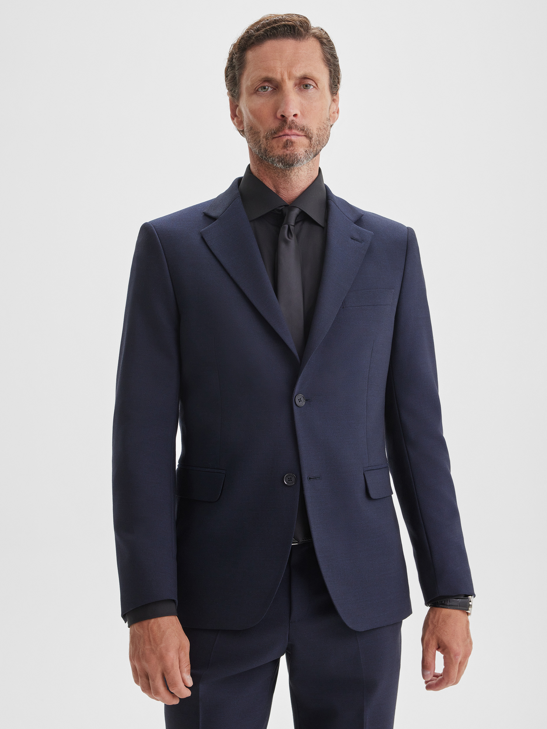 Классический пиджак темно-синего цвета с деликатным ромбовидным рисунком. Благодаря содержанию шерсти ткань держит форму, выглядит благородно и обеспечивает комфорт в течение всего дня. Такой вариант подчеркивает статус и уверенность, идеально подходит для деловых встреч и официальных мероприятий, создавая элегантный и современный образ.