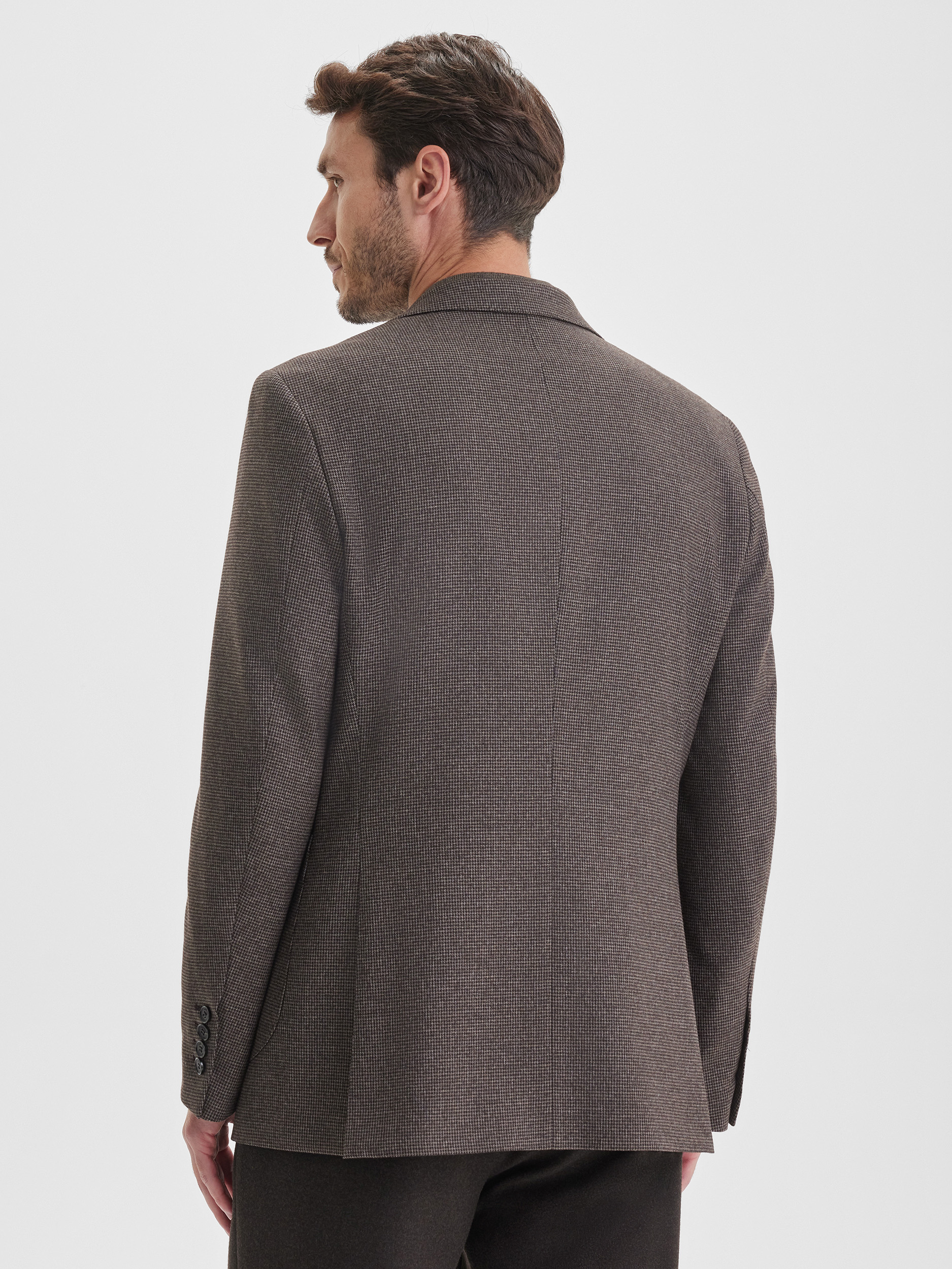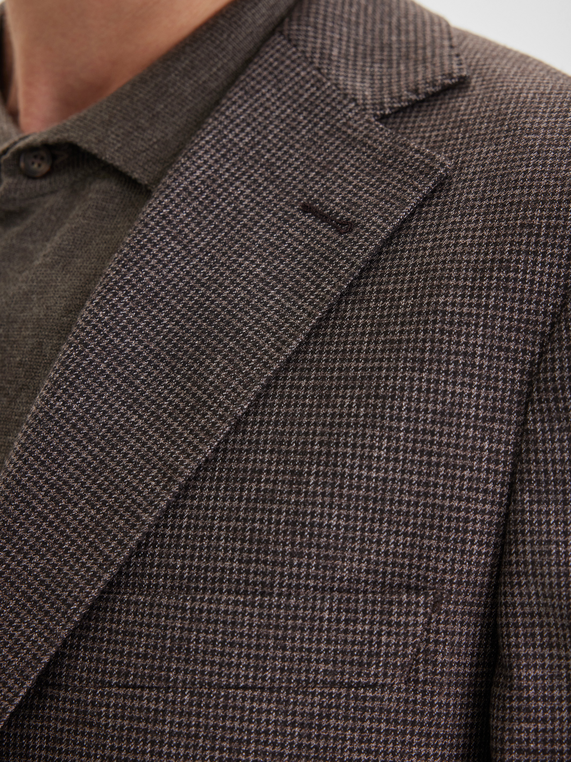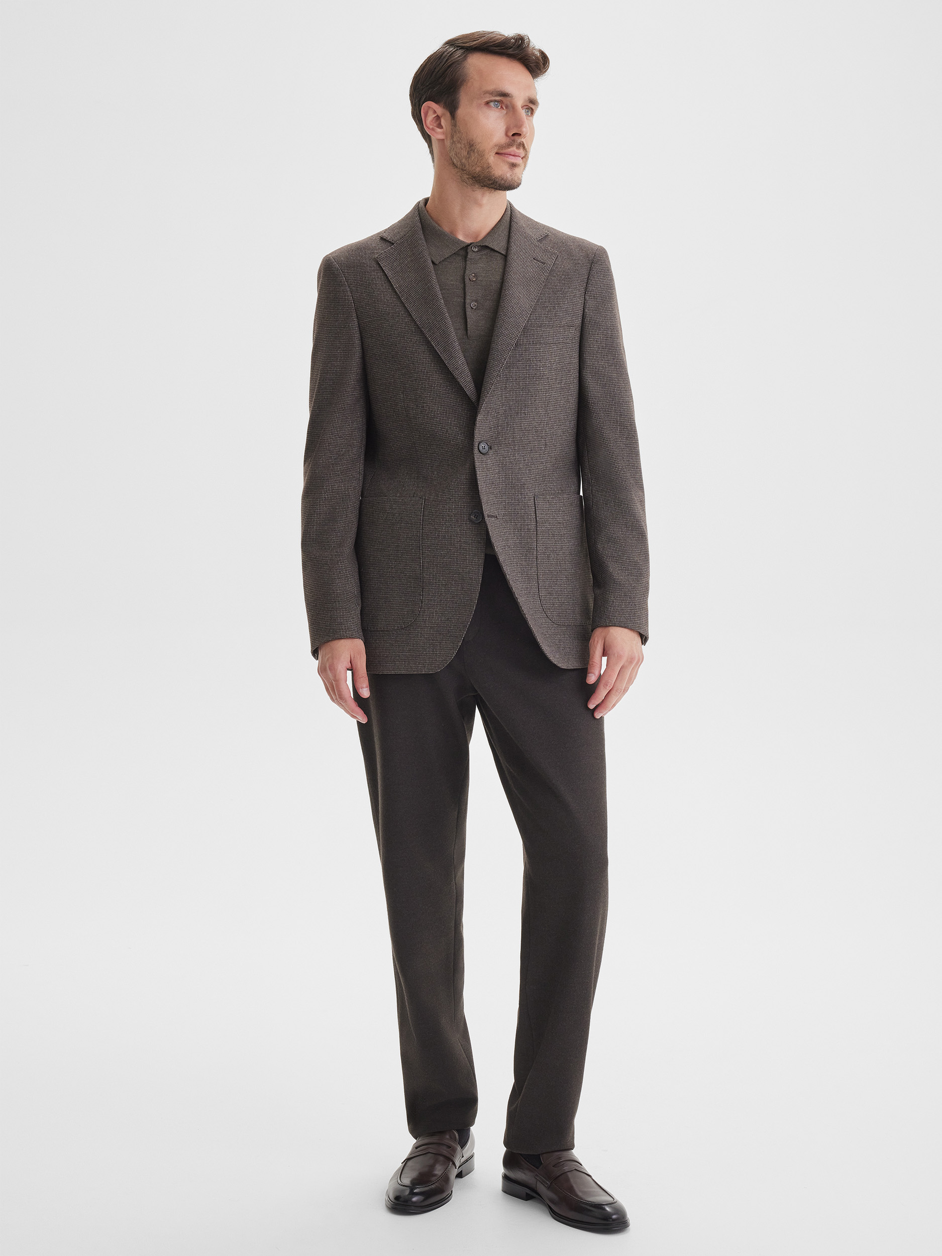Casual пиджак глубокого коричневого цвета с рисунком пье-де-пуль создан для комфортного и стильного повседневного зимнего гардероба. Модель сочетает элегантность и практичность, позволяя выглядеть современно и собранно в холодный сезон, не жертвуя теплом и тактильным комфортом. Благодаря универсальному крою и гармоничной цветовой палитре, пиджак легко становится основой для разнообразных образов, добавляя им выразительности и завершённости.