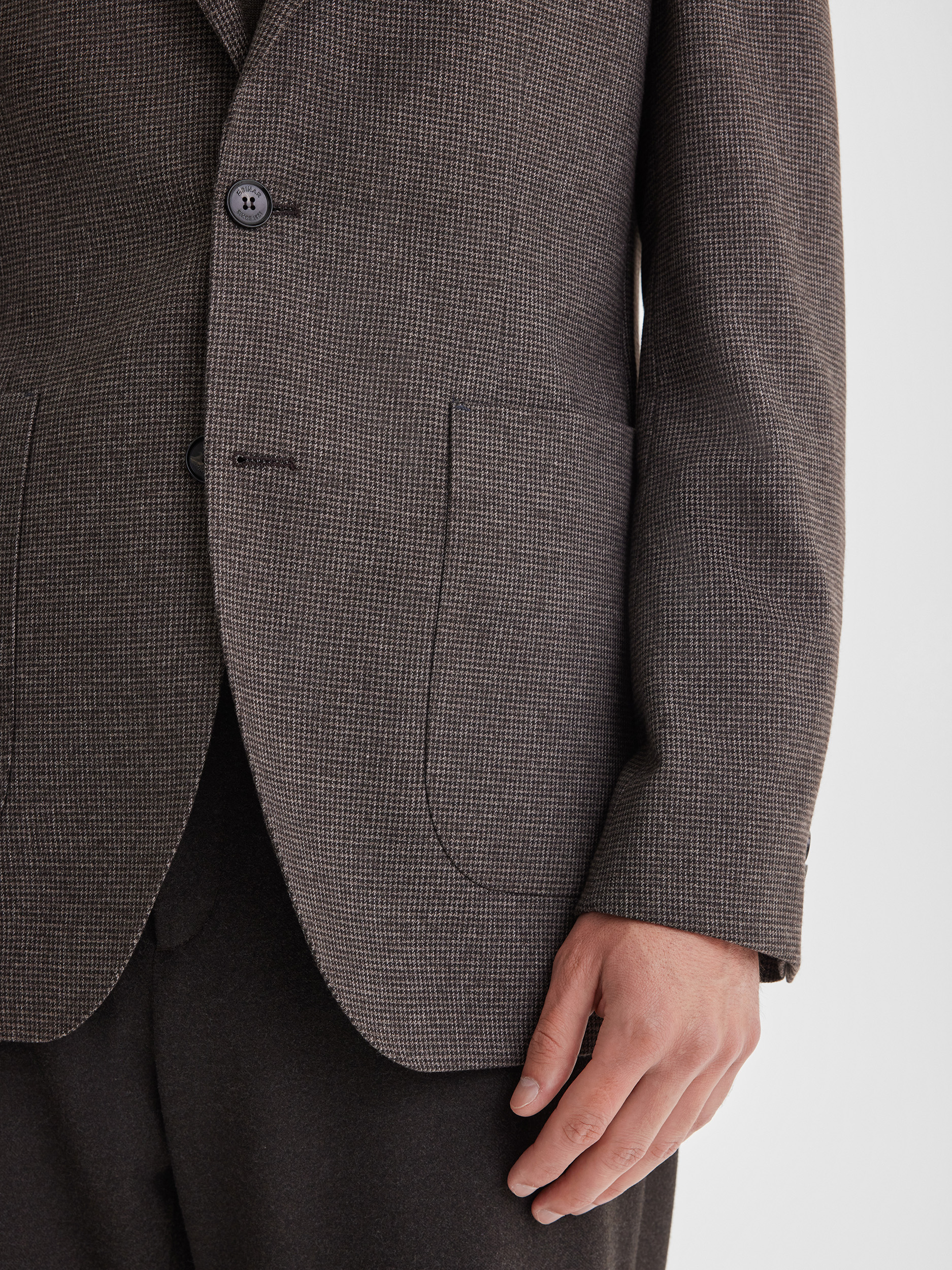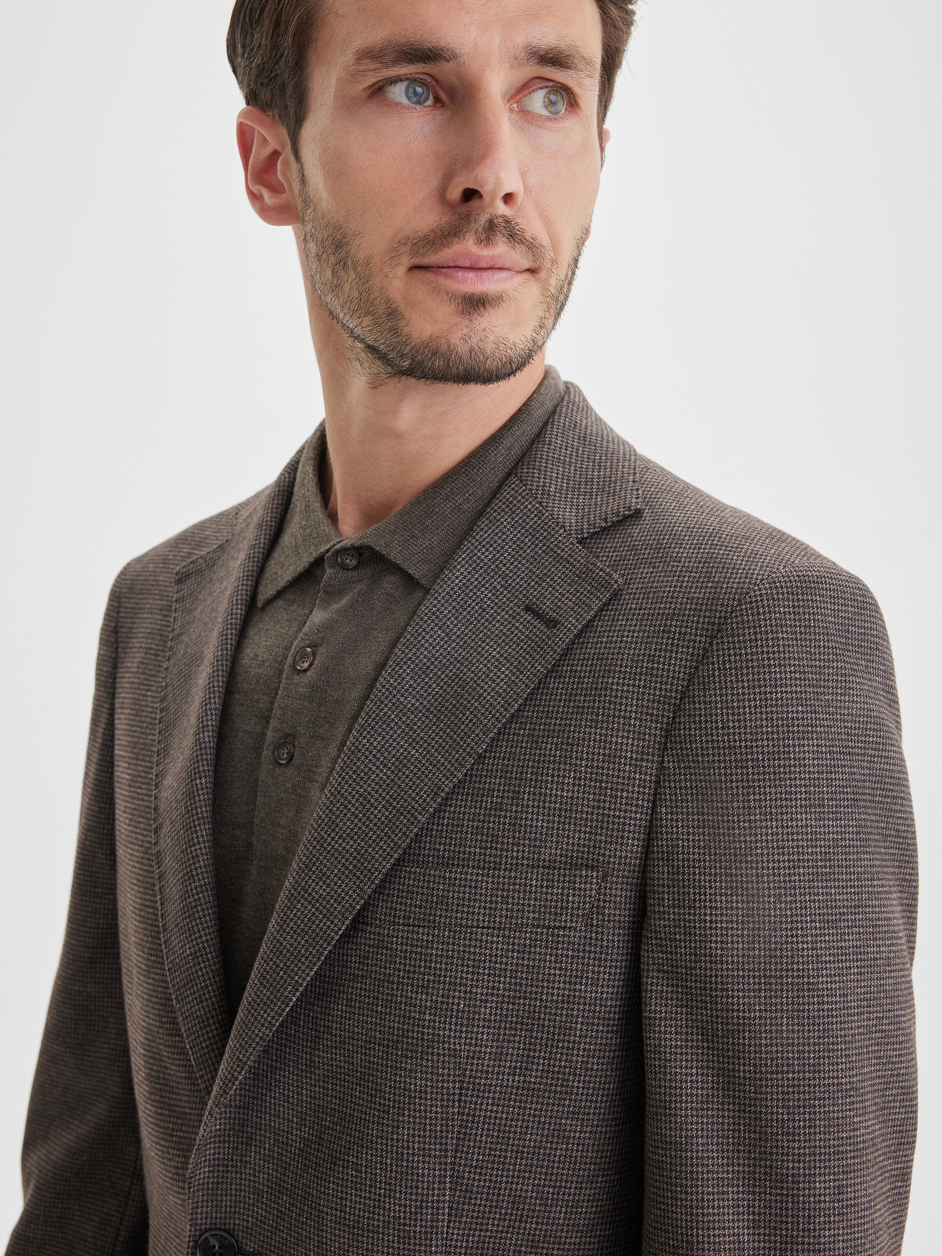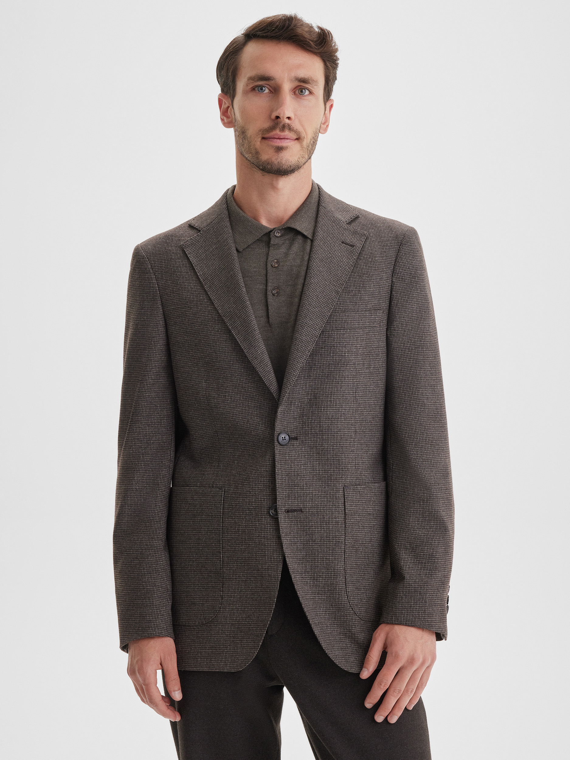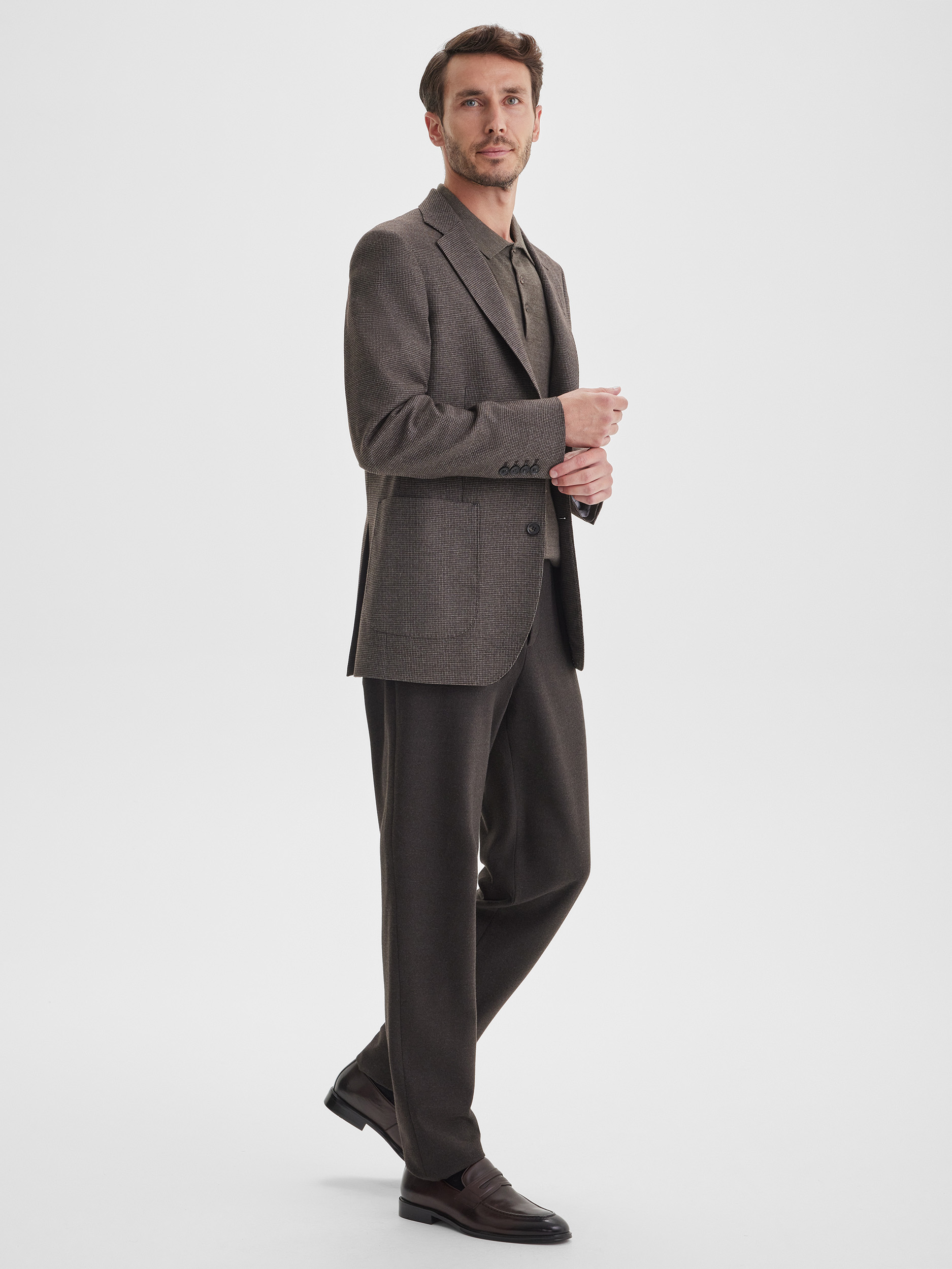 Casual пиджак глубокого коричневого цвета с рисунком пье-де-пуль создан для комфортного и стильного повседневного зимнего гардероба. Модель сочетает элегантность и практичность, позволяя выглядеть современно и собранно в холодный сезон, не жертвуя теплом и тактильным комфортом. Благодаря универсальному крою и гармоничной цветовой палитре, пиджак легко становится основой для разнообразных образов, добавляя им выразительности и завершённости.