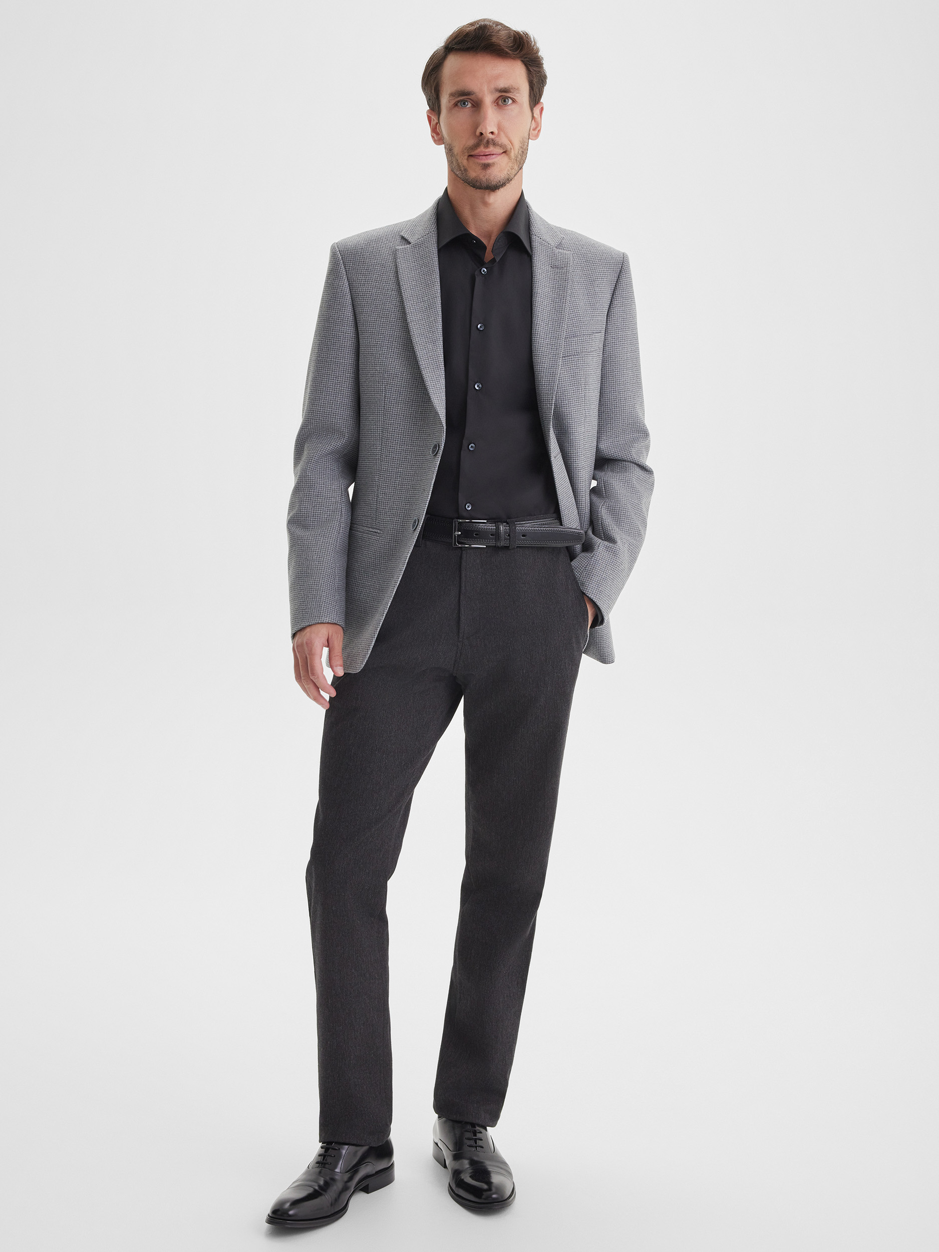 Приталенный серый пиджак с благородным рисунком ткани пье-де-пуль и аккуратным карманом в рамку. Благодаря содержанию шерсти изделие отличается теплом, мягкостью и долговечностью. Лаконичный силуэт подчёркивает фигуру, а универсальный оттенок позволяет легко сочетать пиджак как с классическими брюками, так и с более повседневными элементами гардероба.