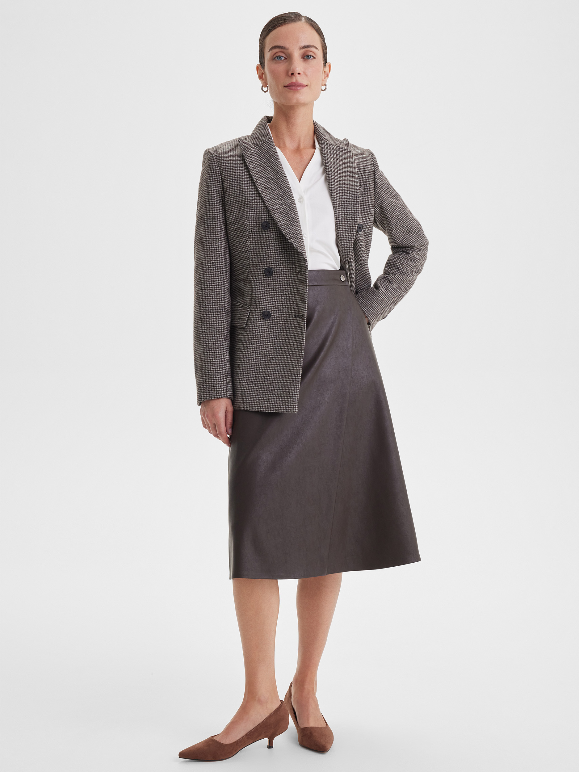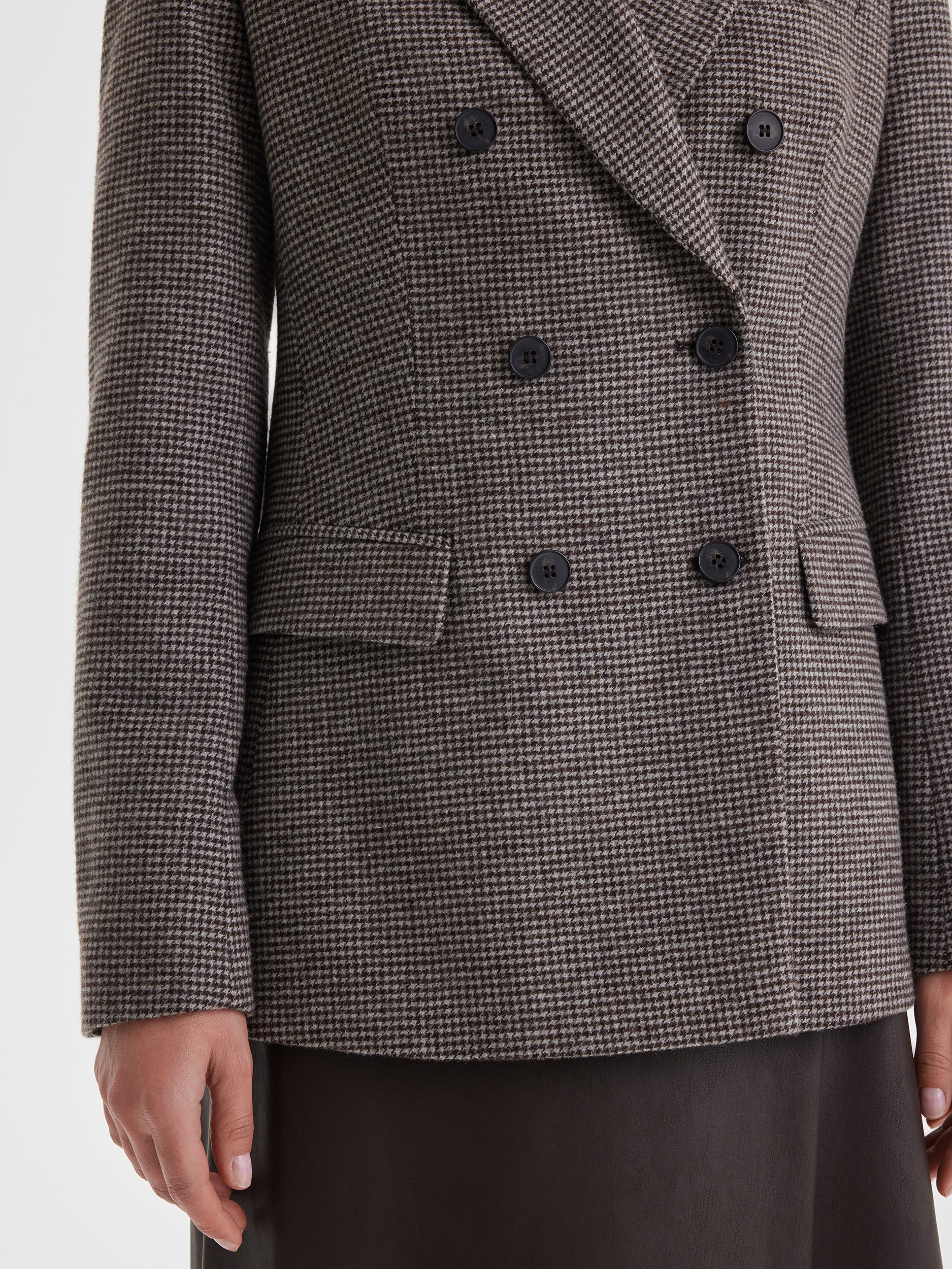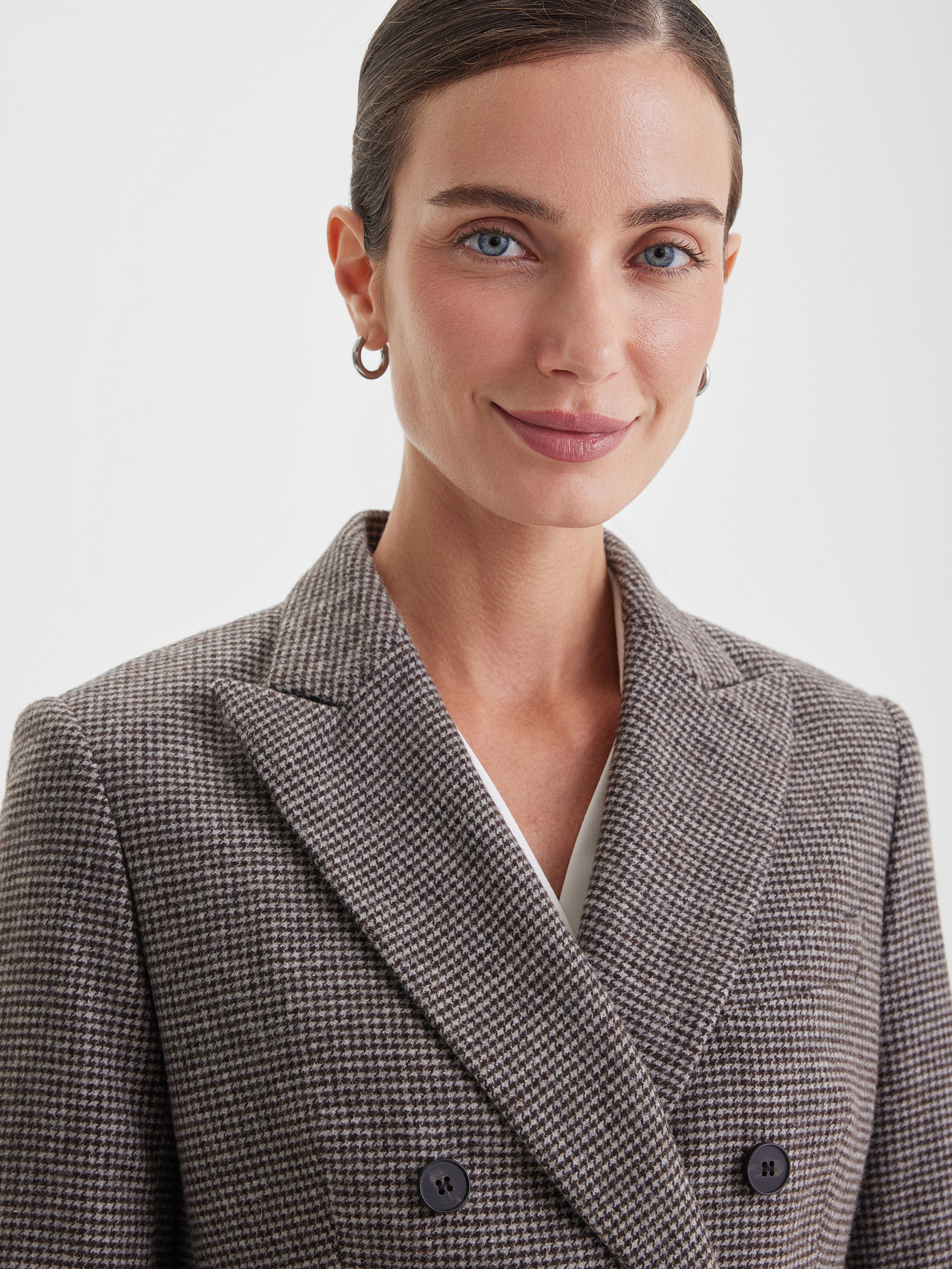 Жакет в глубоком коричневом оттенке станет стильным решением для прохладных дней. Натуральная шерсть в составе ткани дарит тепло, комфорт и долговечность, сохраняя безупречный внешний вид.