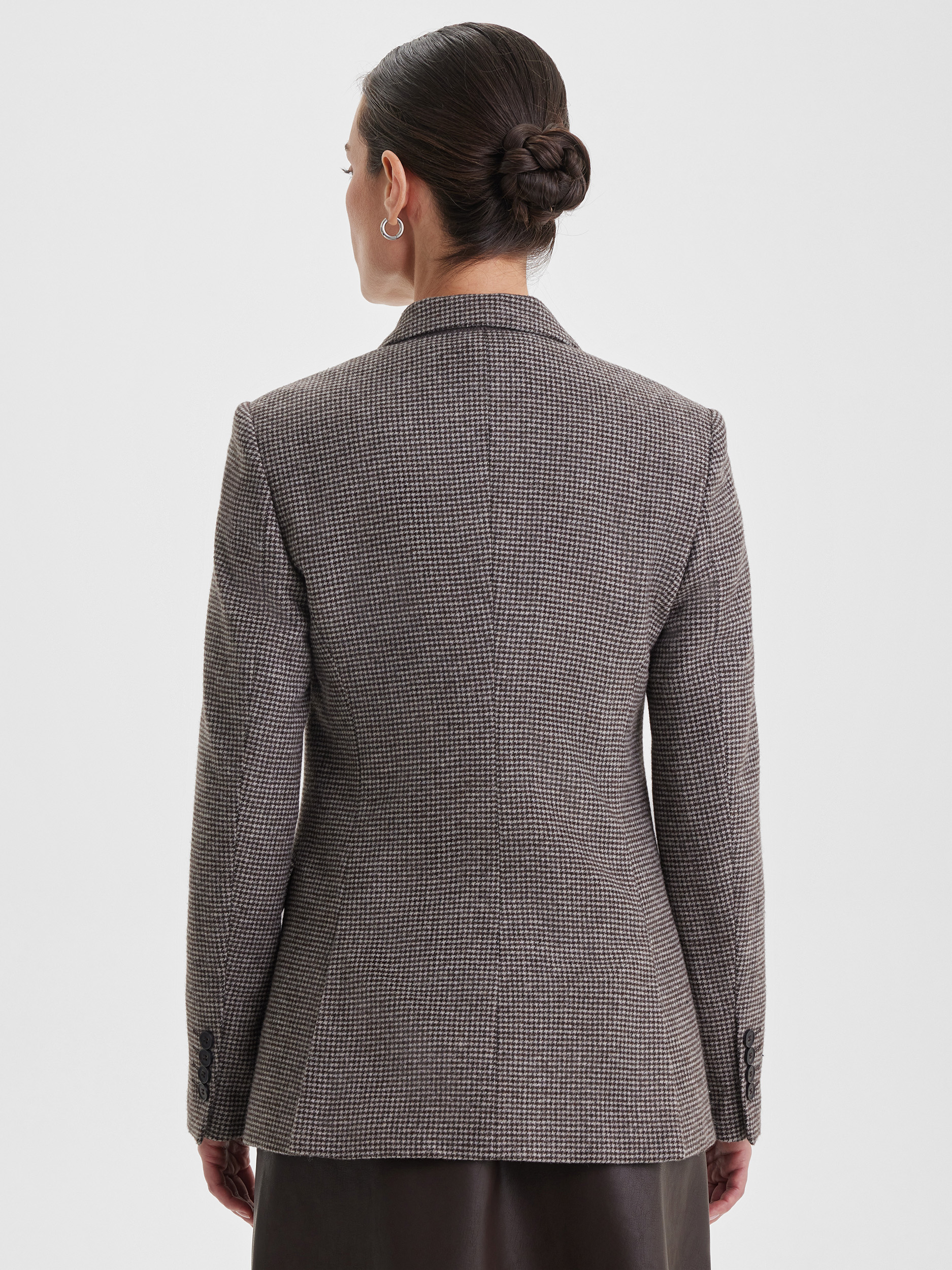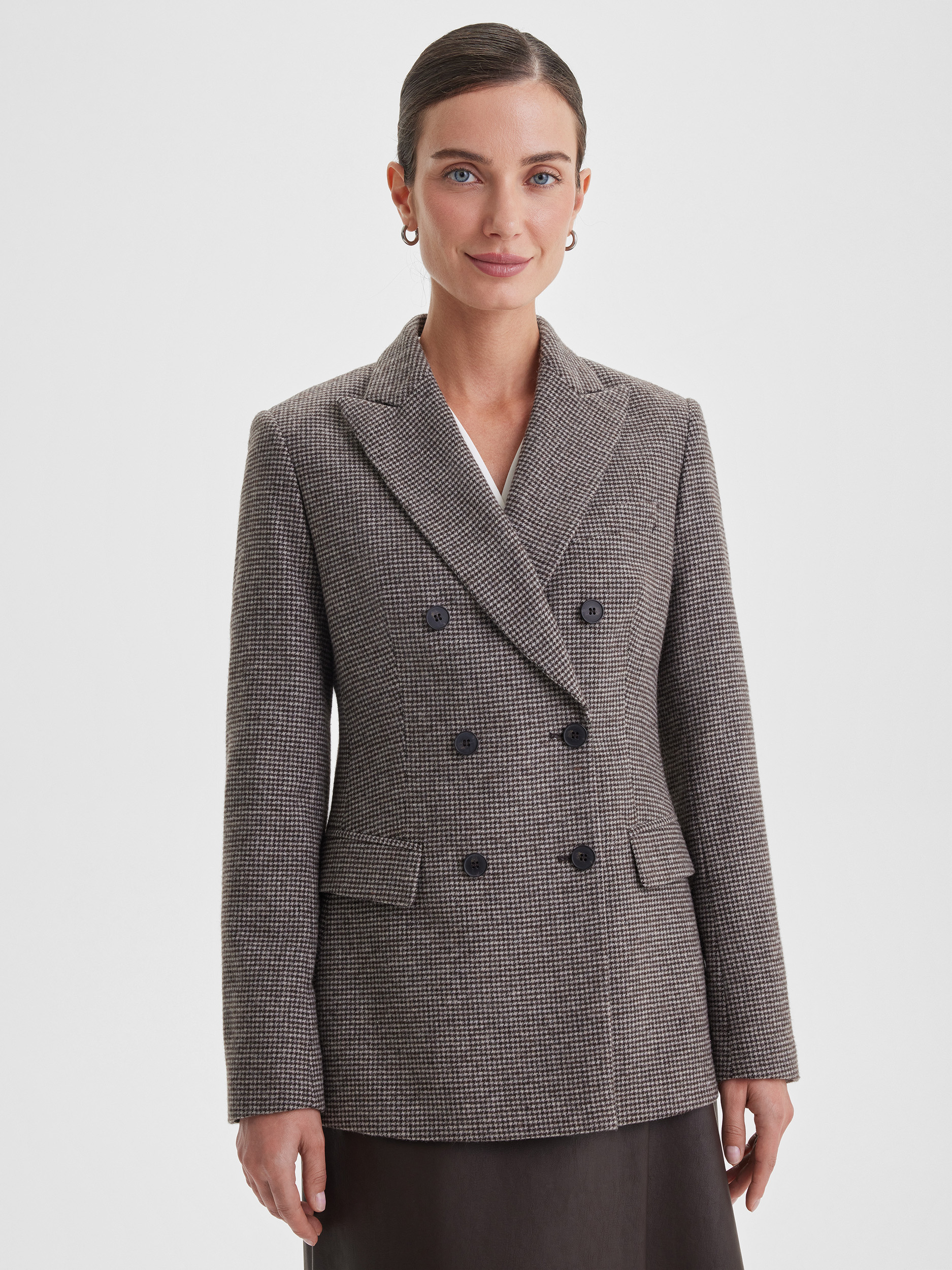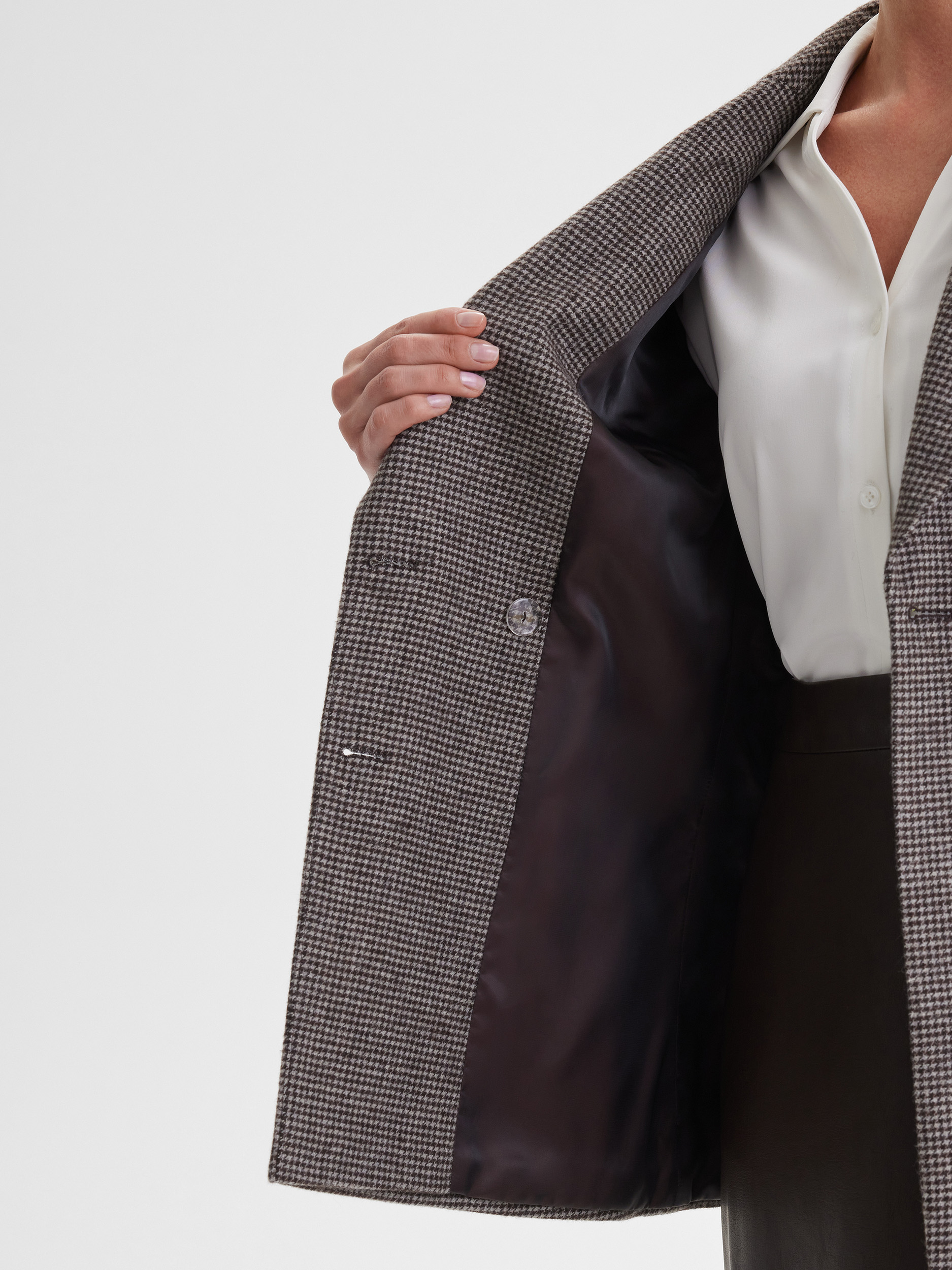 Жакет в глубоком коричневом оттенке станет стильным решением для прохладных дней. Натуральная шерсть в составе ткани дарит тепло, комфорт и долговечность, сохраняя безупречный внешний вид.