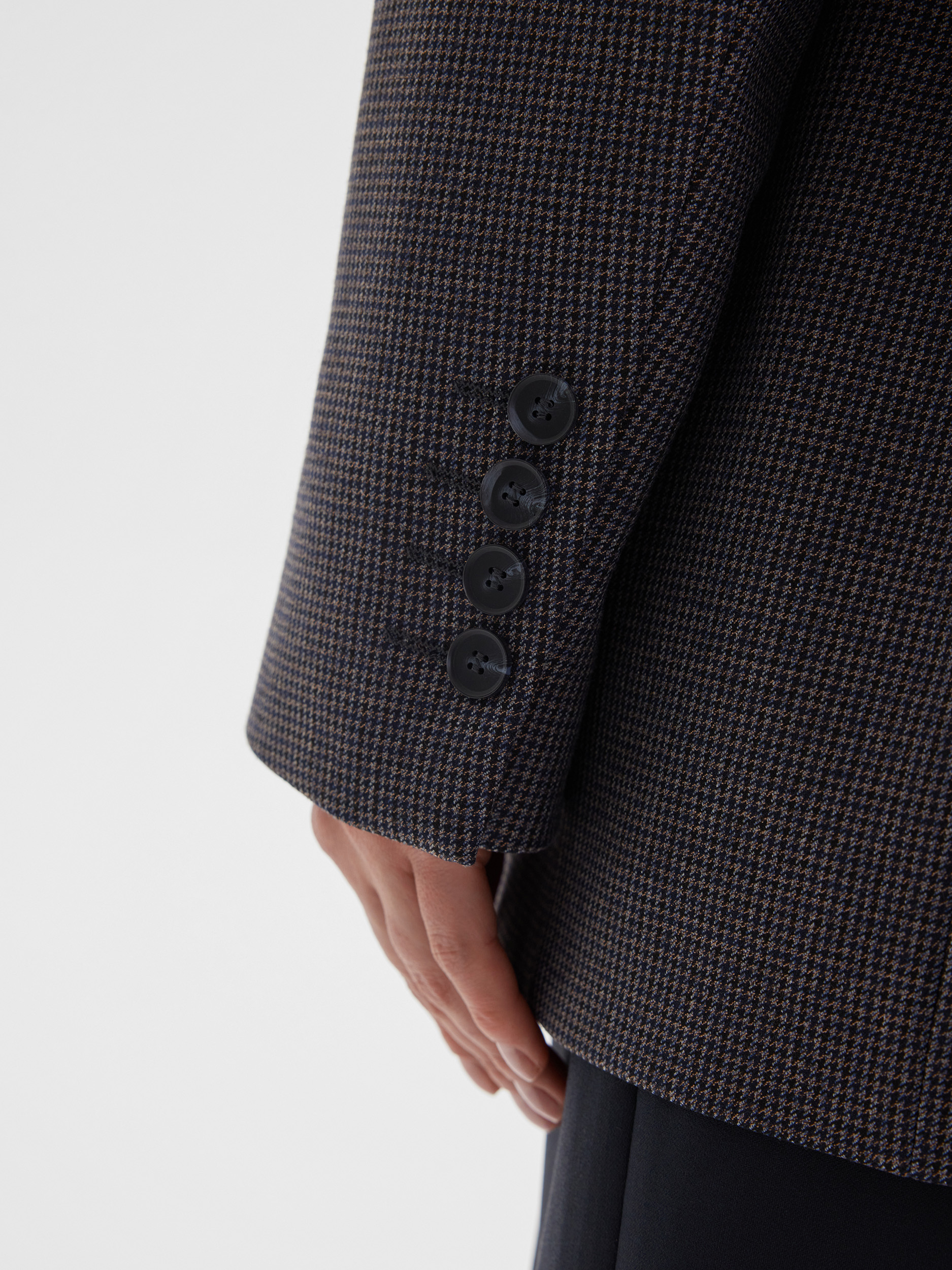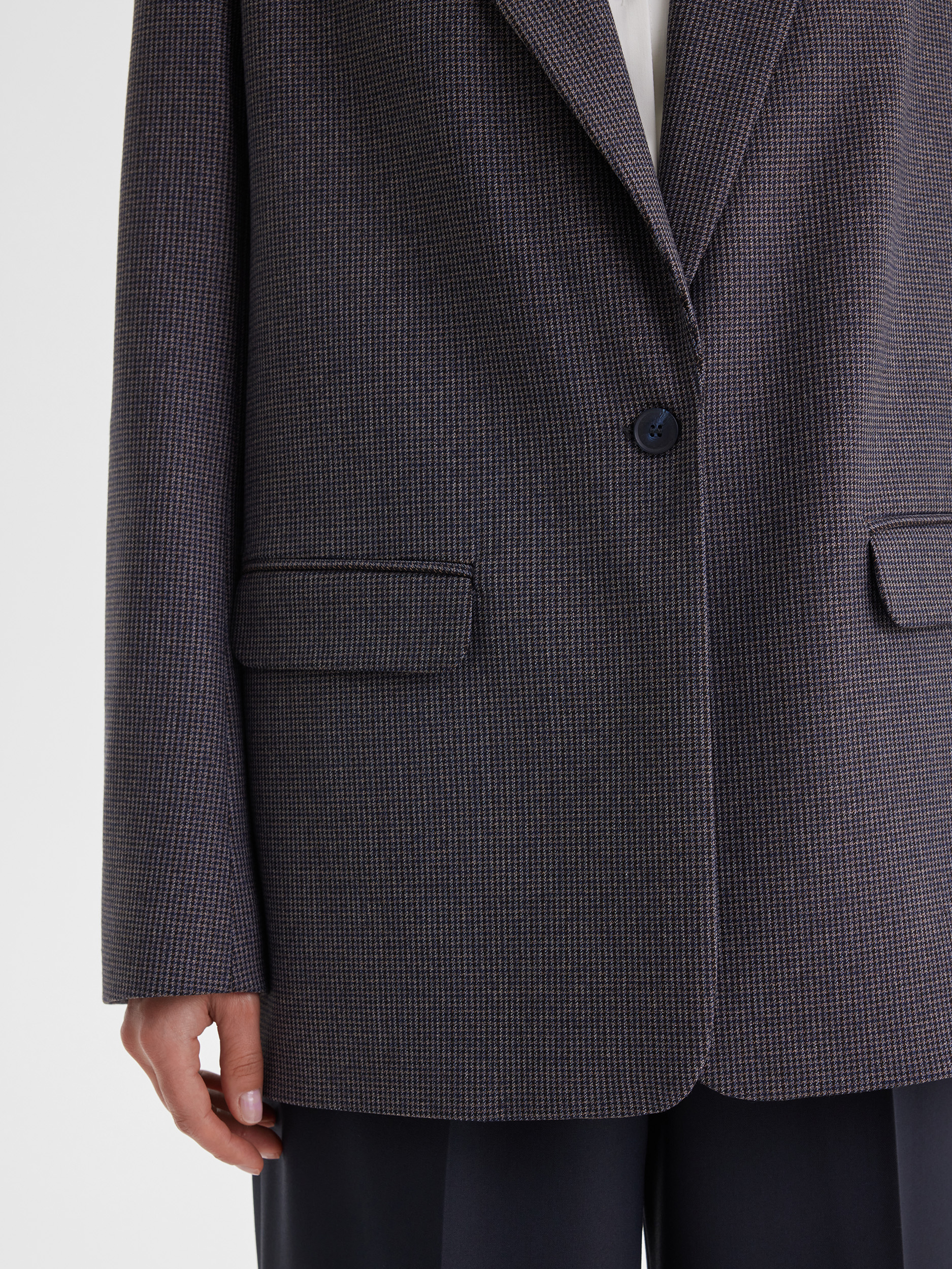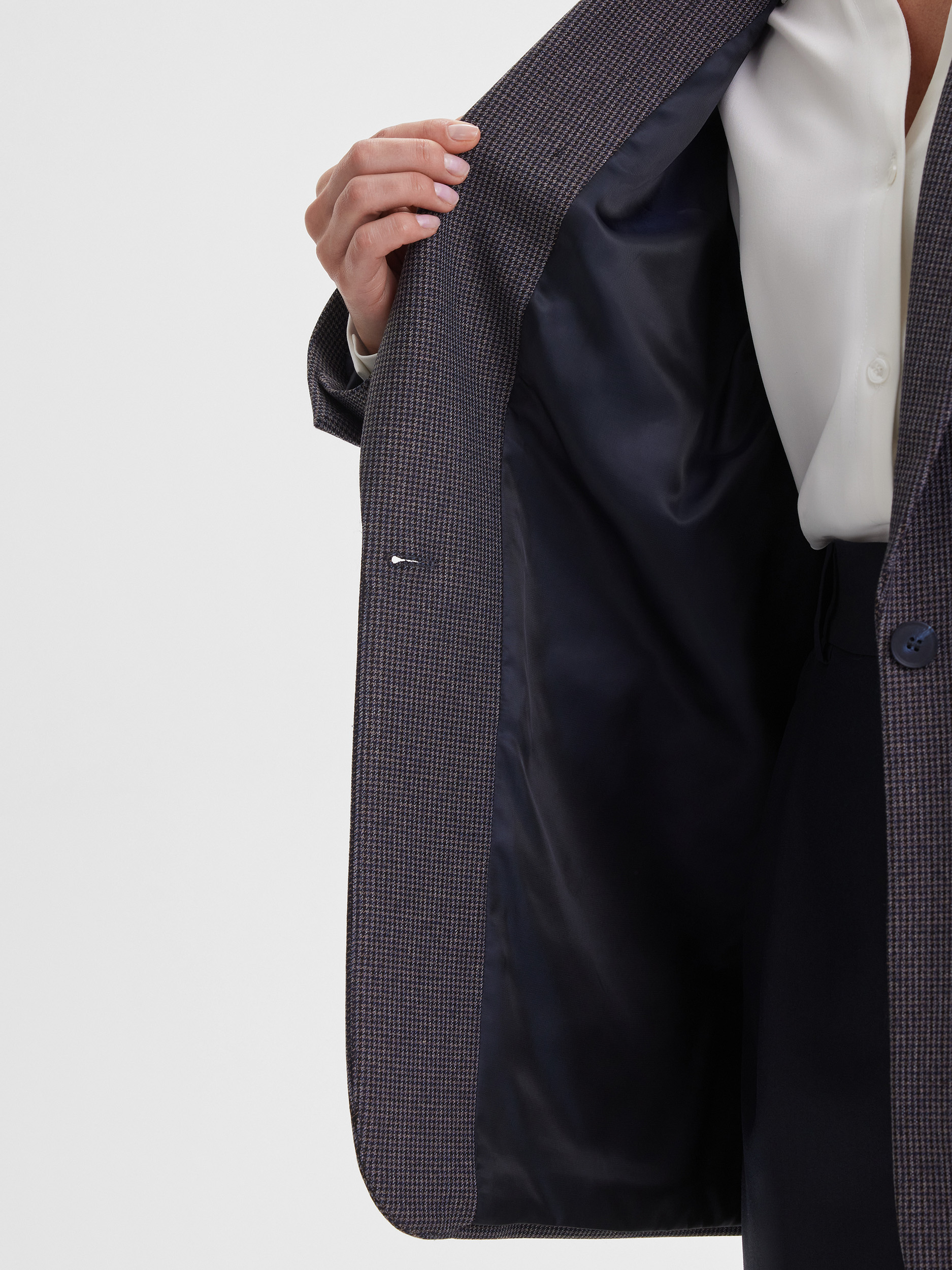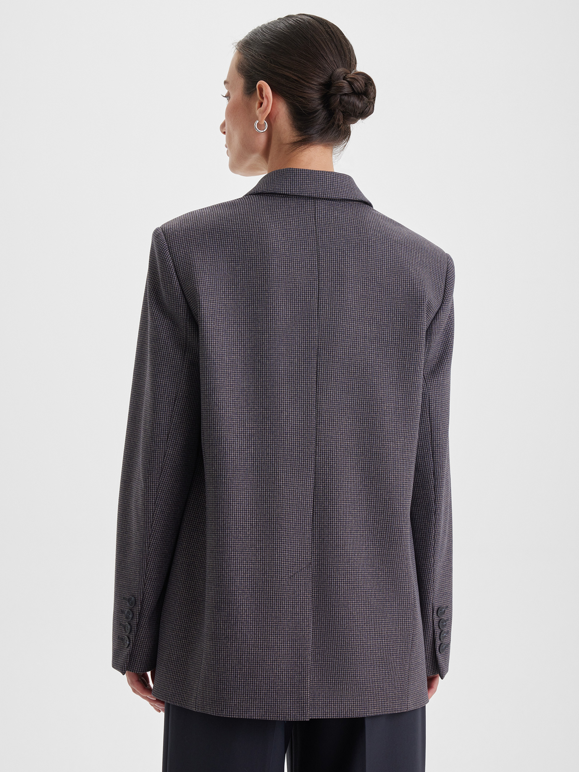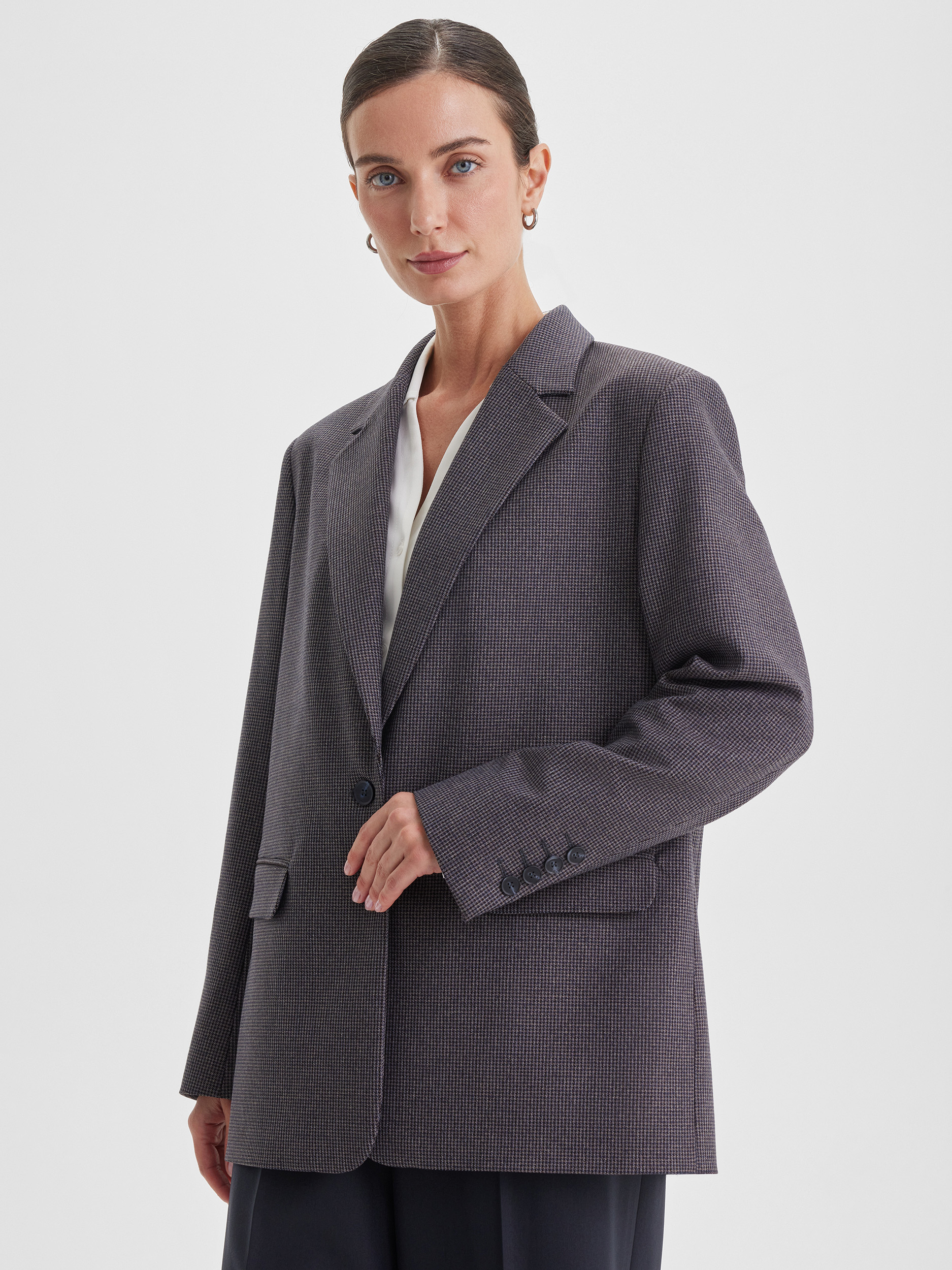 Жакет универсального кроя, который комфортно садится на разные типы фигуры. Классический рисунок пье-де-пуль придаёт изделию благородство и делает образ утончённым. Модель легко комбинируется с вещами из гардероба — от джинсов до строгих брюк, создавая стильные и разнообразные образы.