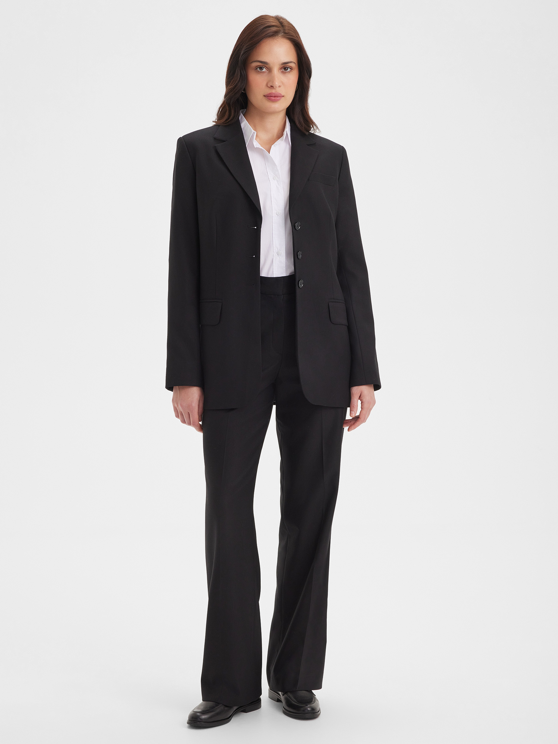 Прямой черный жакет с аккуратным английским воротником и тремя пуговицами создаёт сдержанный и элегантный образ. Лаконичный крой подчёркивает уверенность и современный стиль, делая модель универсальным дополнением делового гардероба. Этот жакет идеально впишется в офисный или повседневный комплект, добавляя образу чёткость и структуру.