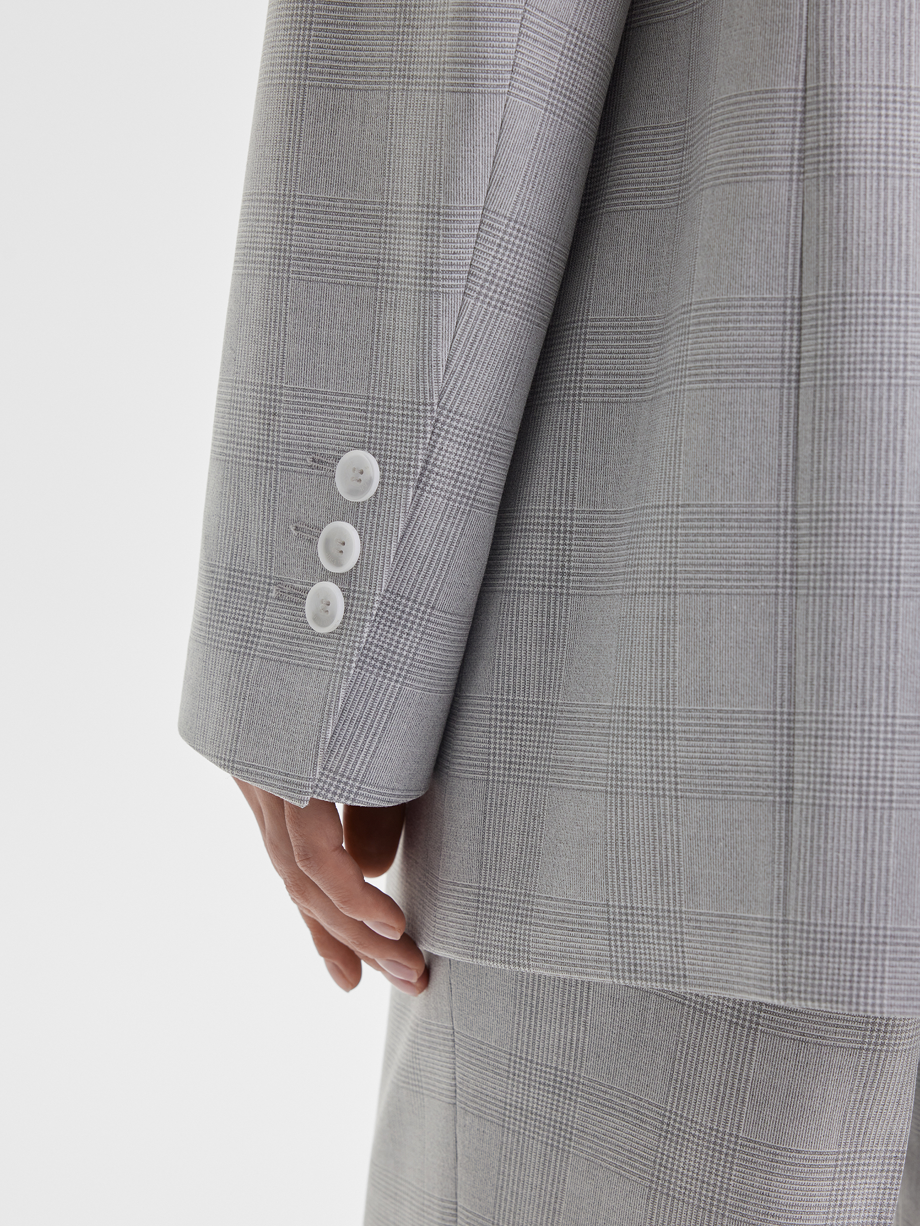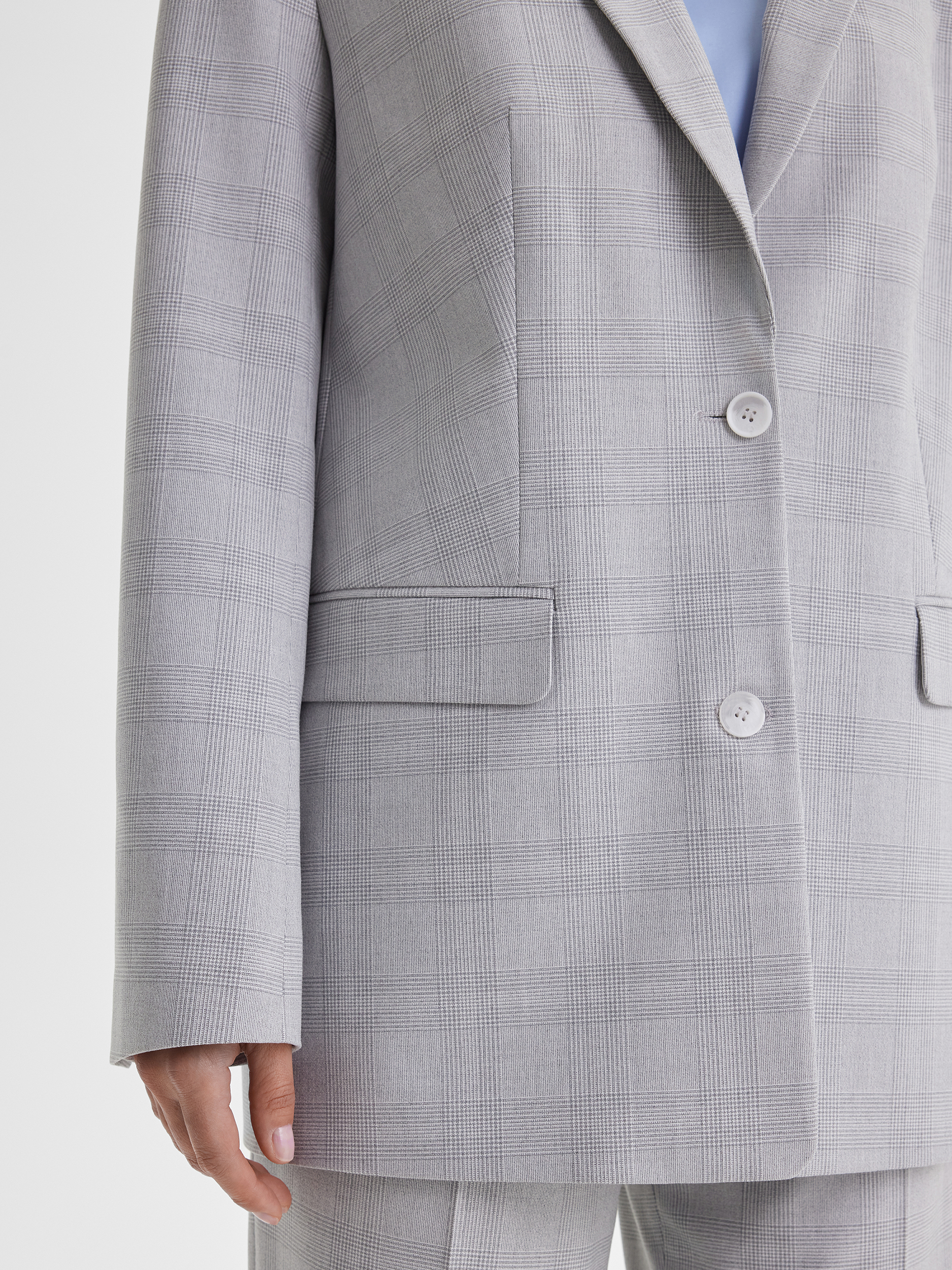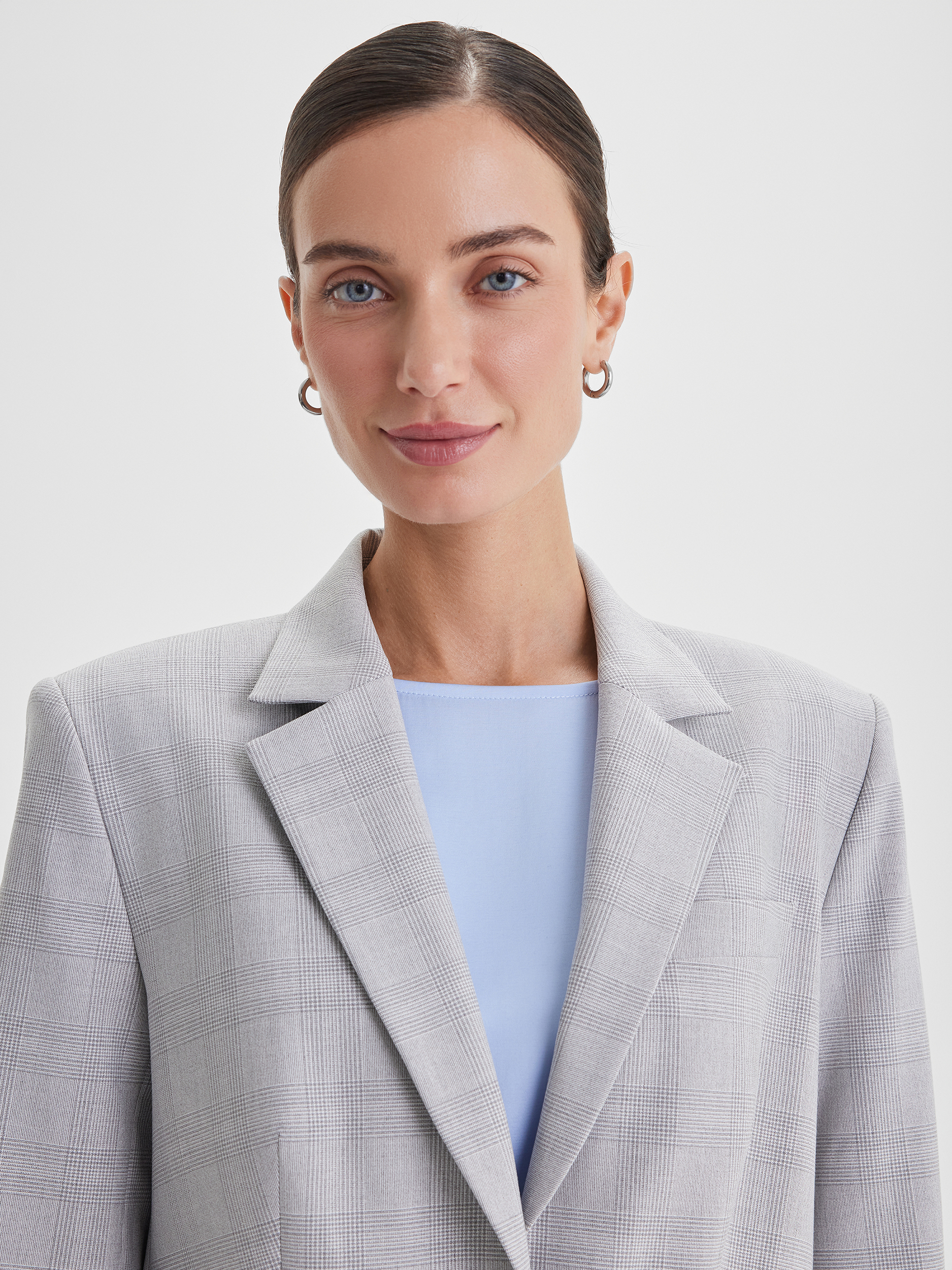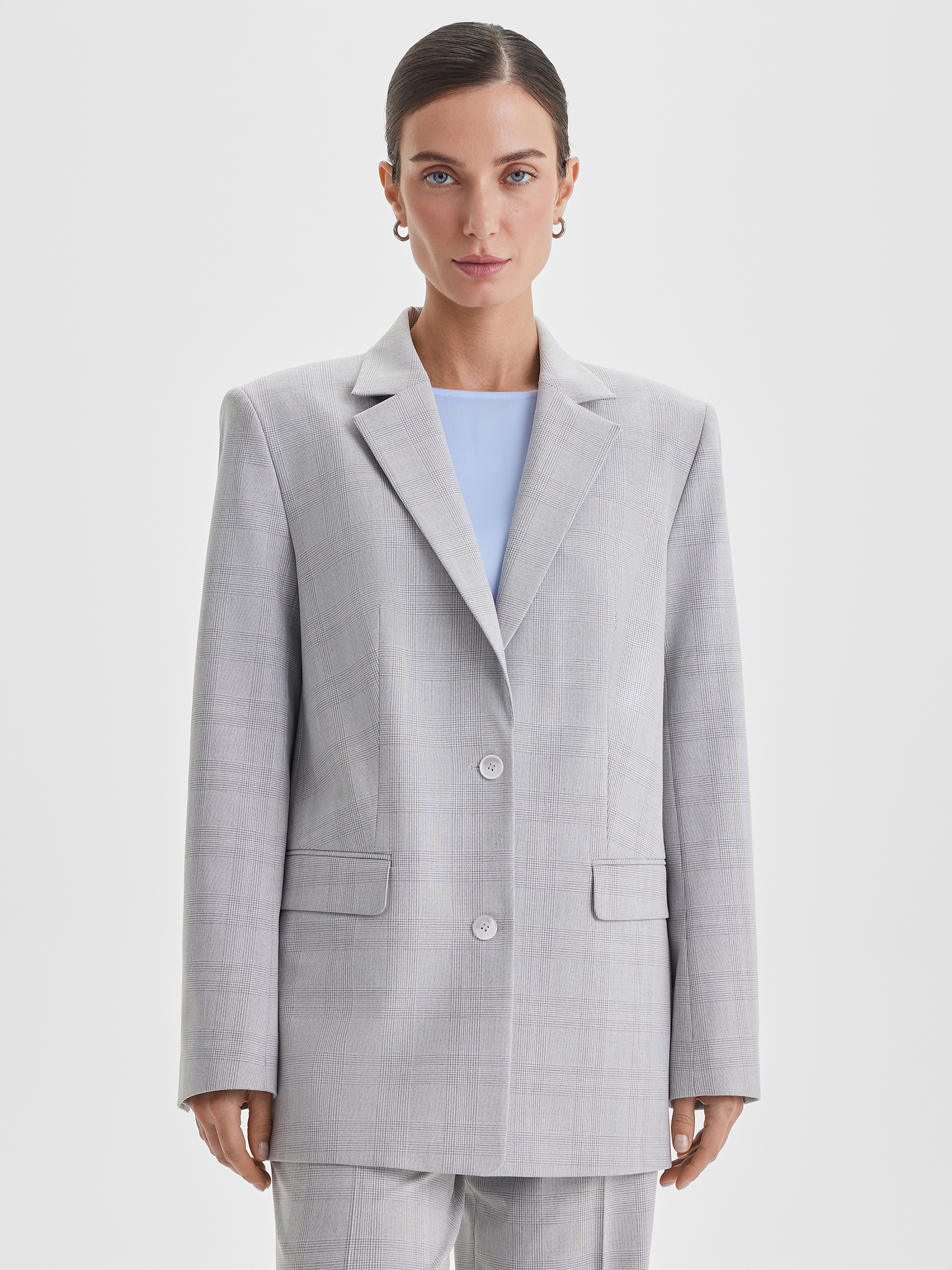 Жакет с расширенным плечевым поясом, выполненный из ткани в сдержанную серую клетку — неизменную классику делового гардероба. Благодаря универсальному оттенку и лаконичному рисунку модель легко адаптируется под разные ситуации: она уместна как в офисе, так и на мероприятии. В сочетании с прямыми брюками жакет образует элегантный костюм, который станет основой множества образов.
