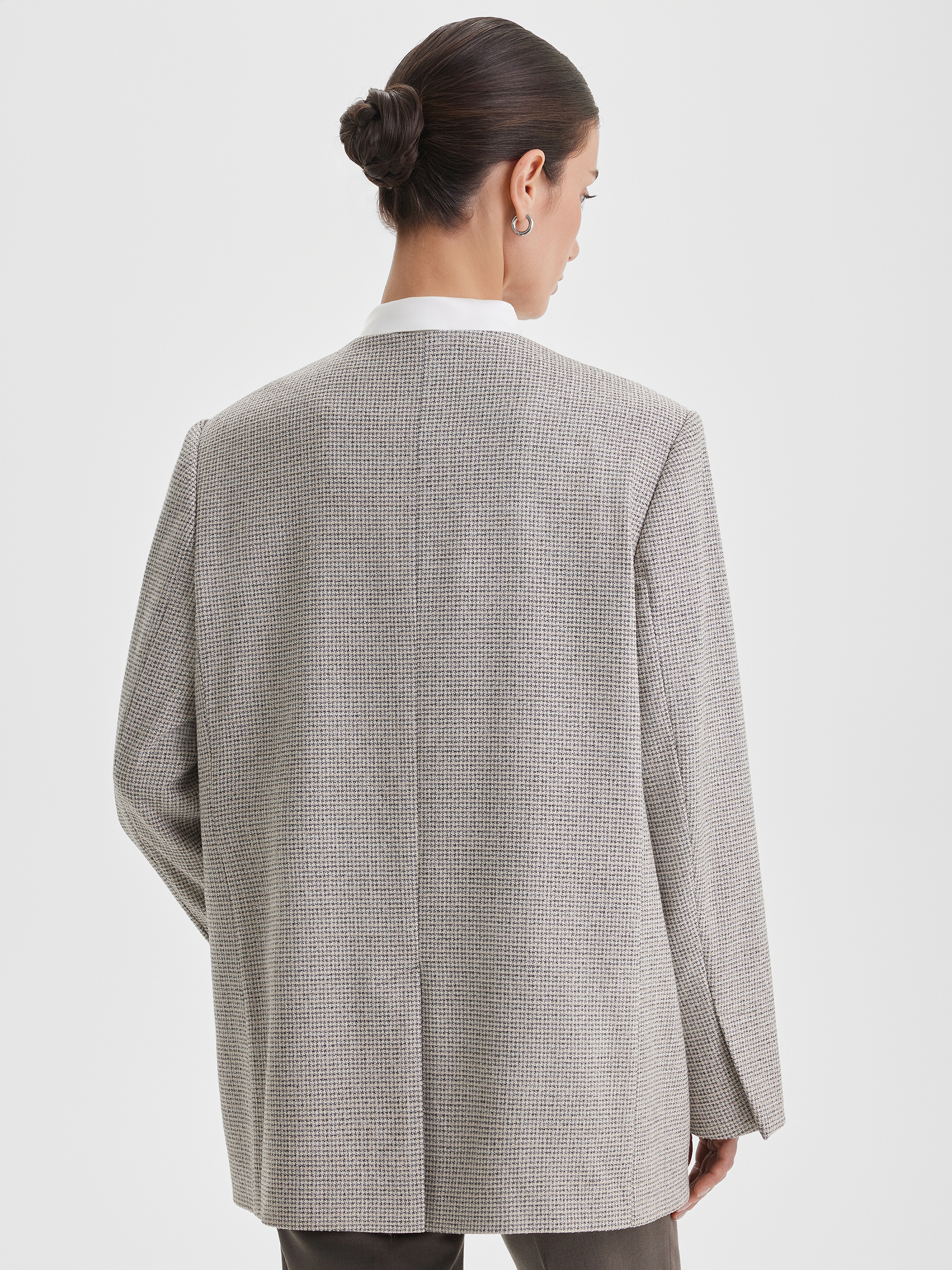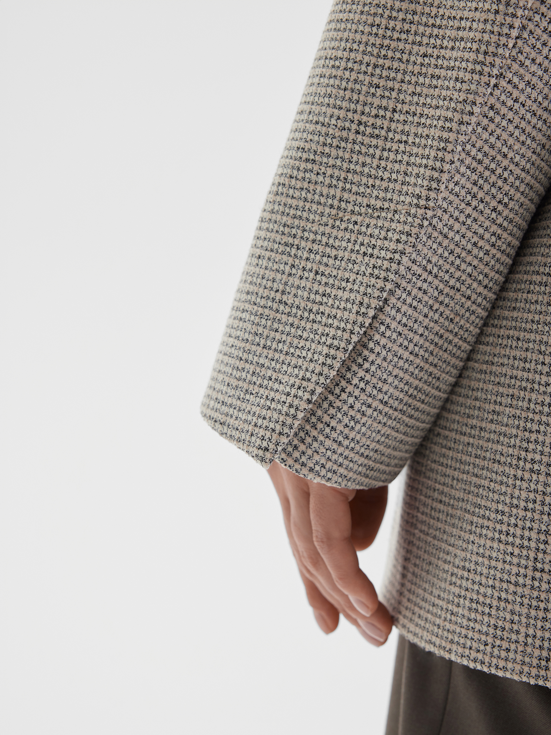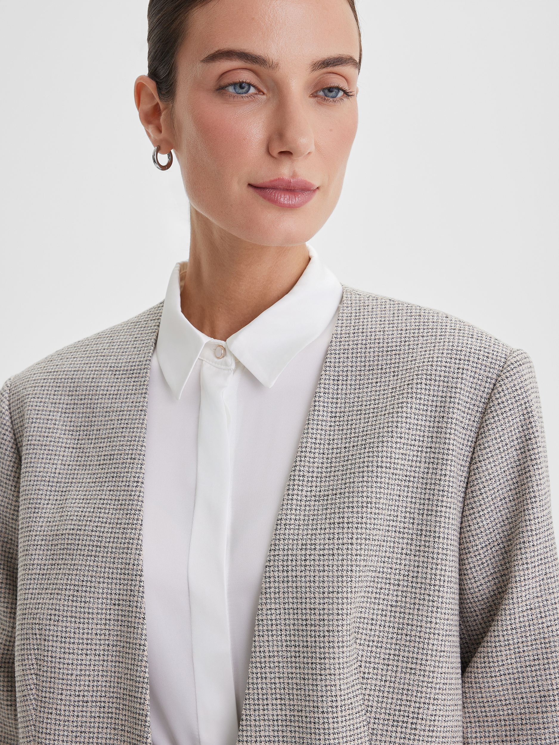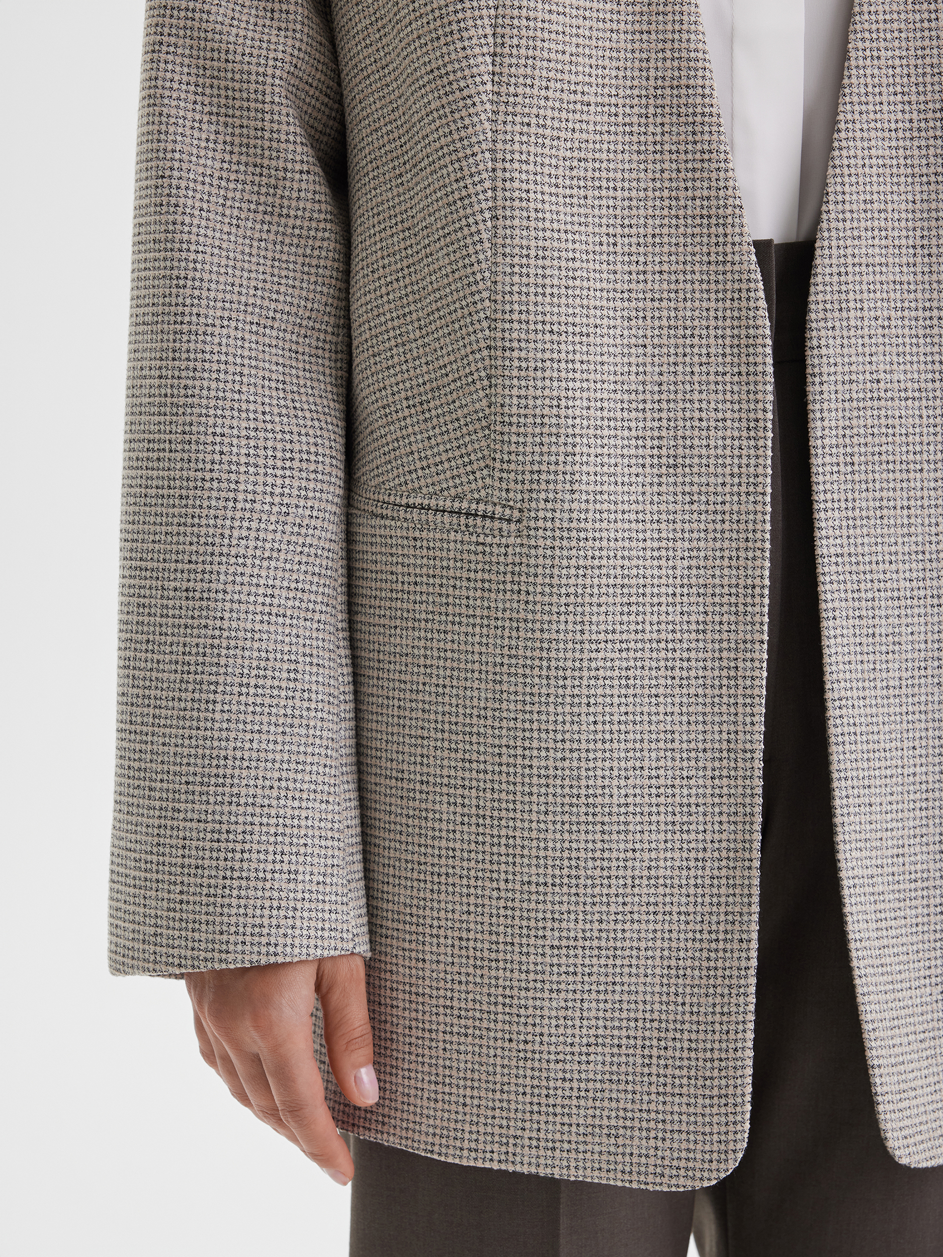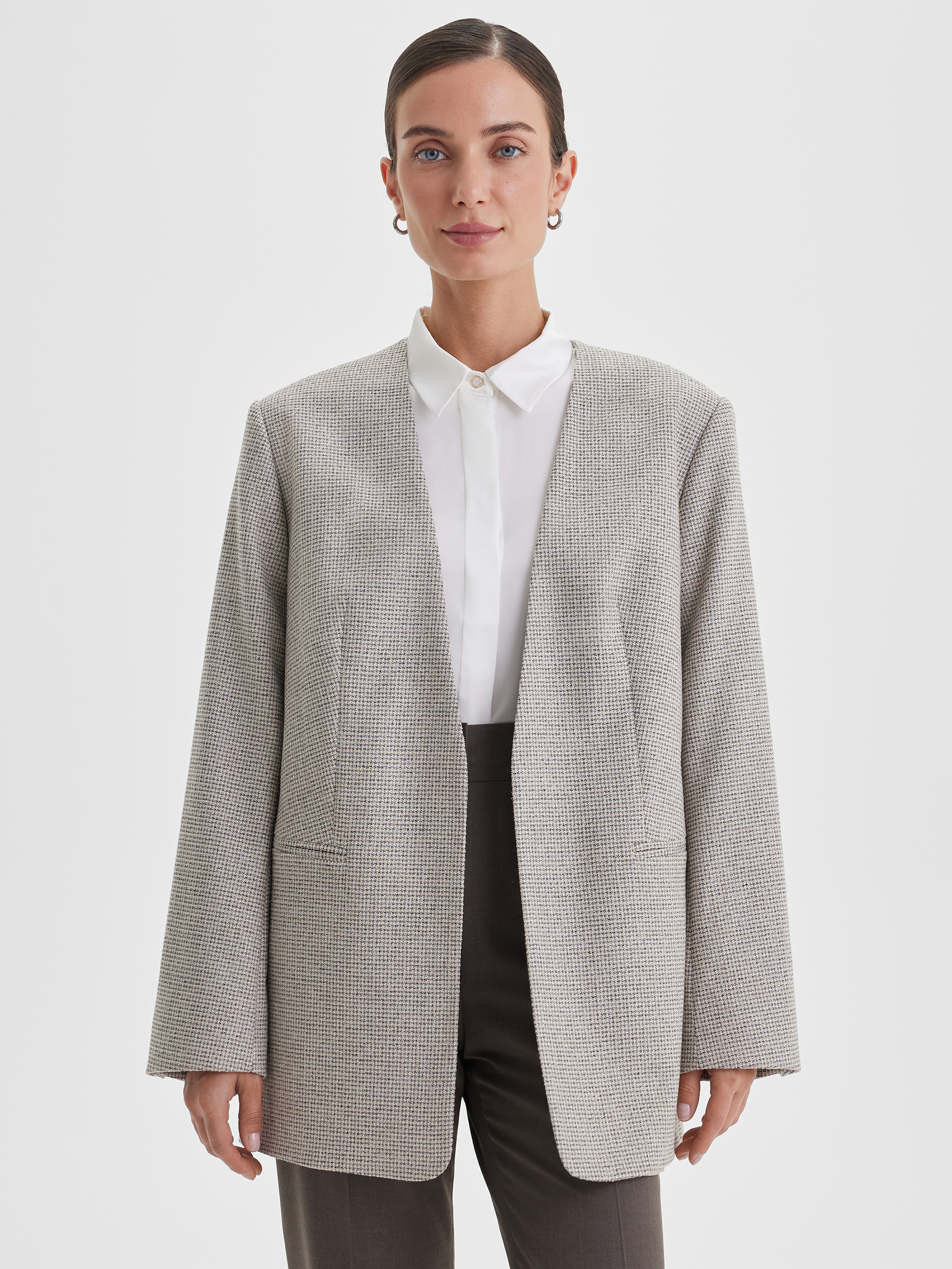Минималистичный жакет в мягком бежевом оттенке с узором «пье де пуль» — стильное решение для повседневных образов. Особенность модели — отсутствие пуговиц, что делает силуэт лаконичным и современным. Ткань мягкая и приятная на ощупь, создаёт ощущение комфорта и уюта.