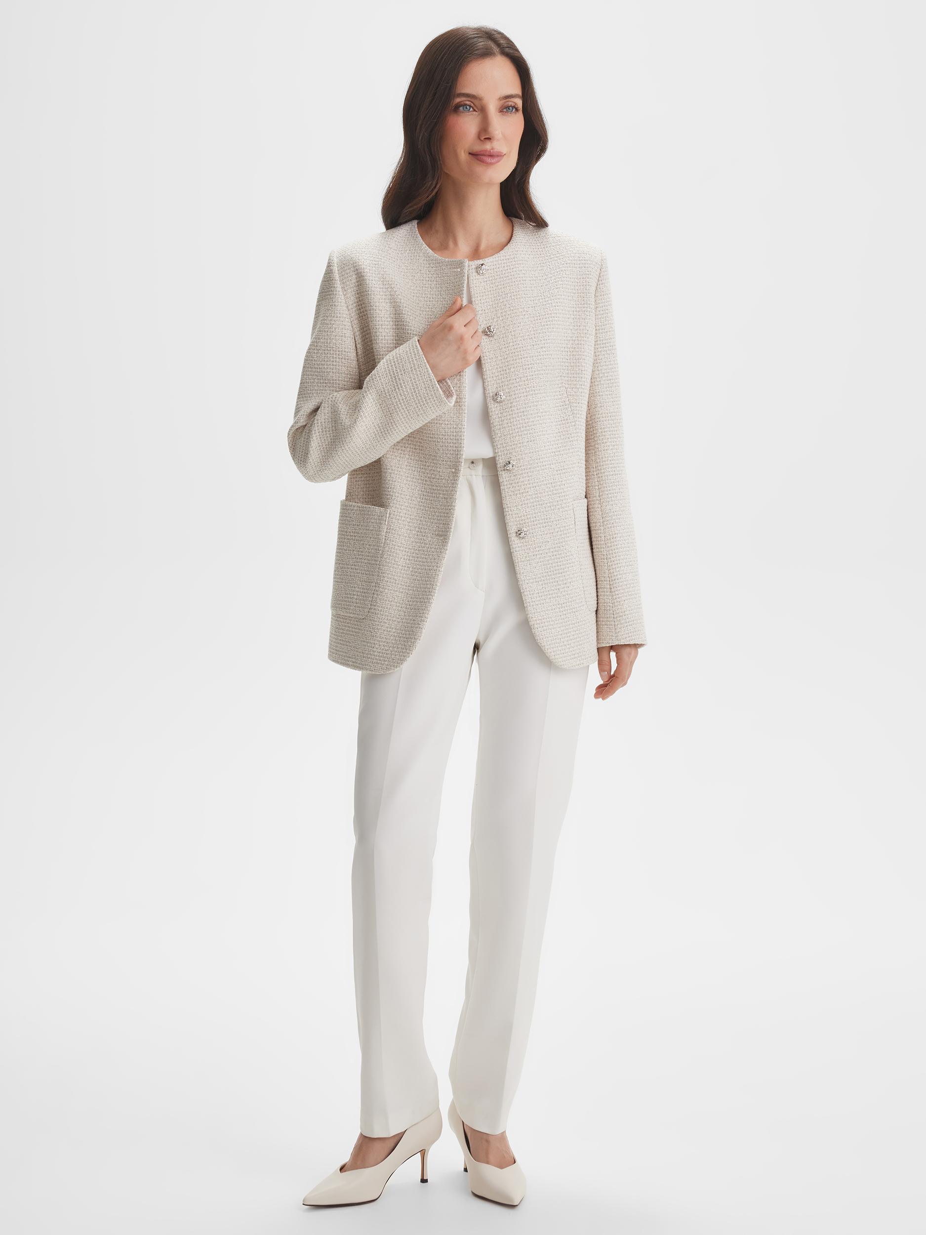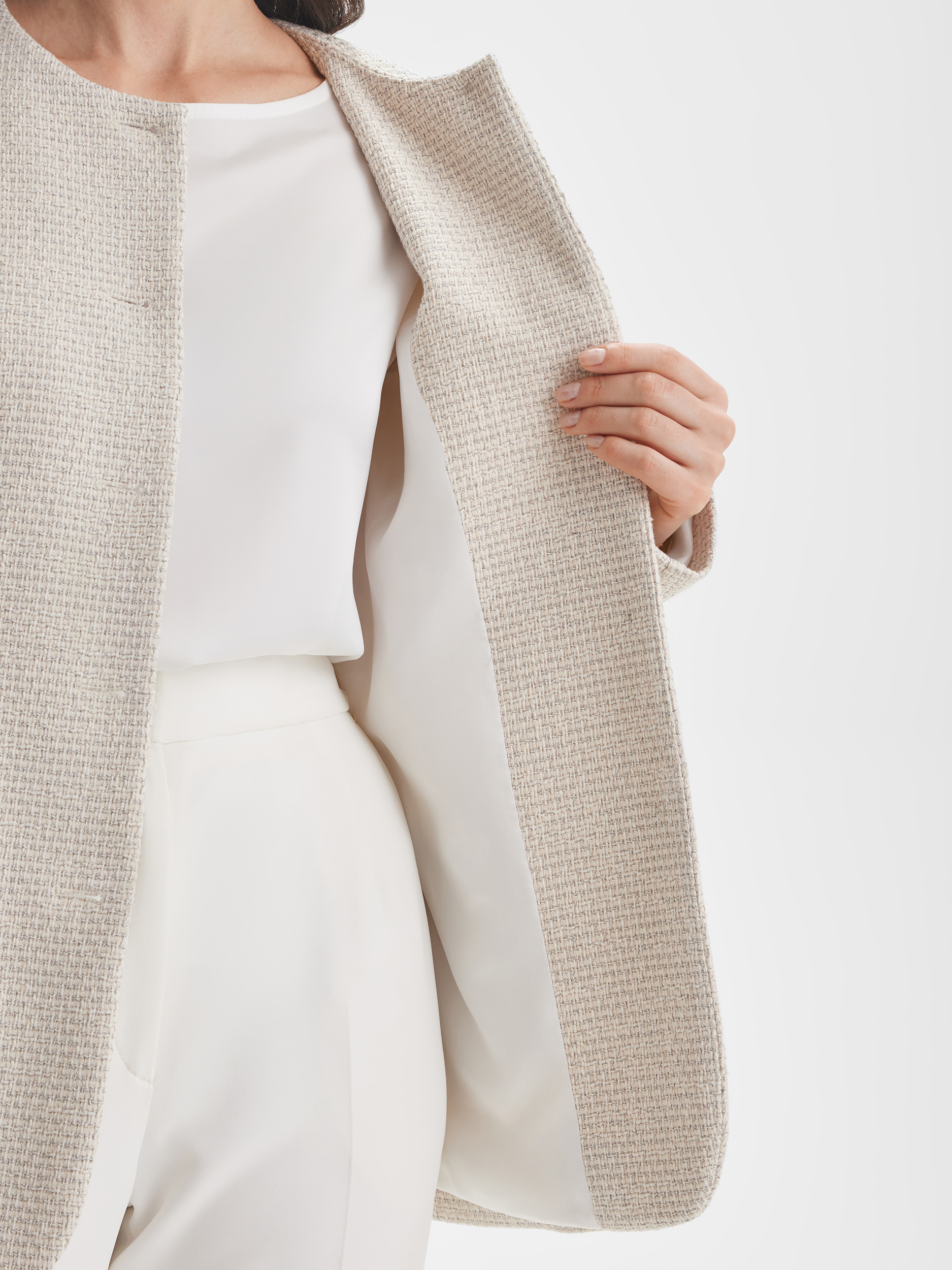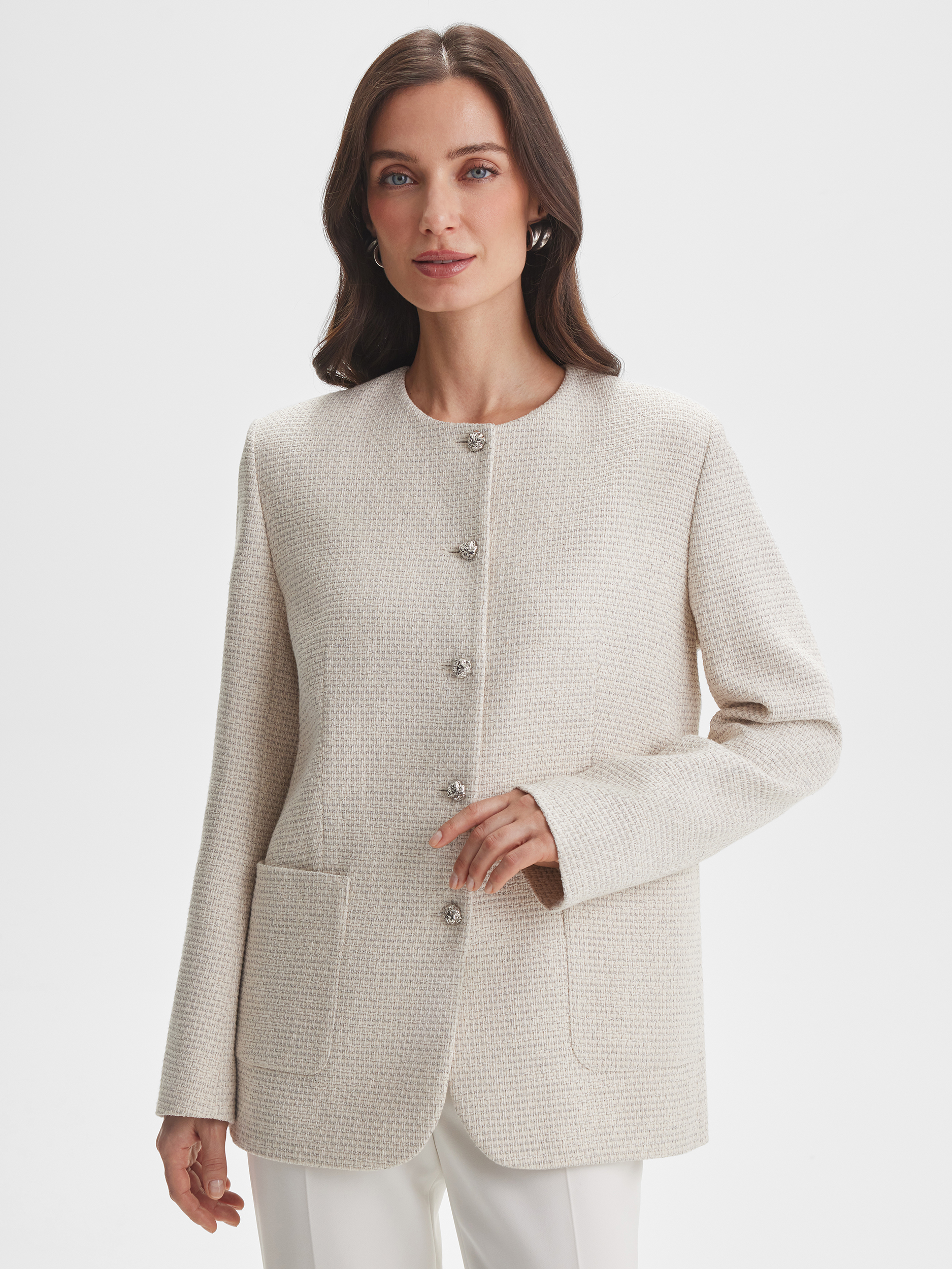 Удлинённый фактурный жакет SINAR прямого силуэта с трендовыми мятыми пуговицами  визуально вытягивает силуэт. Модель выглядит благородно и легко вписывается как в деловые, так и в повседневные образы. В коллекции также представлен укороченный жакет в аналогичном дизайне, что позволяет выбрать наиболее подходящий вариант длины.