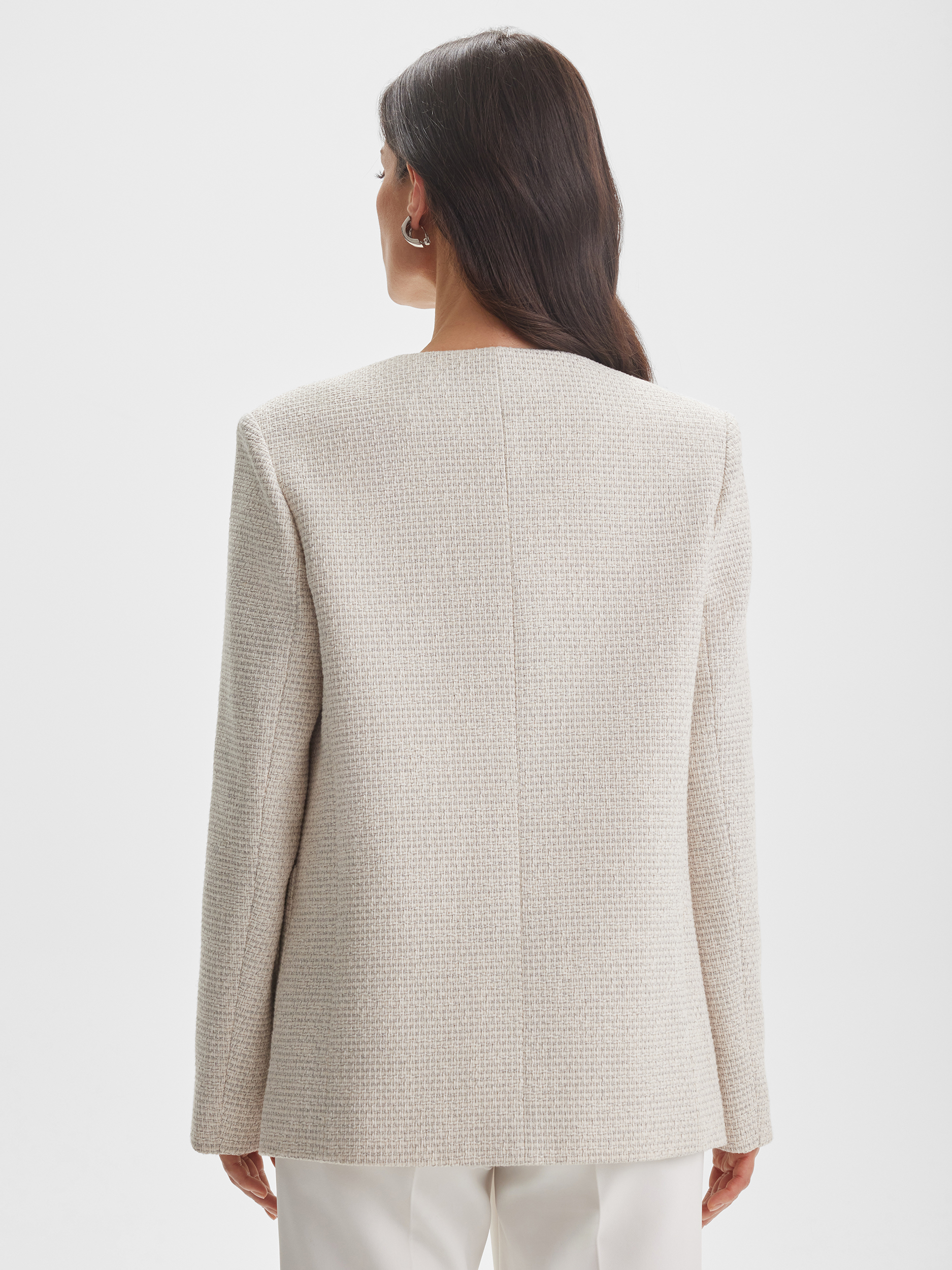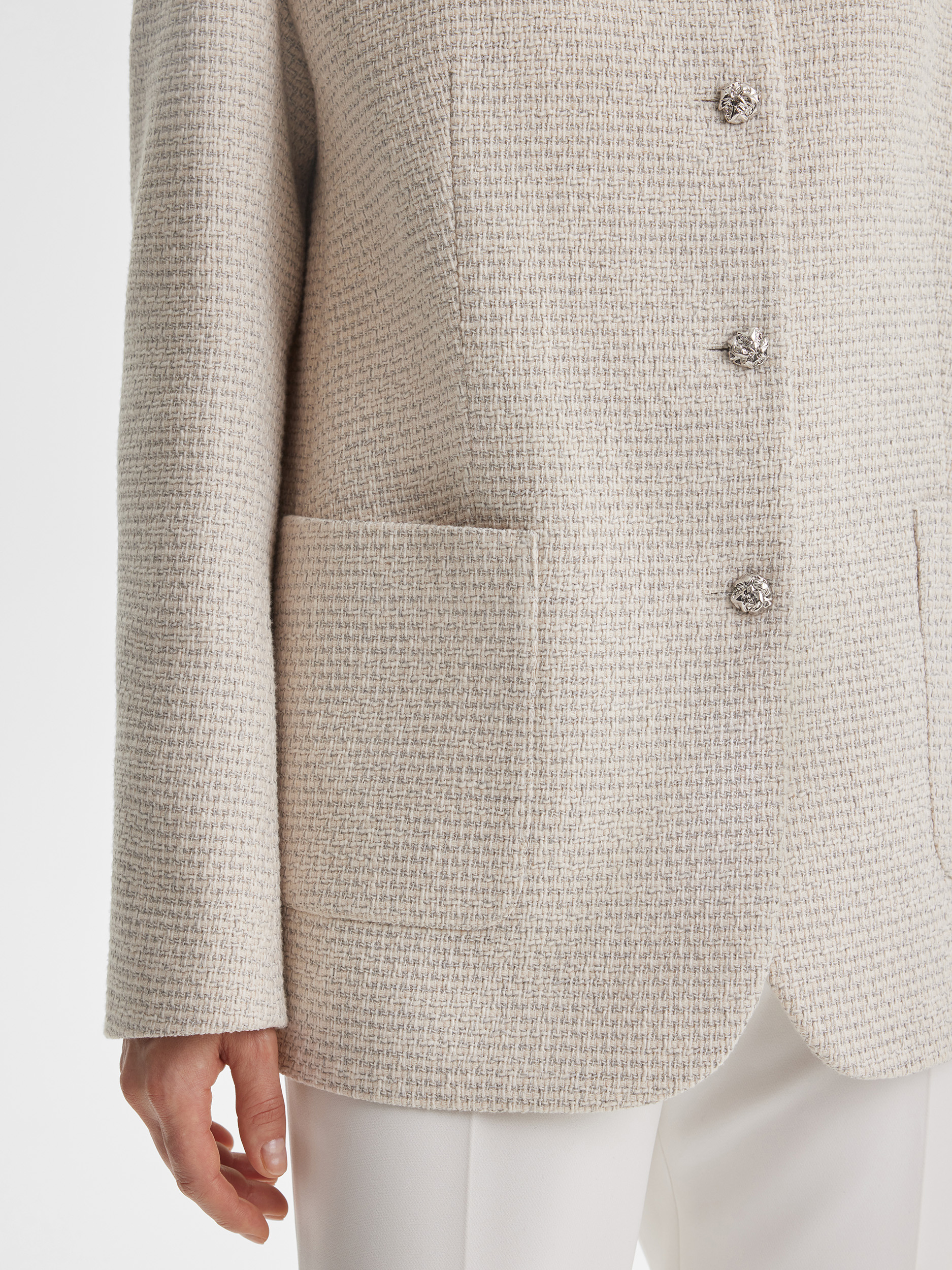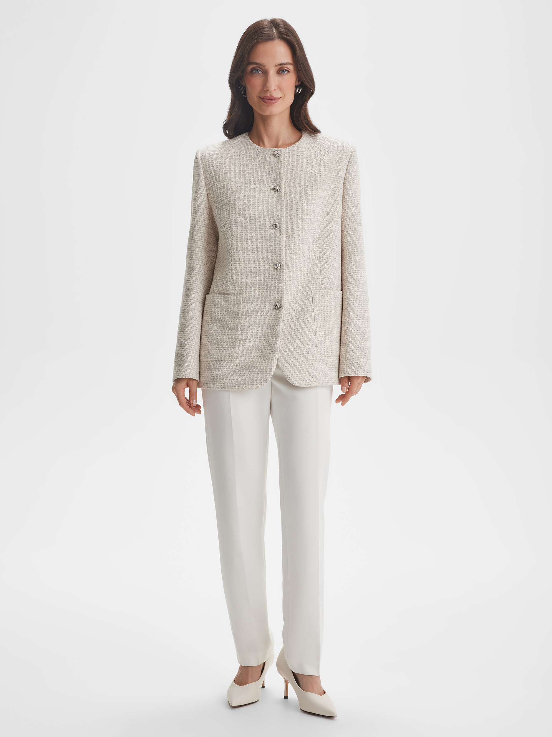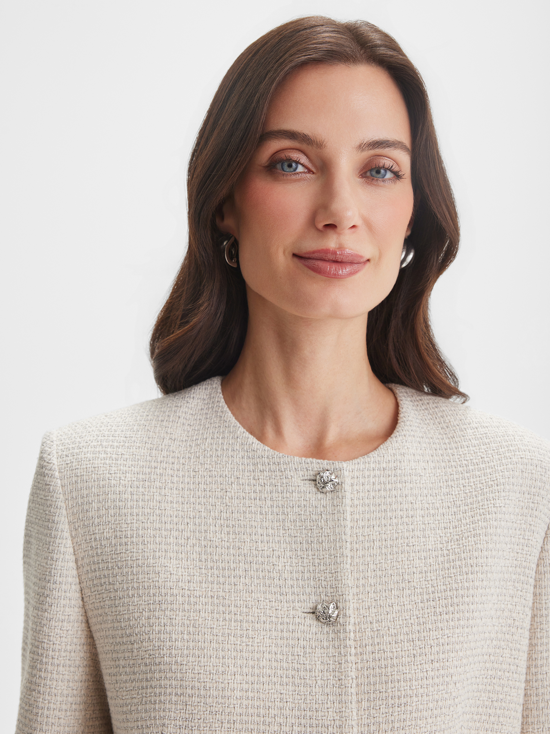 Удлинённый фактурный жакет SINAR прямого силуэта с трендовыми мятыми пуговицами  визуально вытягивает силуэт. Модель выглядит благородно и легко вписывается как в деловые, так и в повседневные образы. В коллекции также представлен укороченный жакет в аналогичном дизайне, что позволяет выбрать наиболее подходящий вариант длины.