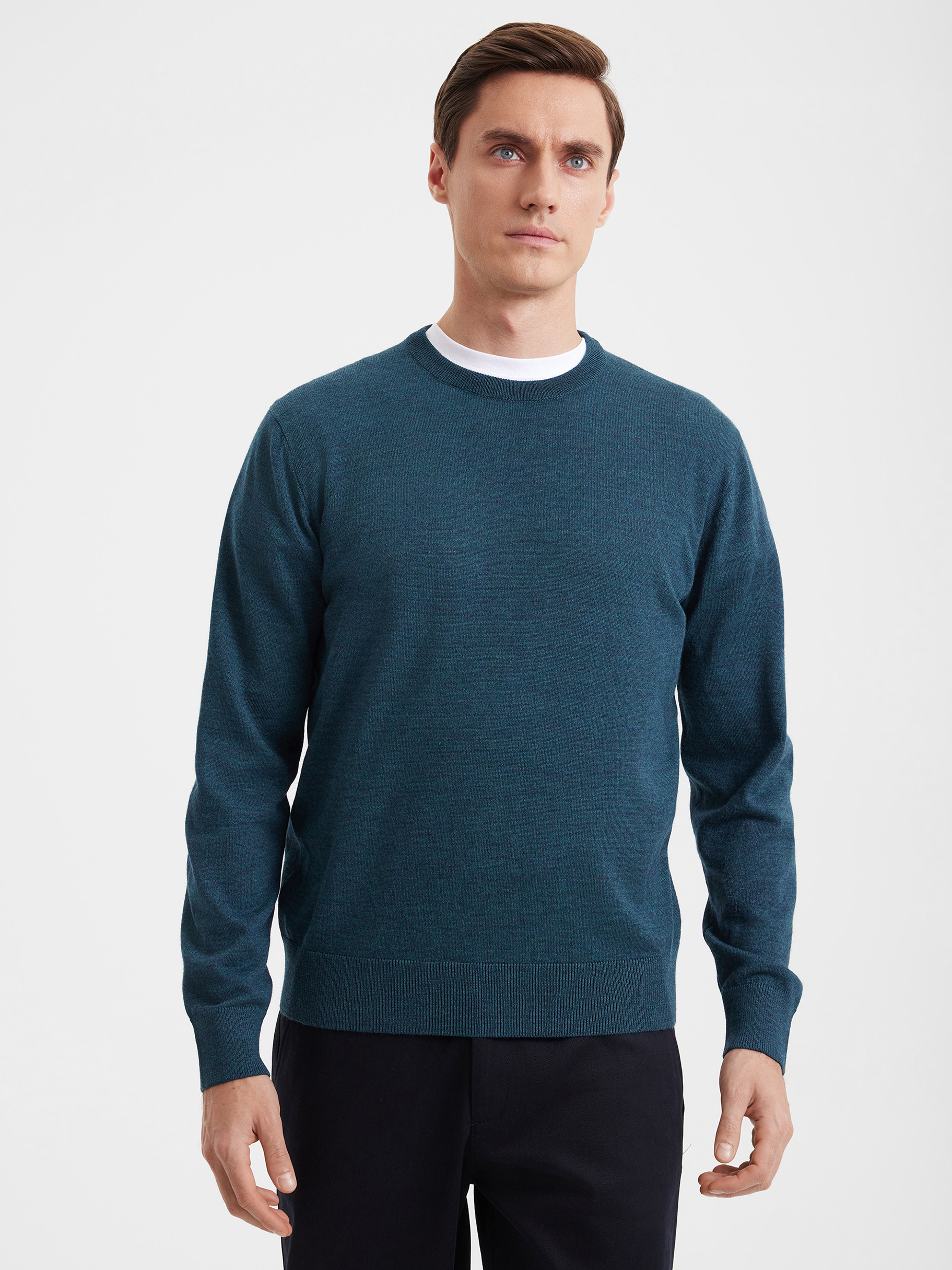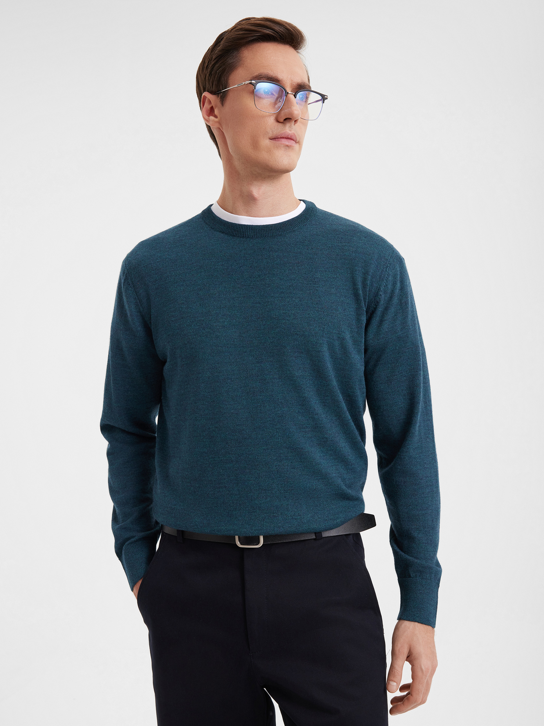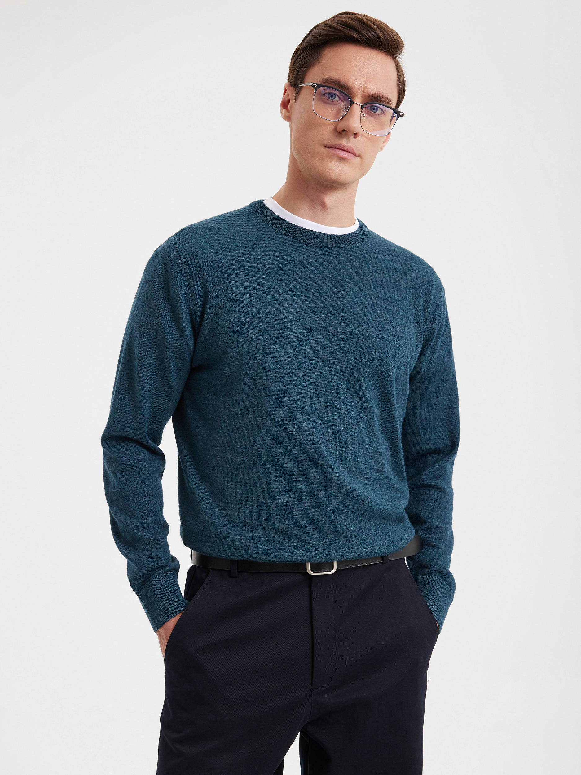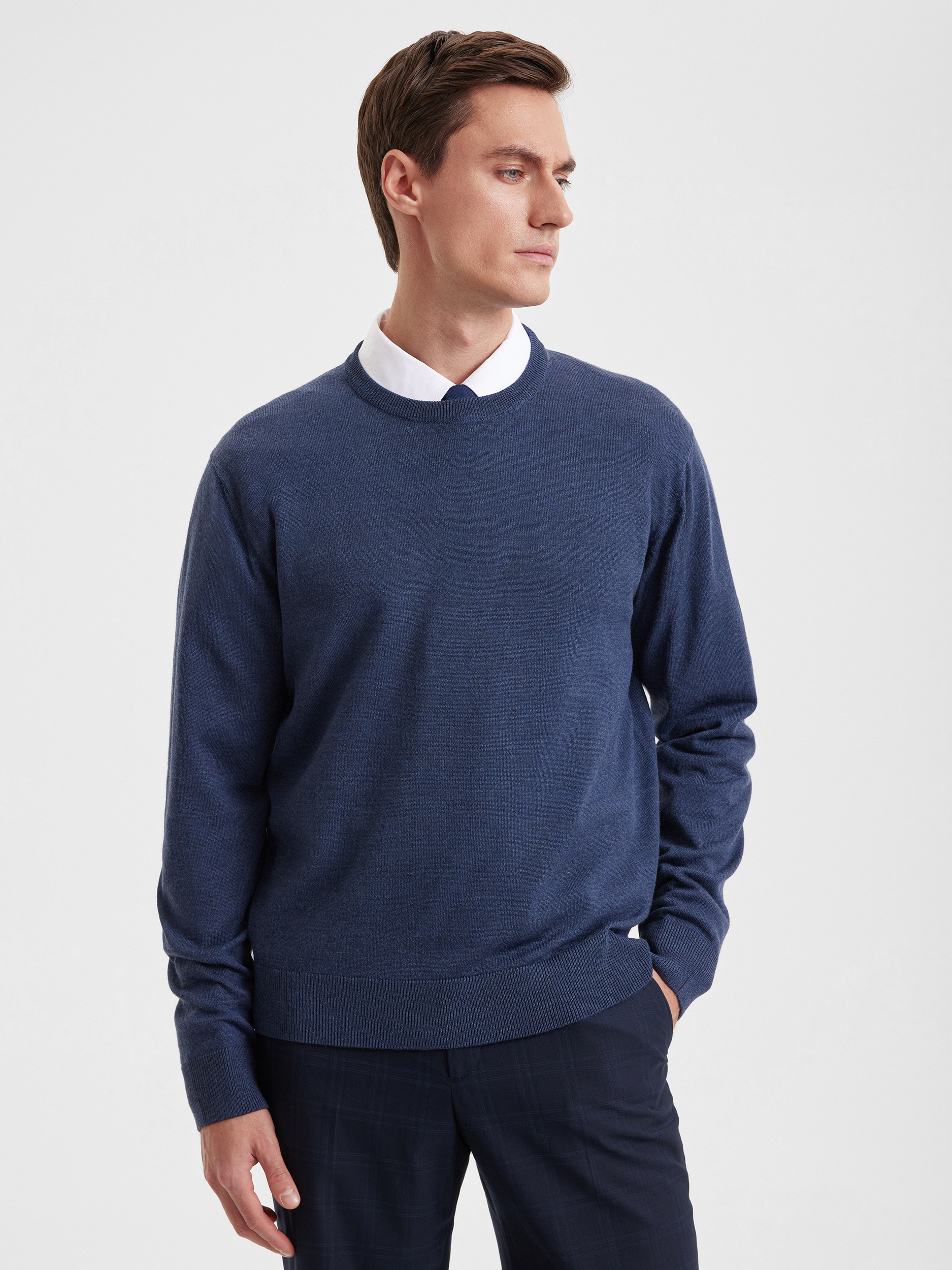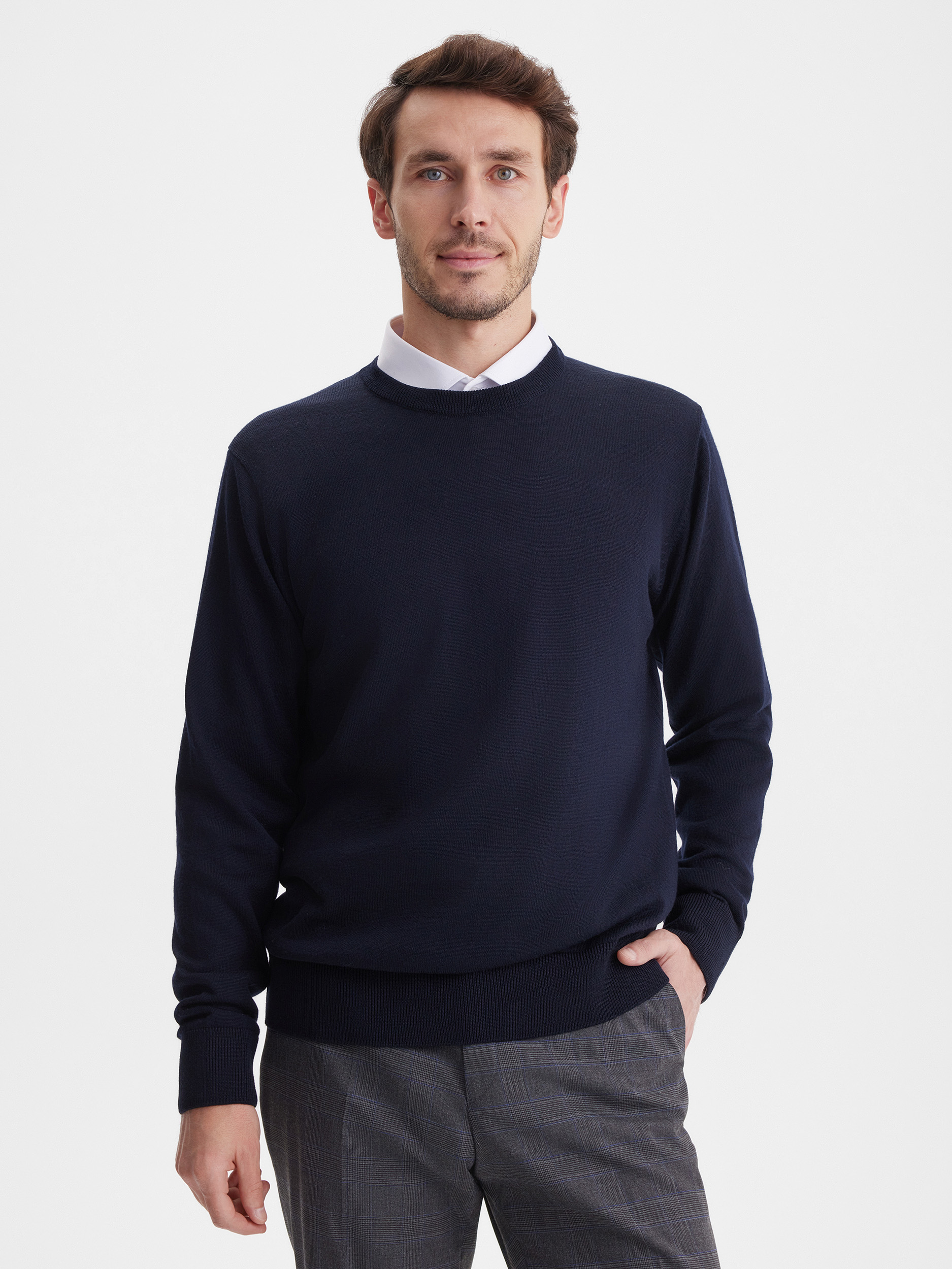 Тонкий класический джемпер из смесового трикотажа. В составе тонкая шерсть мериносовых овец и акрил. Круглый вырез, прямой рукав. Универсальная модель в урбанистическом стиле, базовая вещь для создания стильных повседневных аутфитов для офиса, прогулок и путешествий.