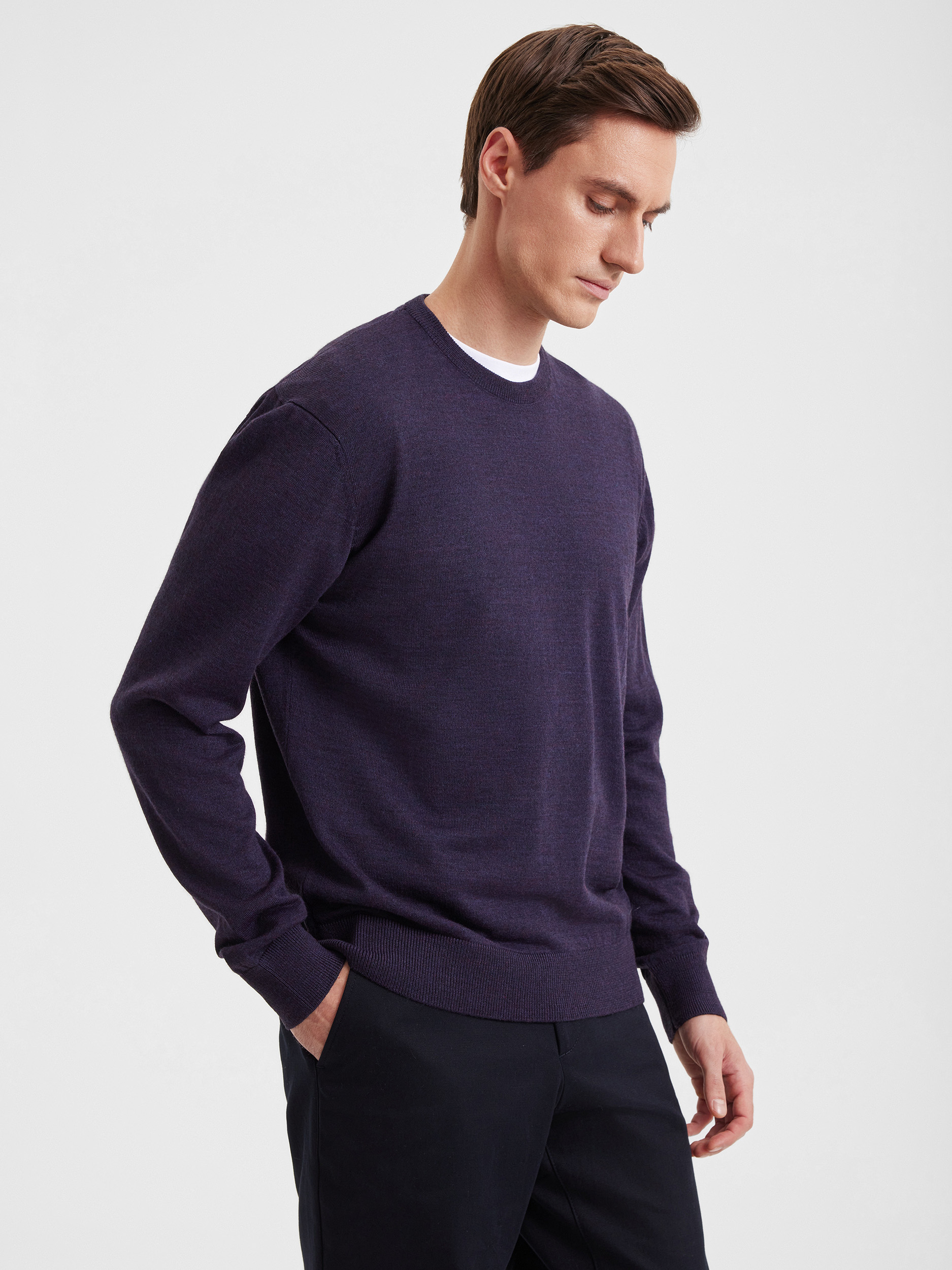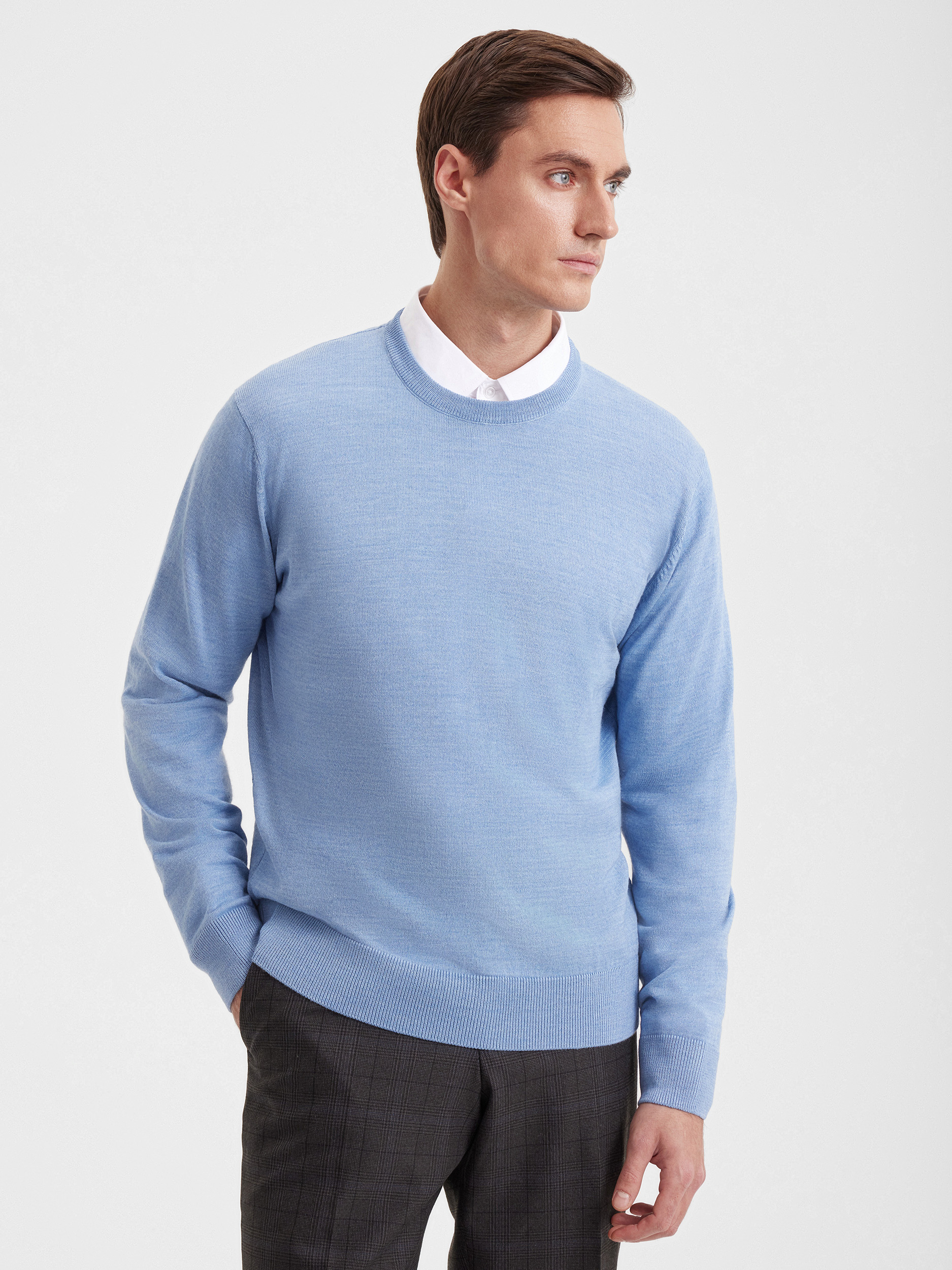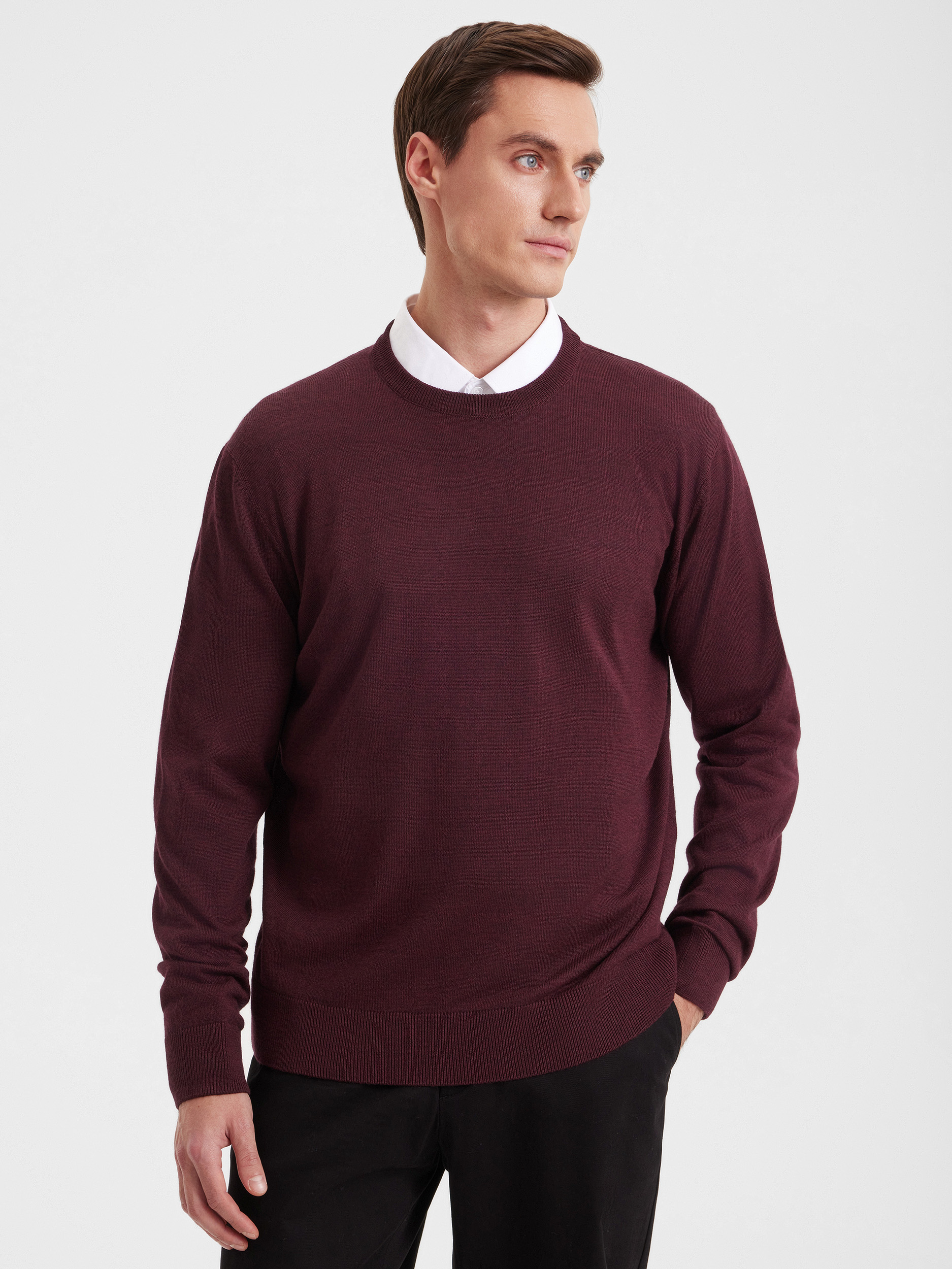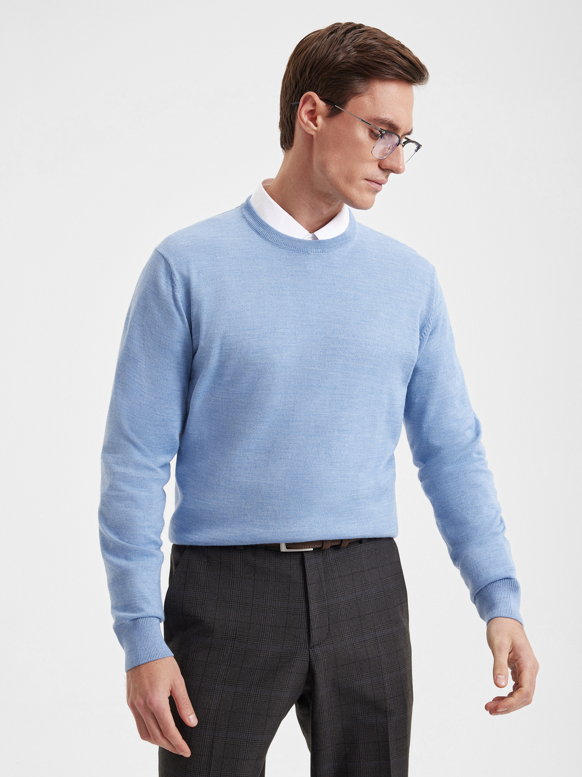 Тонкий класический джемпер из смесового трикотажа. В составе тонкая шерсть мериносовых овец и акрил. Круглый вырез, прямой рукав. Универсальная модель в урбанистическом стиле, базовая вещь для создания стильных повседневных аутфитов для офиса, прогулок и путешествий.