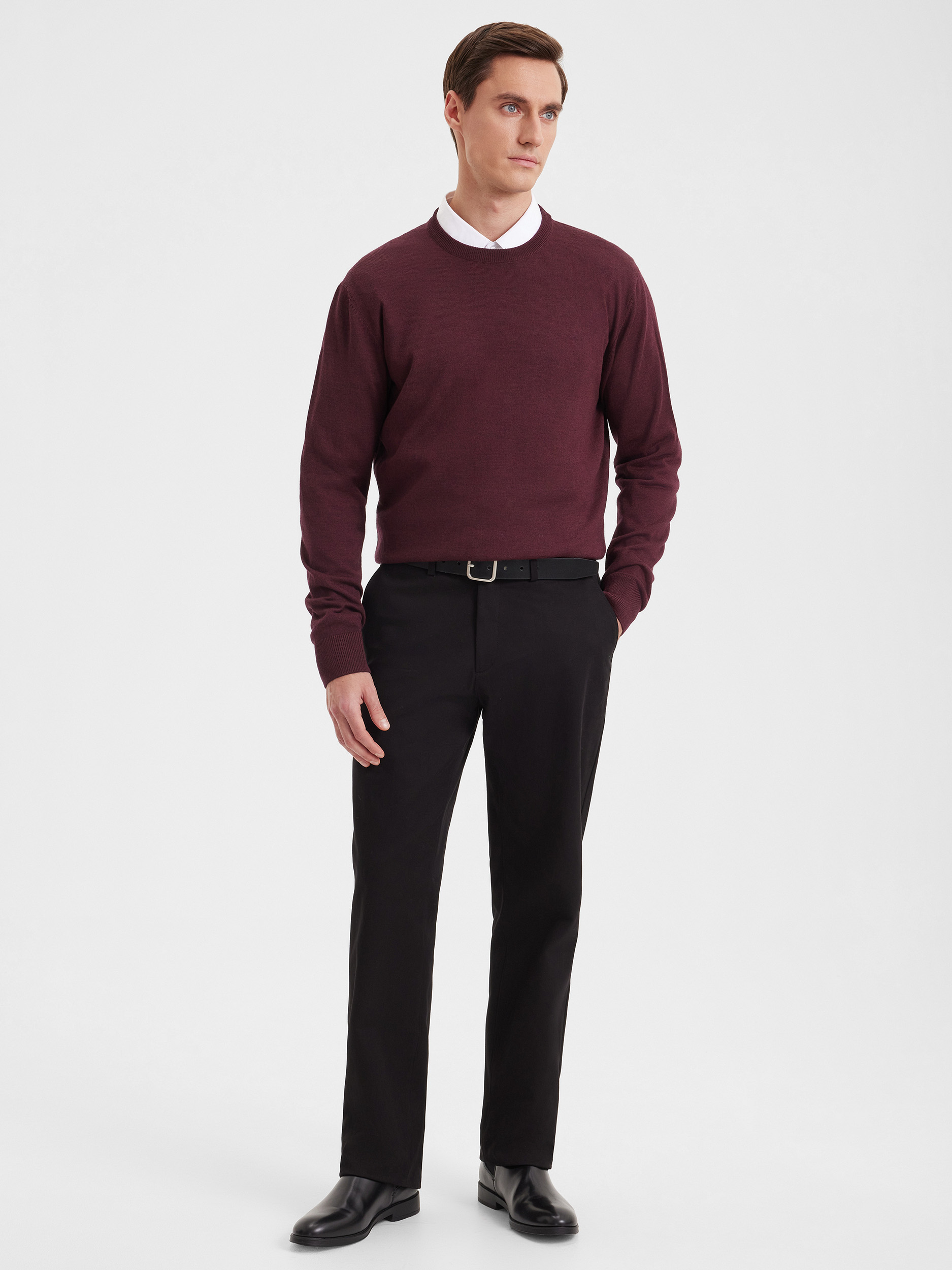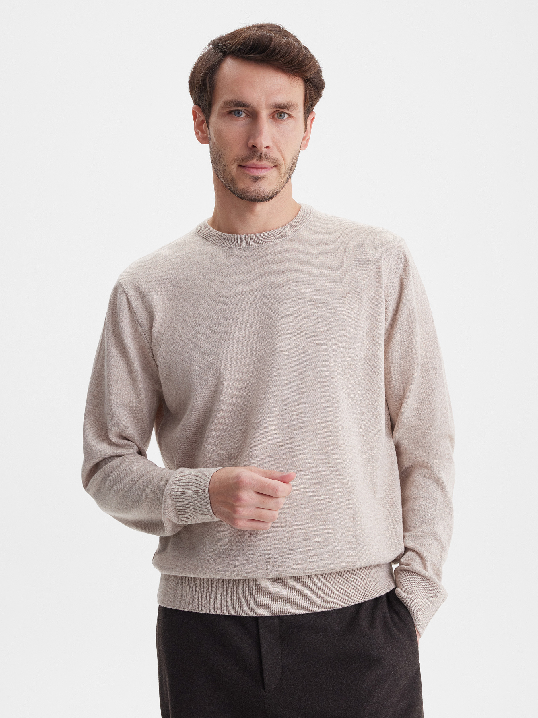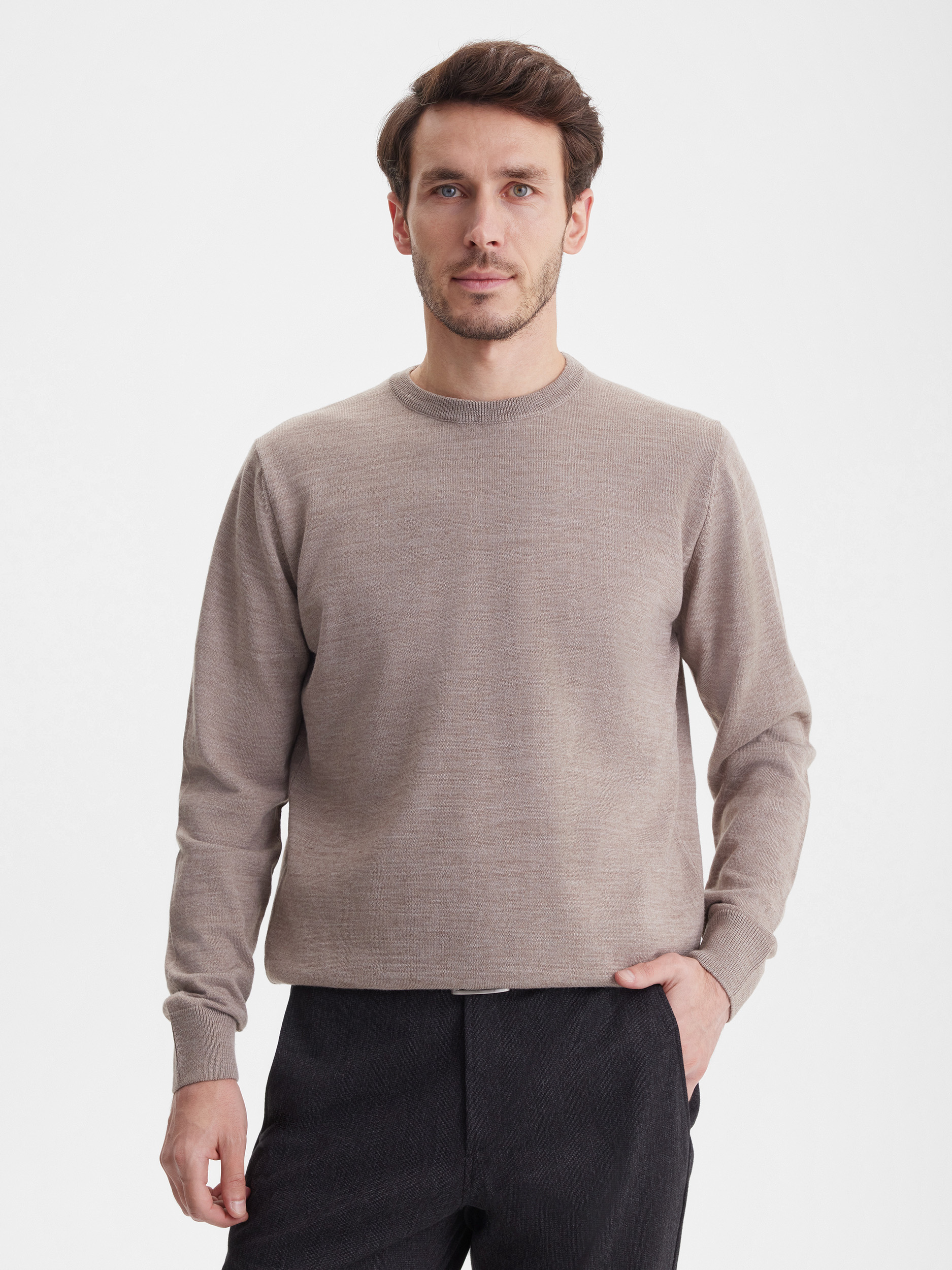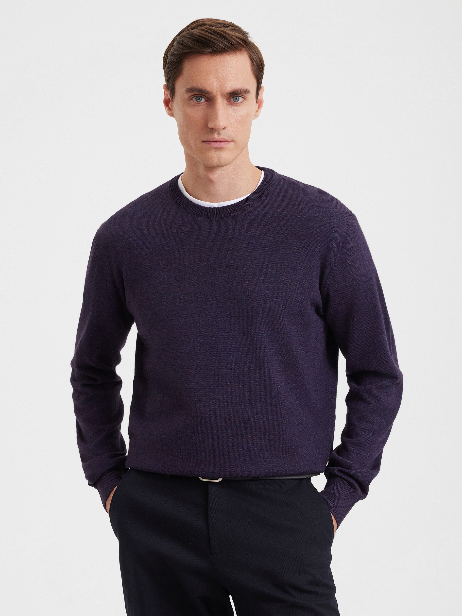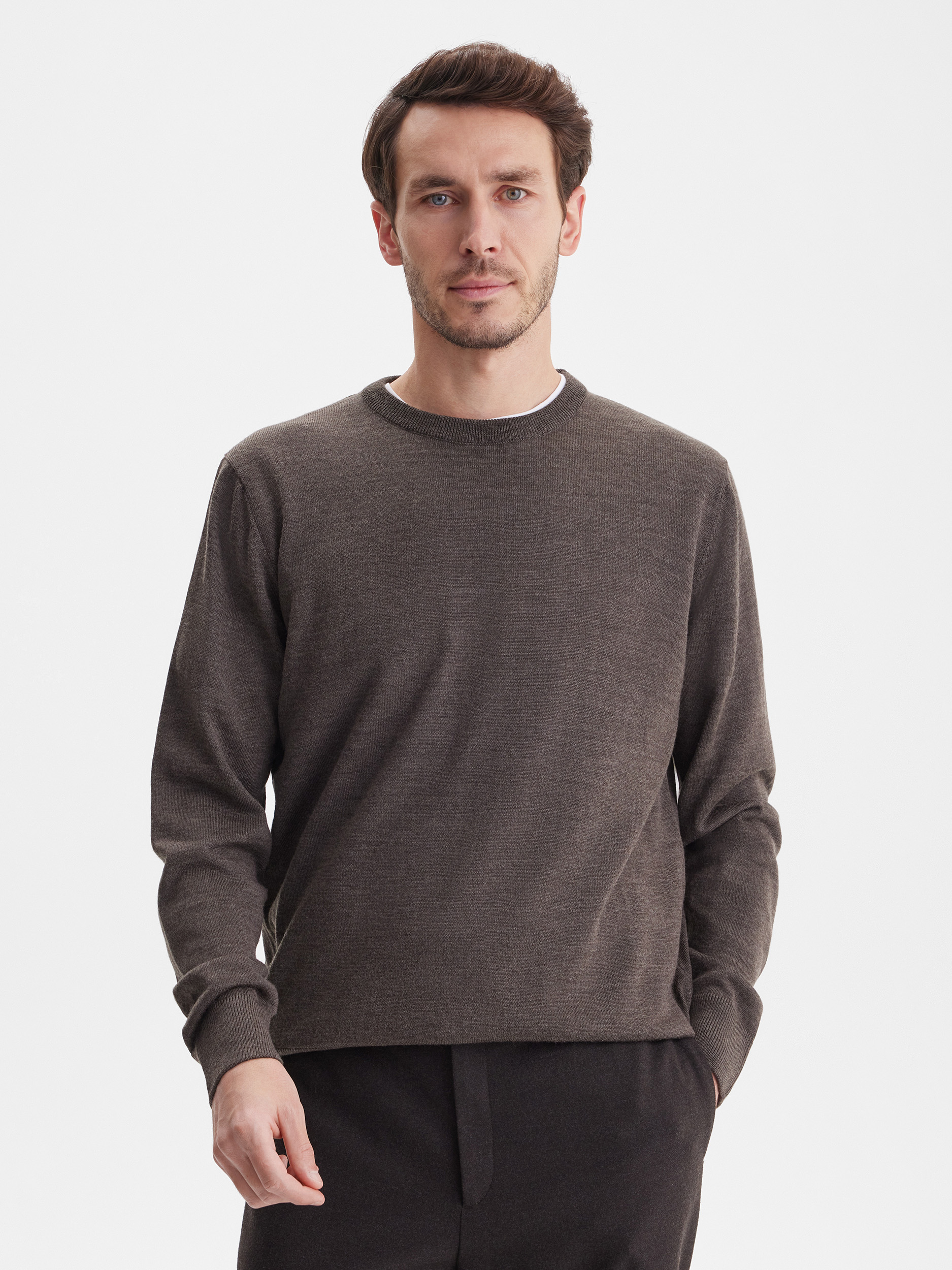 Тонкий класический джемпер из смесового трикотажа. В составе тонкая шерсть мериносовых овец и акрил. Круглый вырез, прямой рукав. Универсальная модель в урбанистическом стиле, базовая вещь для создания стильных повседневных аутфитов для офиса, прогулок и путешествий.