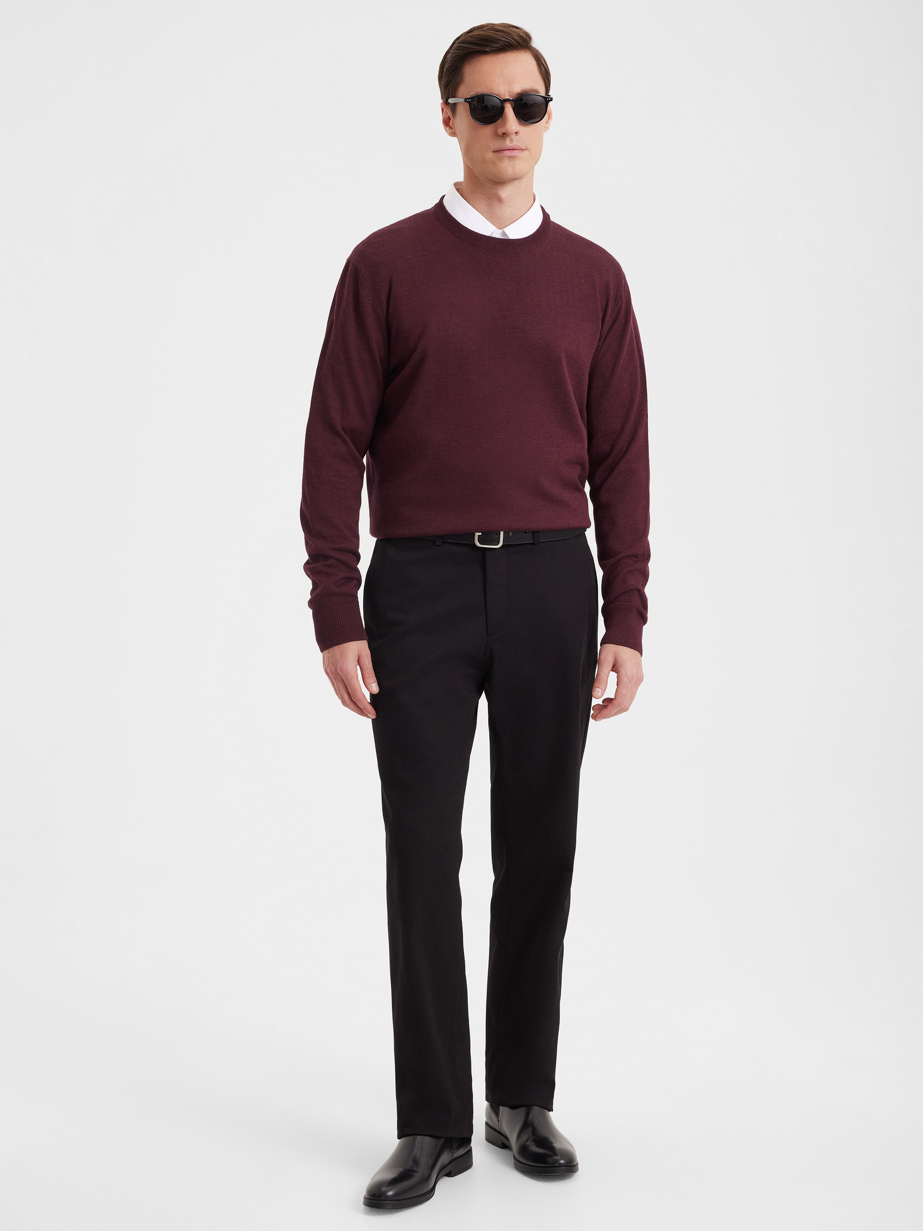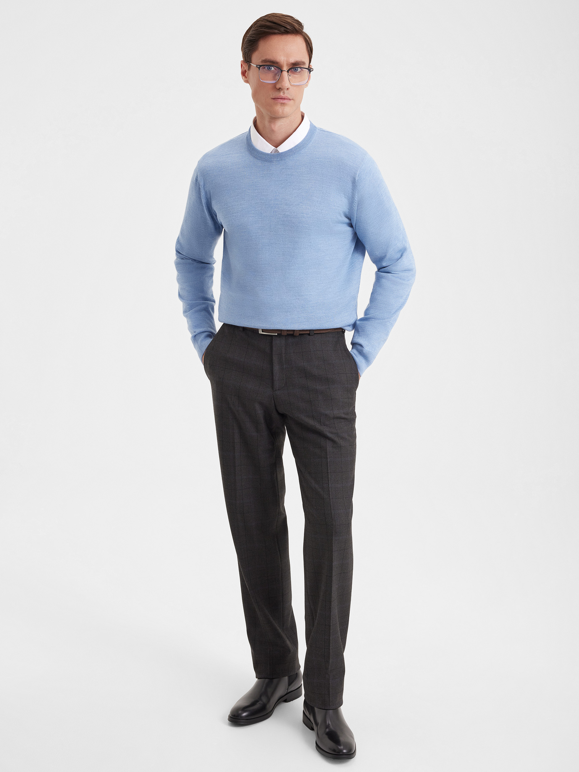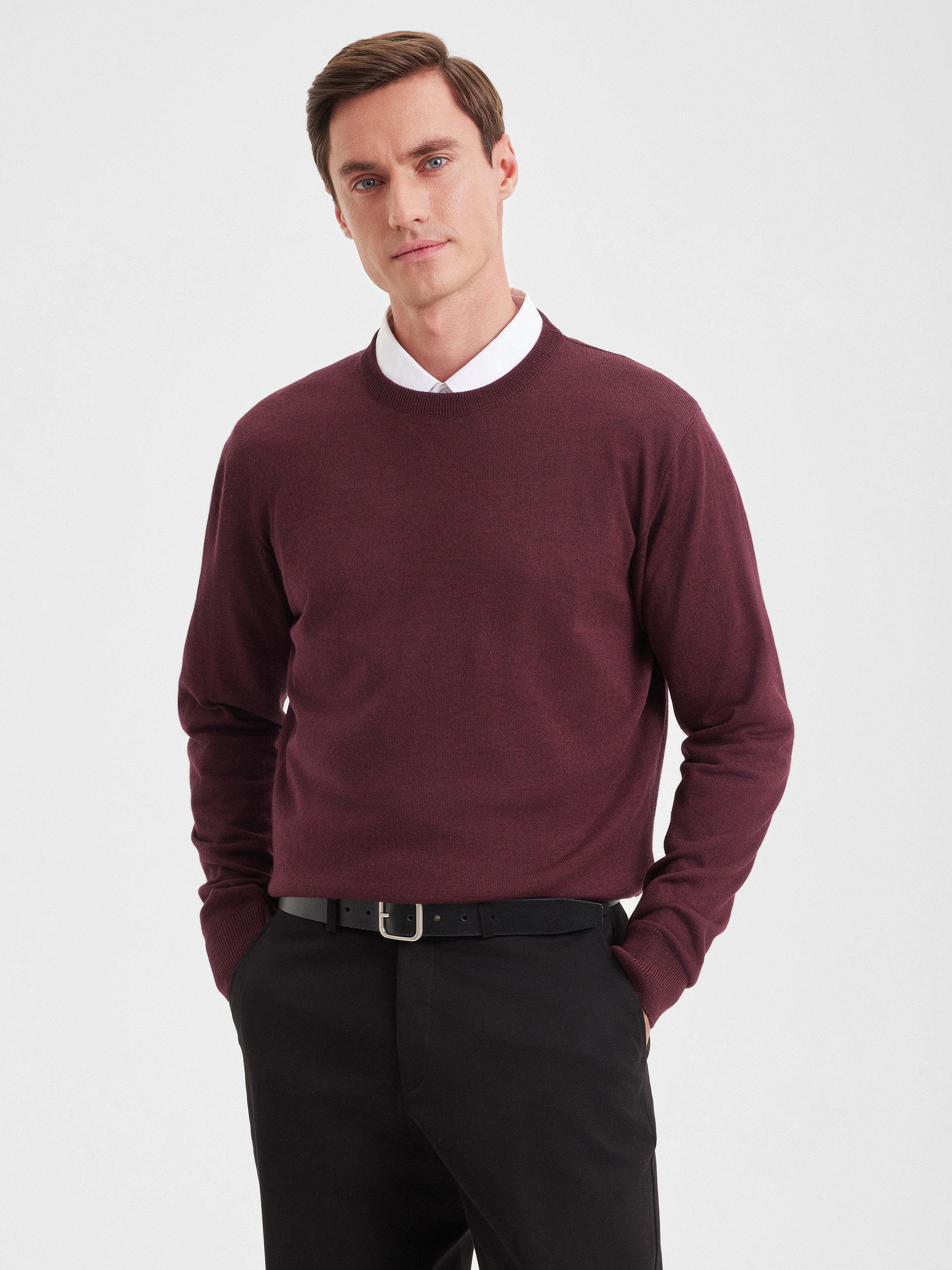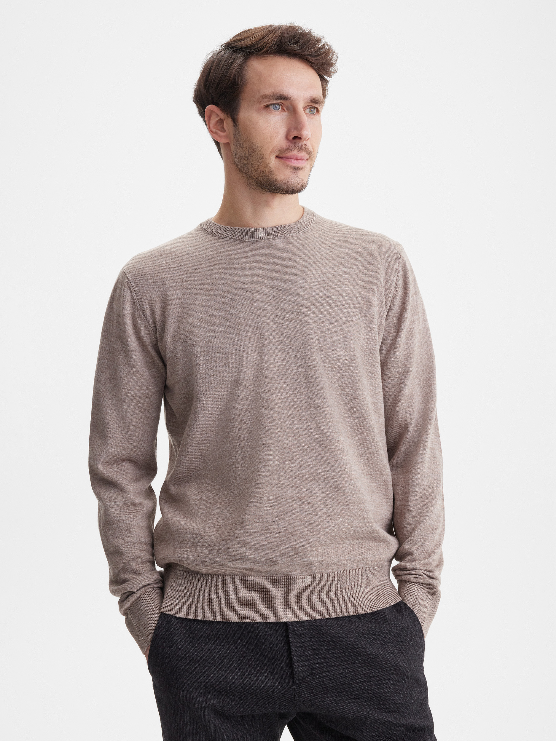 Тонкий класический джемпер из смесового трикотажа. В составе тонкая шерсть мериносовых овец и акрил. Круглый вырез, прямой рукав. Универсальная модель в урбанистическом стиле, базовая вещь для создания стильных повседневных аутфитов для офиса, прогулок и путешествий.