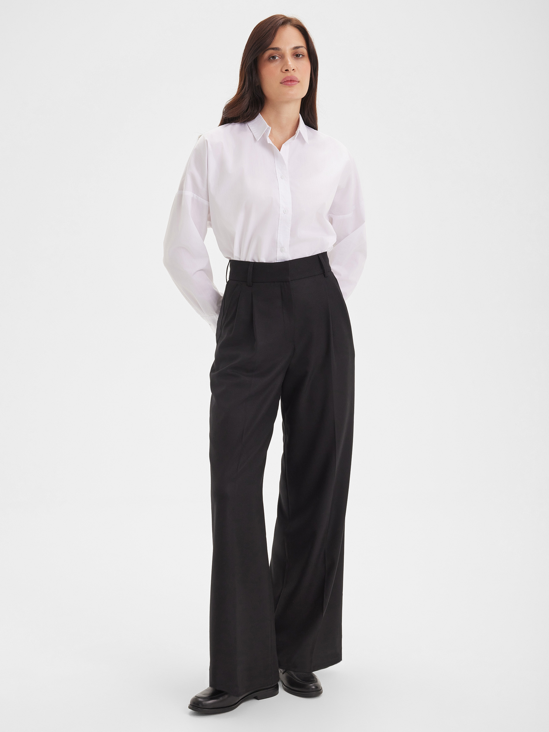Брюки-палаццо SINAR чёрного цвета выглядят элегантно и изысканно, создавая свободный и женственный силуэт. Скрытый замок обеспечивает аккуратную посадку, а шлёвки позволяют дополнить образ ремнём, подчёркивая индивидуальный стиль.