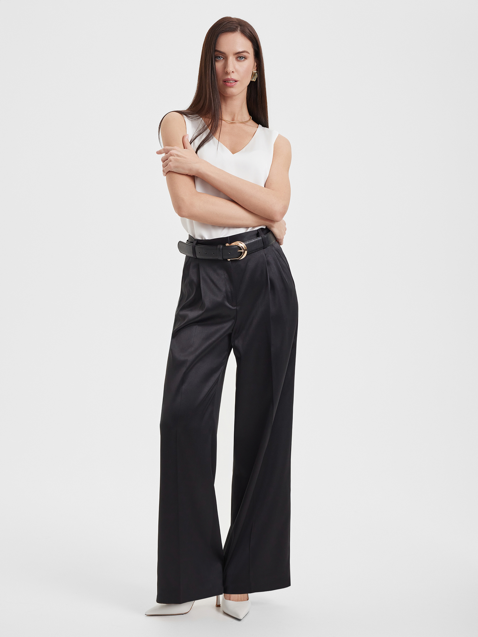 Брюки-палаццо SINAR из струящейся блестящей ткани чёрного цвета создают элегантный и женственный силуэт с лёгкой динамикой при движении. Скрытый замок обеспечивает аккуратную посадку, а шлёвки на поясе позволяют добавить ремень и подчеркнуть индивидуальный стиль. Эта модель идеально подходит для вечерних, деловых и стильных повседневных образов, создавая ощущение лёгкости и изящества.