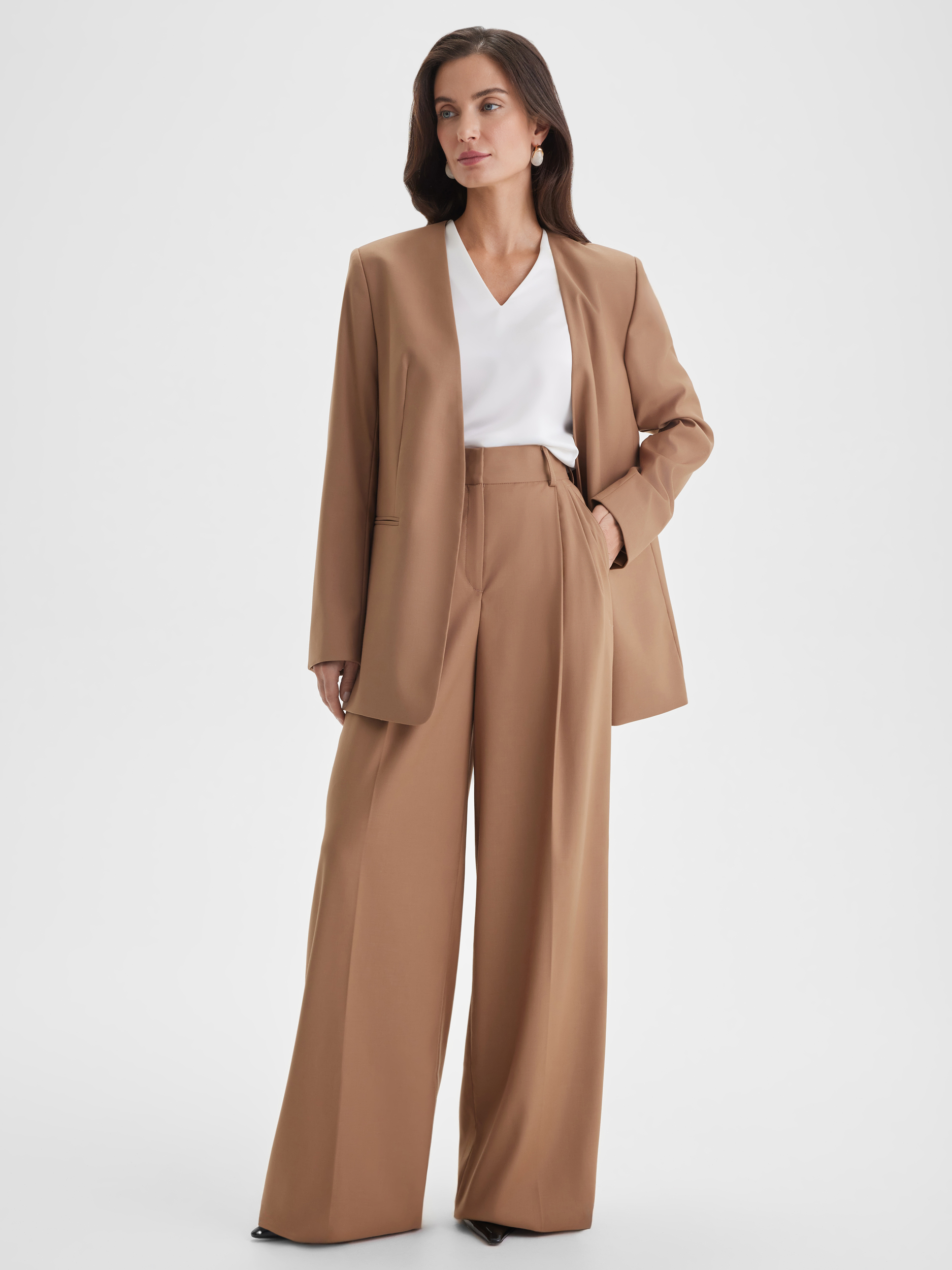 Прямые брюки в золотисто-карамельном оттенке, напоминающем солнечные осенние дни. Тёплый цвет и элегантный крой создают универсальный образ, подходящий как для повседневной носки, так и для особых мероприятий. Модель выполнена в одной капсуле с жакетом, что позволяет составить гармоничный и выразительный комплект.