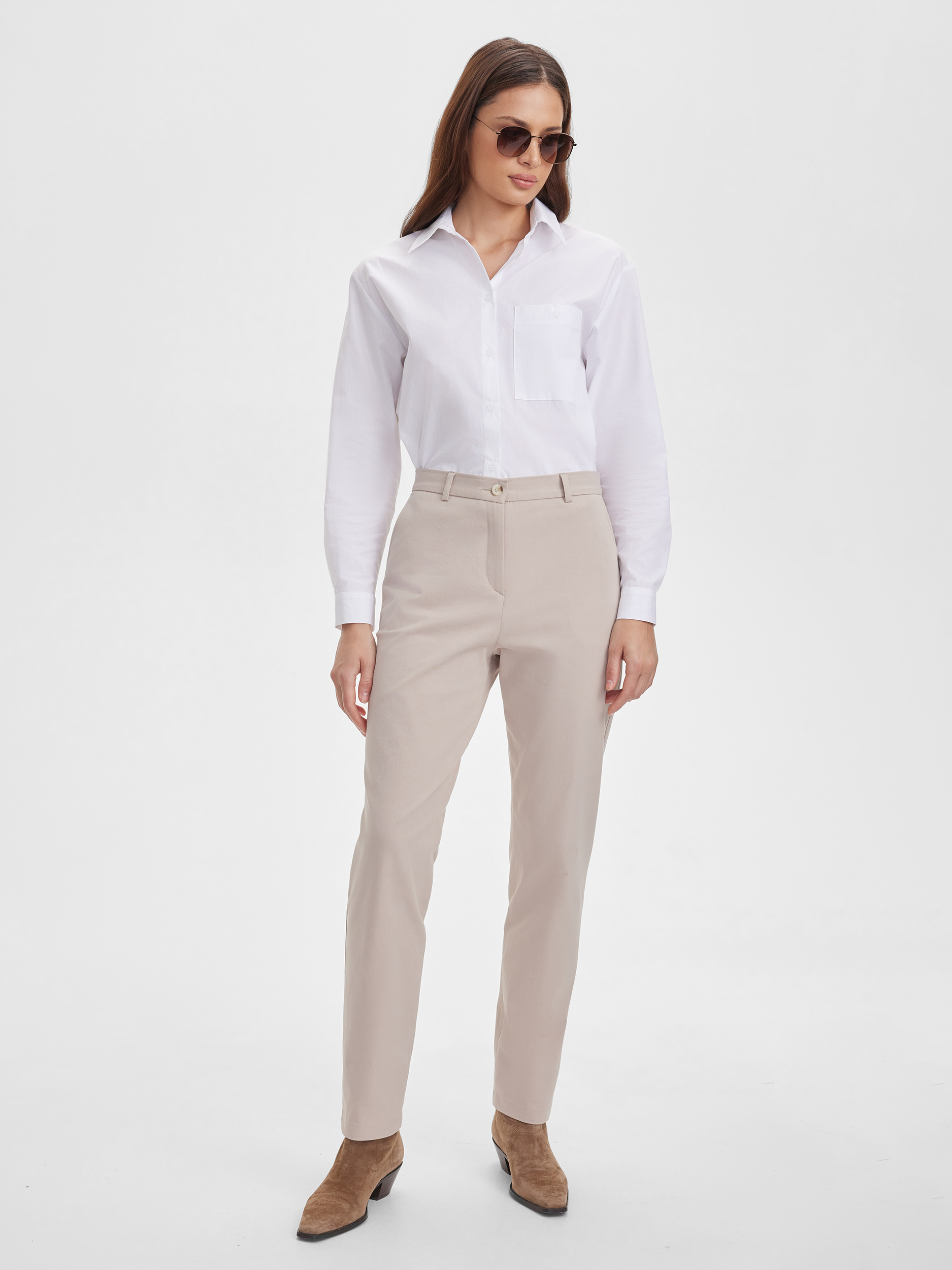 Зауженные брюки SINAR кремового цвета выглядят лаконично и элегантно, подчёркивая аккуратный силуэт. Шлёвки для ремня позволяют дополнить образ аксессуаром, придавая модели индивидуальность и завершённость.