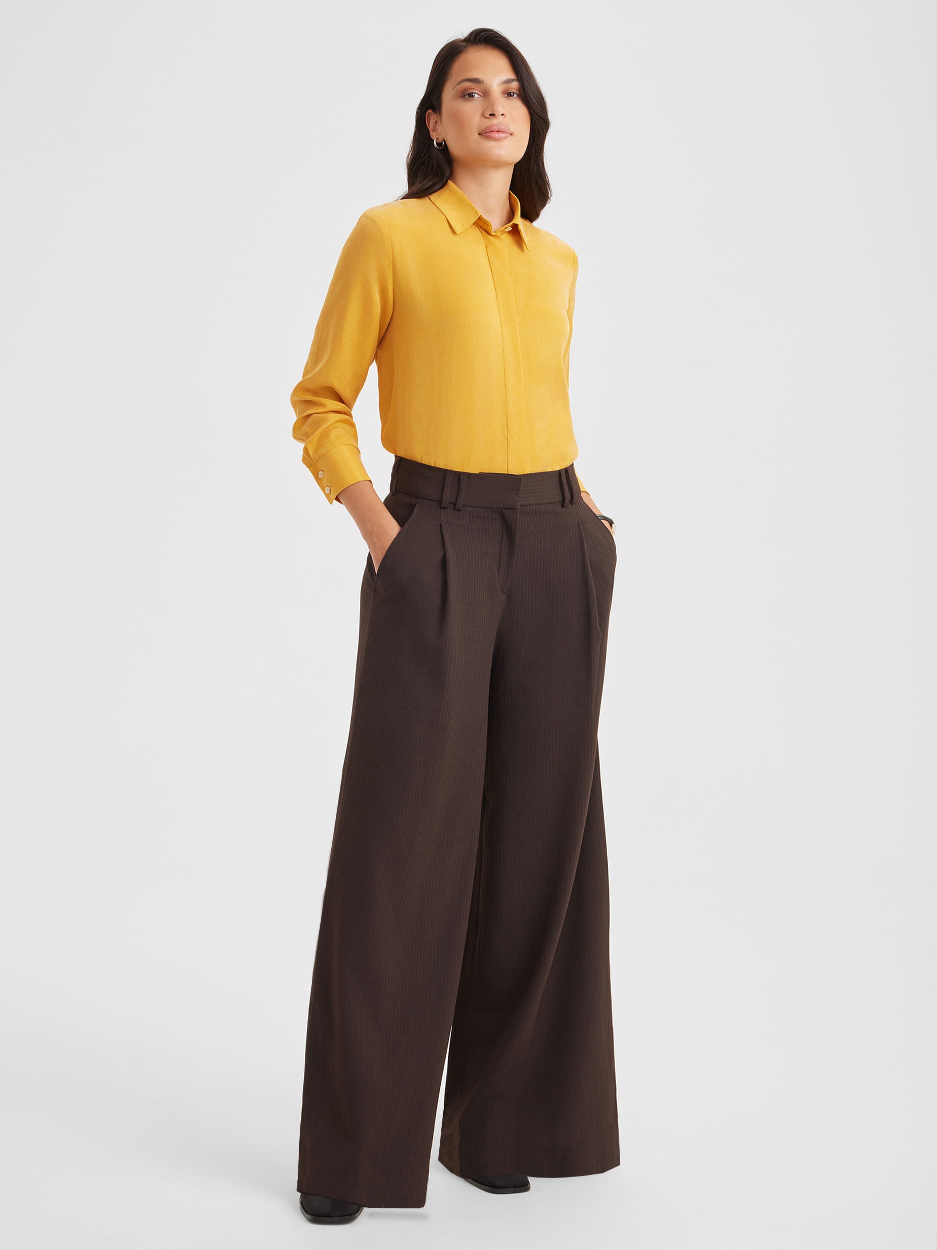 Оверсайз брюки SINAR коричневого цвета с фактурной полоской выглядят современно и стильно, создавая свободный и комфортный силуэт. Шлёвки для ремня позволяют добавить аксессуар и подчеркнуть индивидуальный стиль. В коллекции представлены жакет и костюмный жилет из той же ткани, благодаря чему можно собрать элегантный костюм-тройку и создавать разнообразные гармоничные образы.
