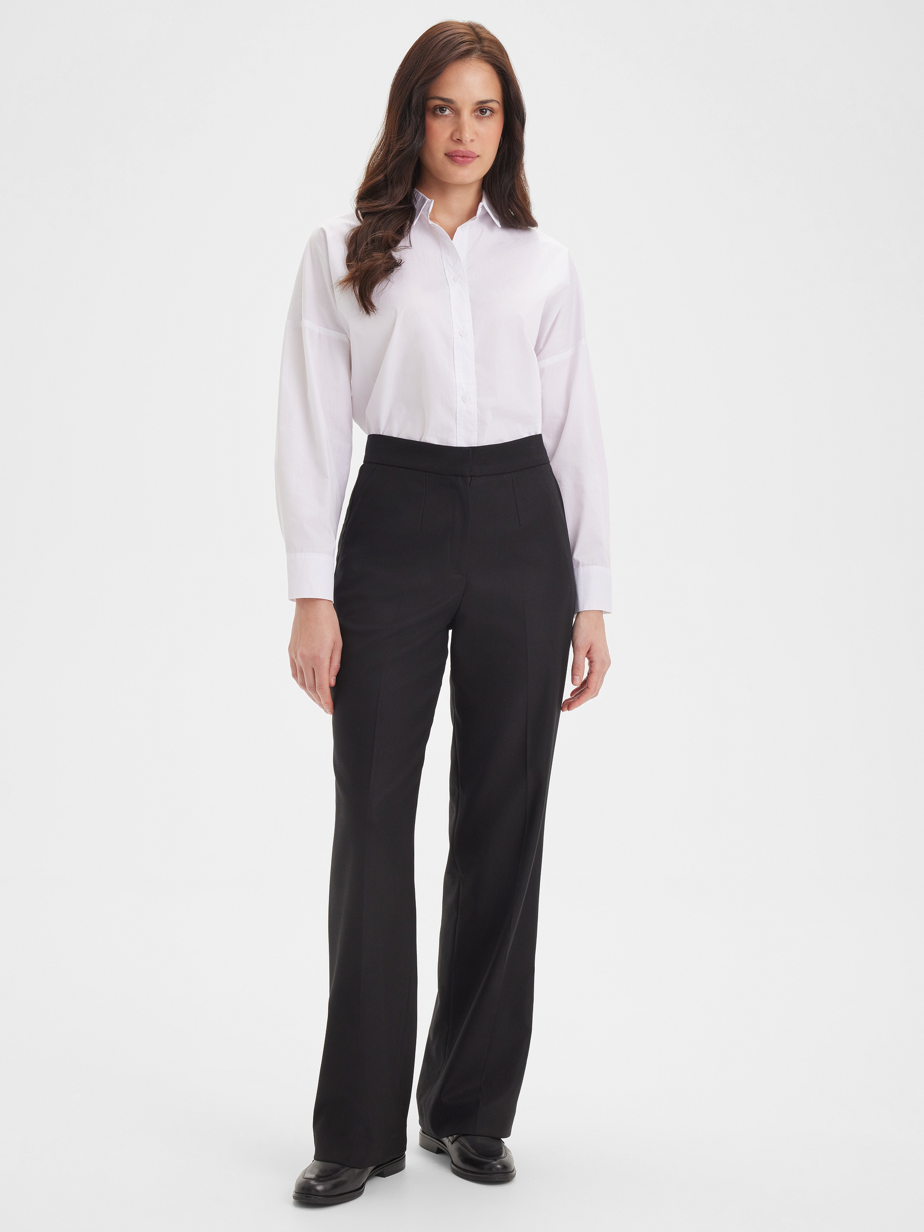 Черные брюки SINAR прямого силуэта выглядят лаконично и элегантно, подчёркивая строгий и современный стиль. Скрытый замок и прорезные карманы спереди и сзади обеспечивают аккуратную посадку и практичность, делая модель универсальной для офисных и повседневных образов.