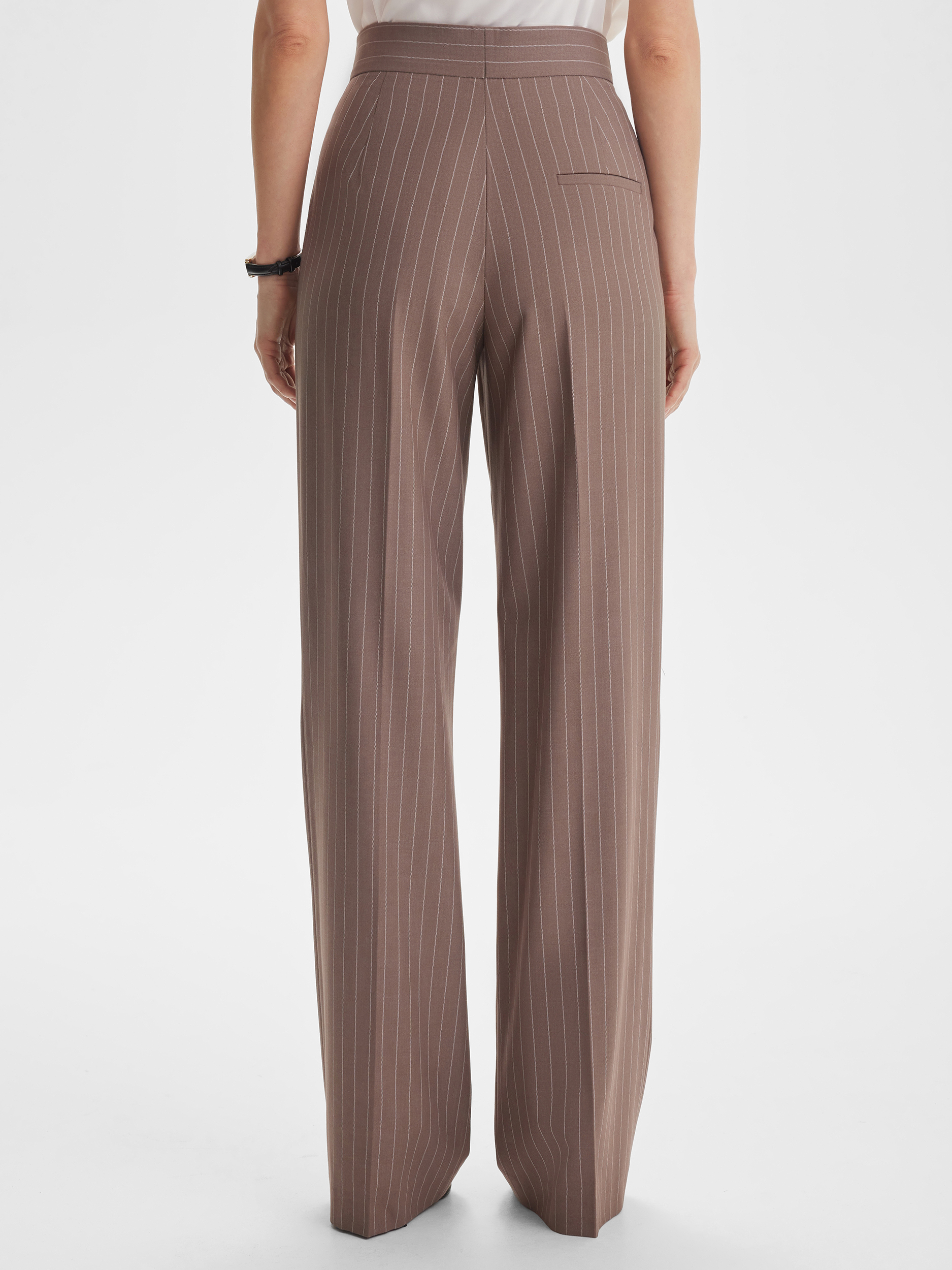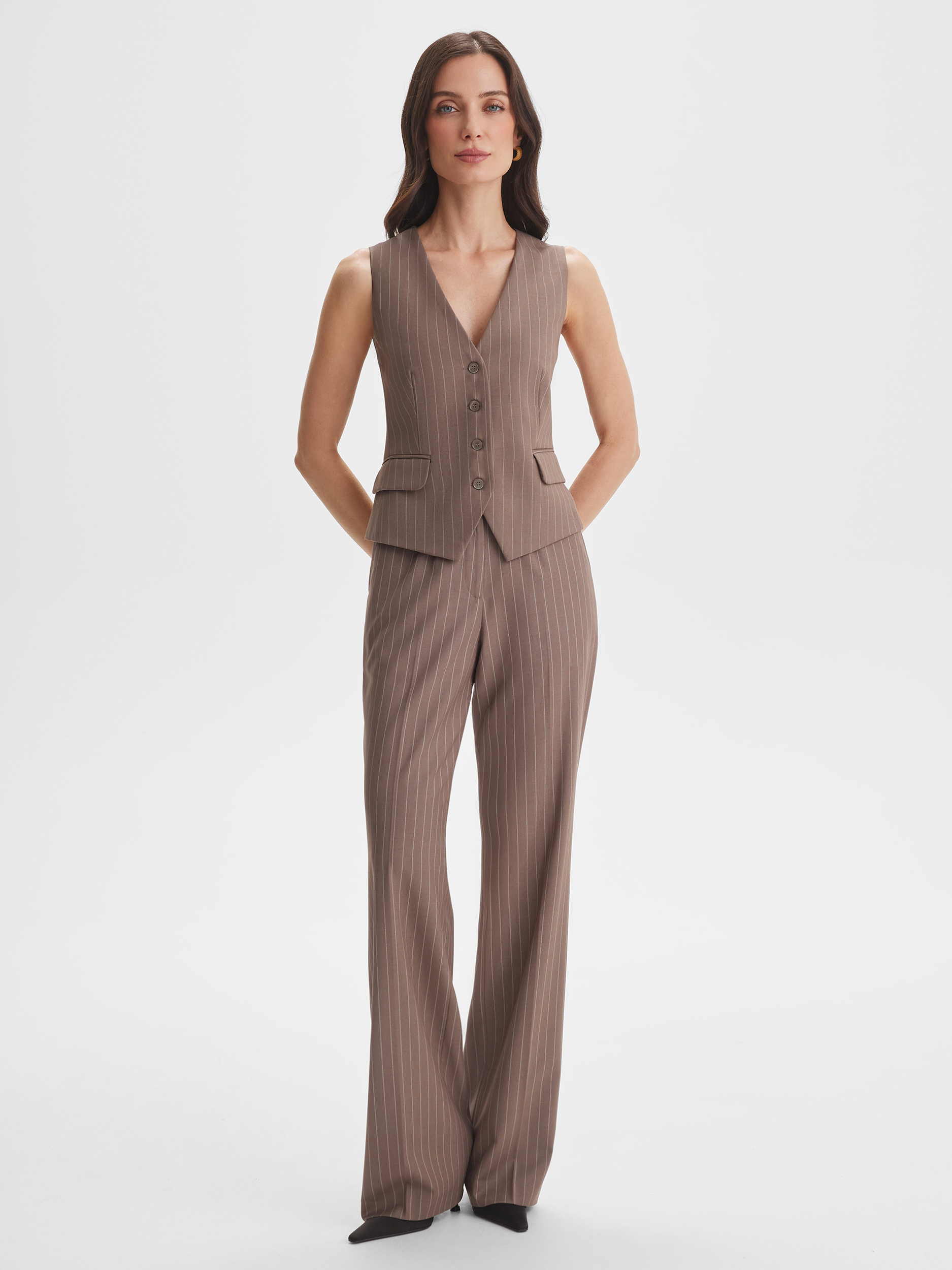 Брюки SINAR прямого силуэта выполнены в трендовом оттенке какао с деликатной полоской, создающей современный и выразительный силуэт. Модель мягко подчёркивает фигуру и придаёт образу элегантность и уверенность. В коллекции также представлены брюки-палацо, жакет и костюмный жилет из той же ткани, что позволяет собрать полный стильный костюм-тройку.