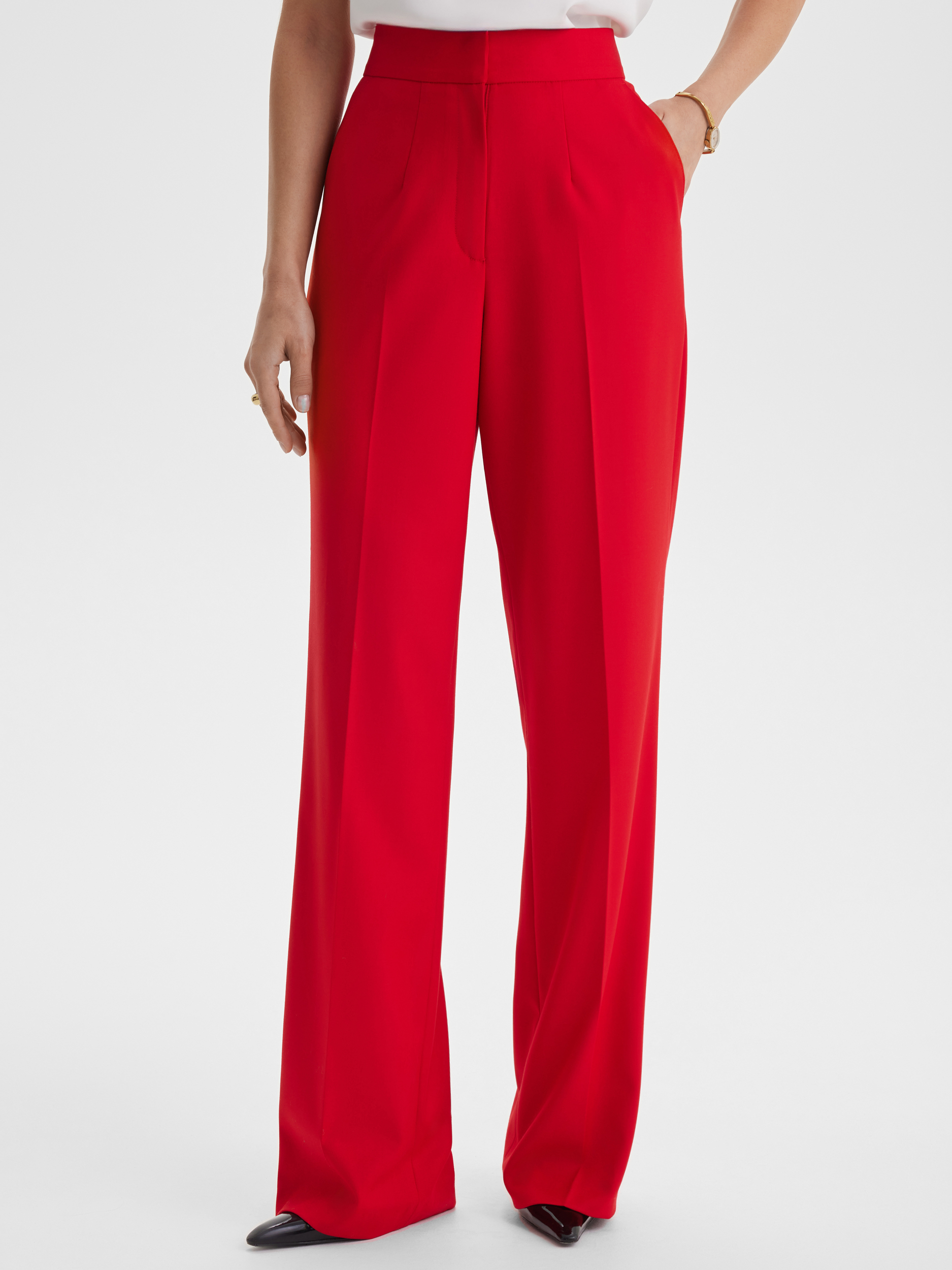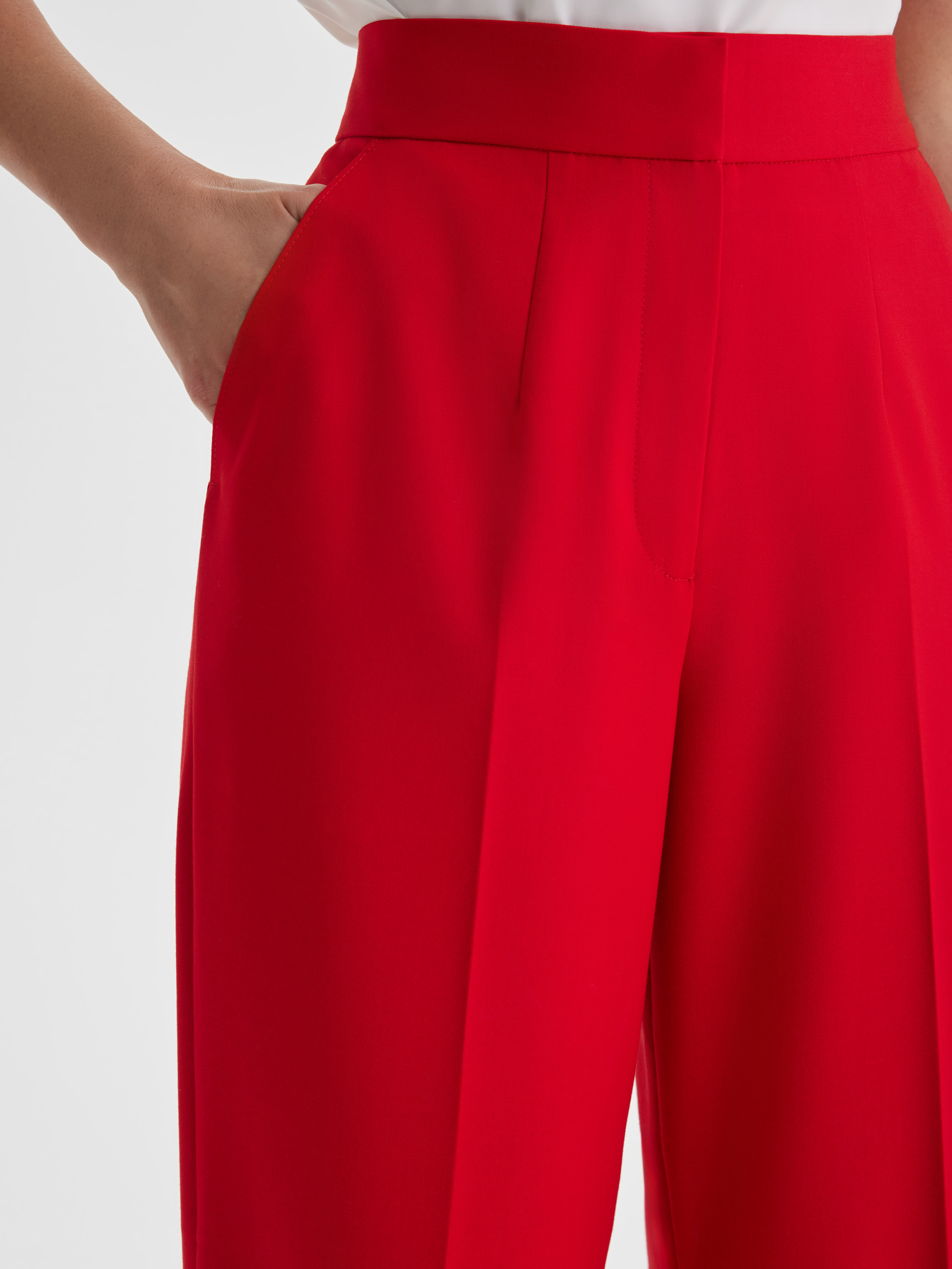Прямые брюки из красной ткани подчёркивают стройность и изящество силуэта, создавая элегантный и уверенный образ. Яркий, тщательно подобранный оттенок делает модель эффектной и заметной, подходящей для любых важных событий. Для завершённого образа к брюкам идеально подойдёт жакет из той же ткани.