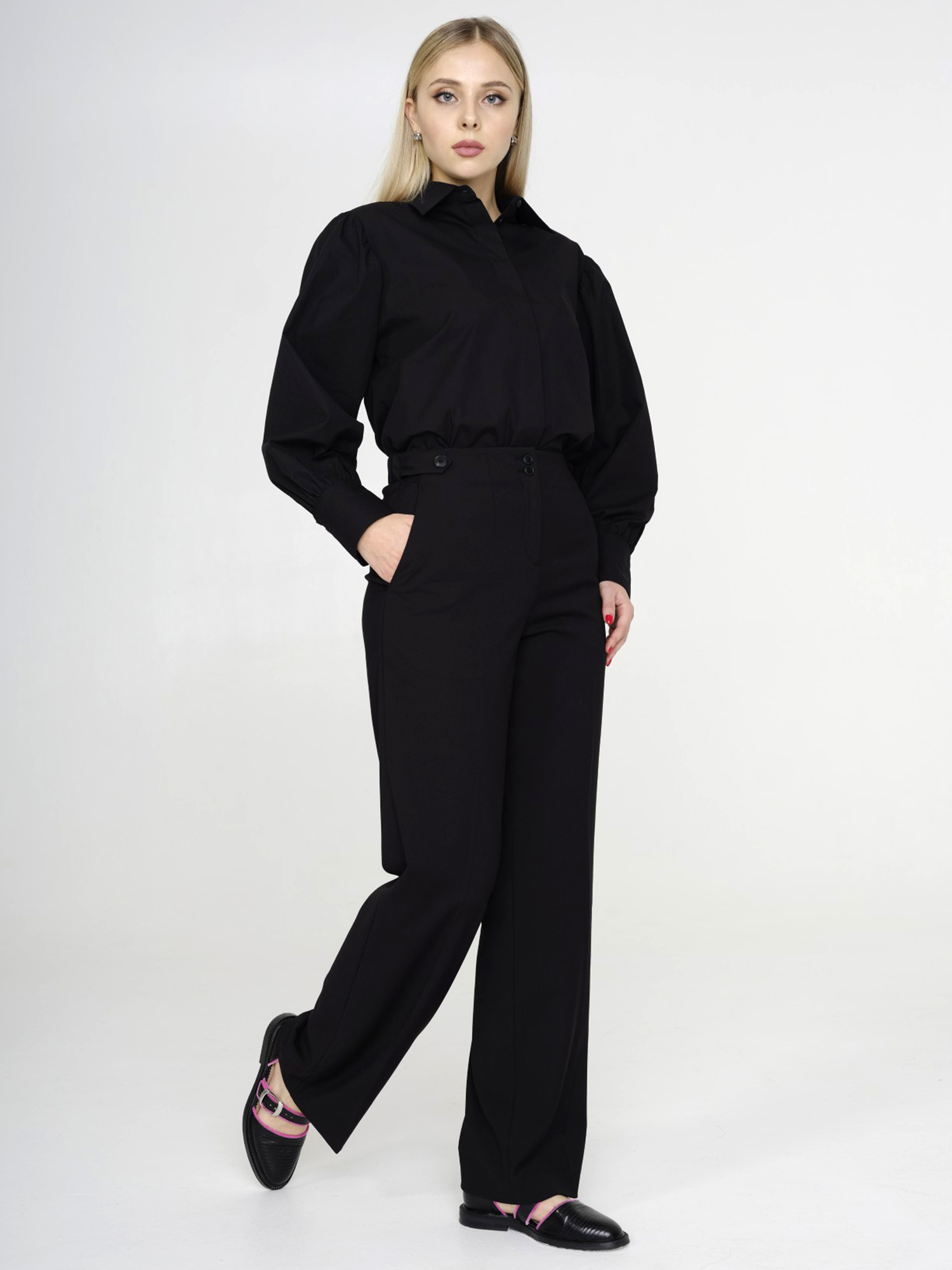 Классические черные брюки SINAR прямого силуэта выглядят сдержанно и элегантно, подчёркивая строгий силуэт. Две пуговицы на застёжке и боковой регулятор с пуговицей заменяют ремень и позволяют легко корректировать посадку по фигуре, делая модель универсальной для офисного гардероба и деловых образов.