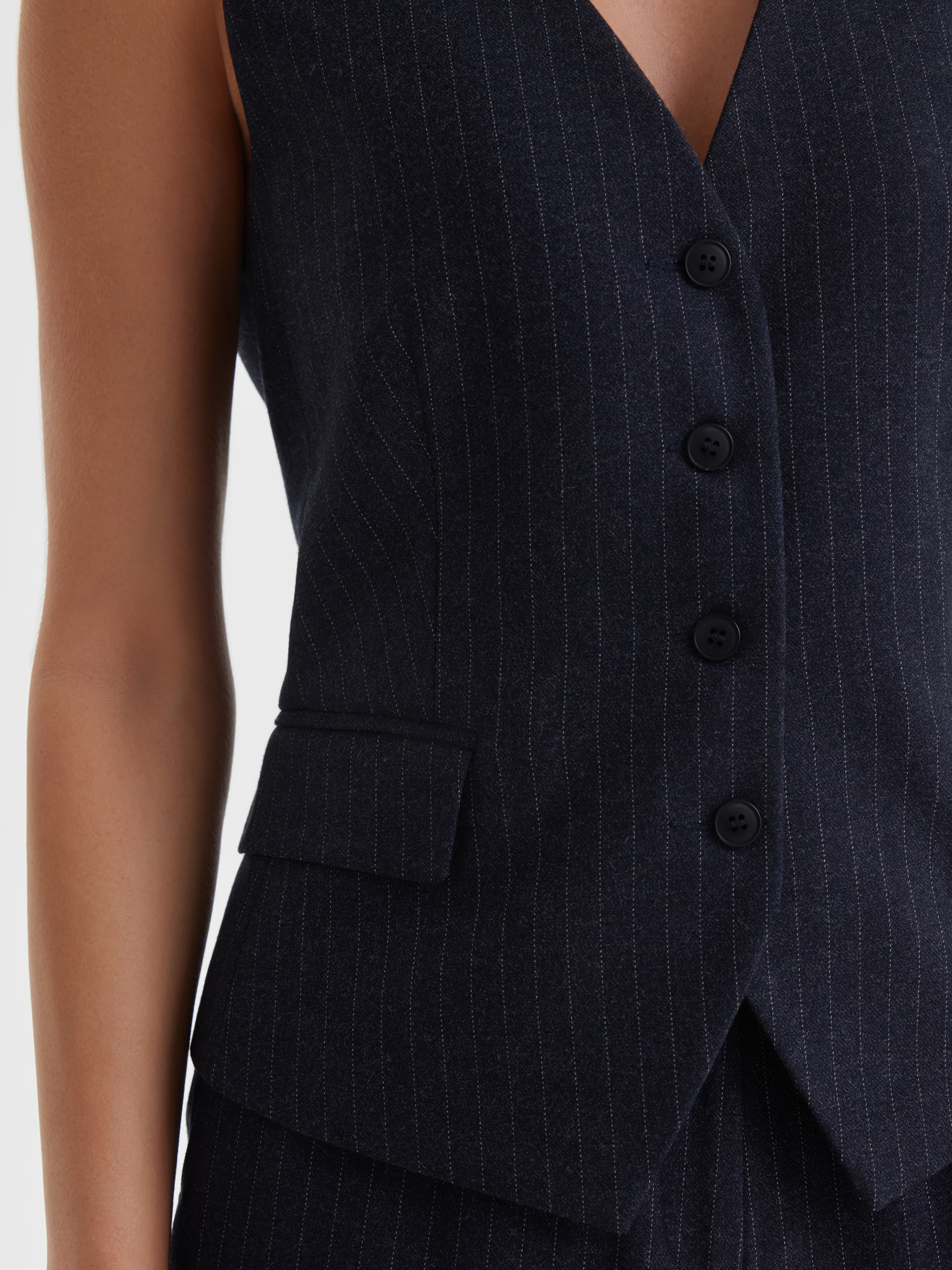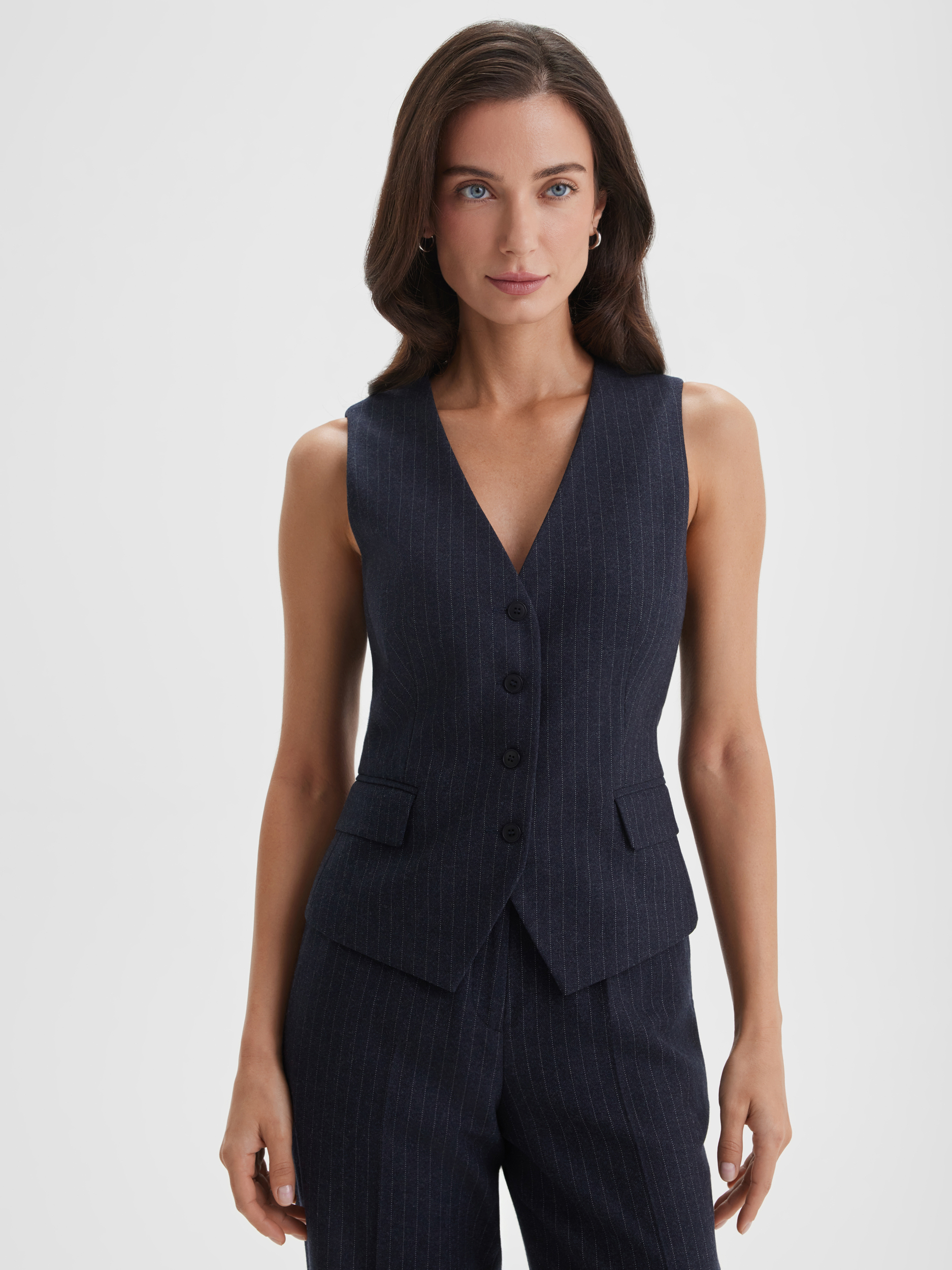 Жилет в классическую полоску станет изысканным дополнением к образу. Прямой крой и лаконичный дизайн подчеркивают элегантность. Жилет можно носить как самостоятельно, комбинируя с брюками или юбками, так и в составе костюма-тройки с жакетом и брюками.